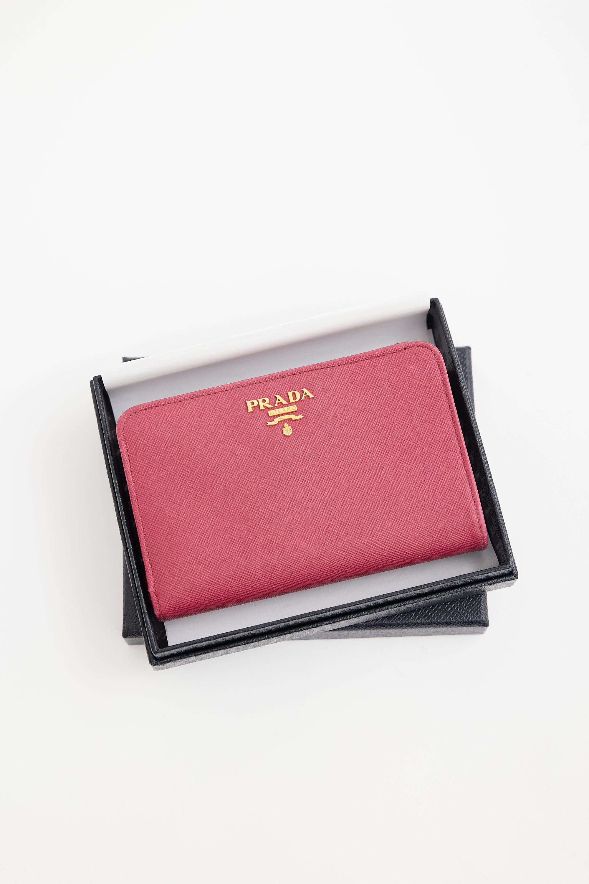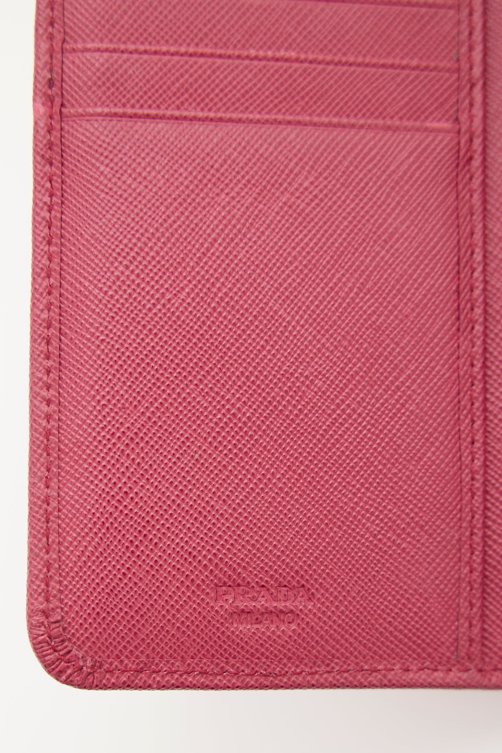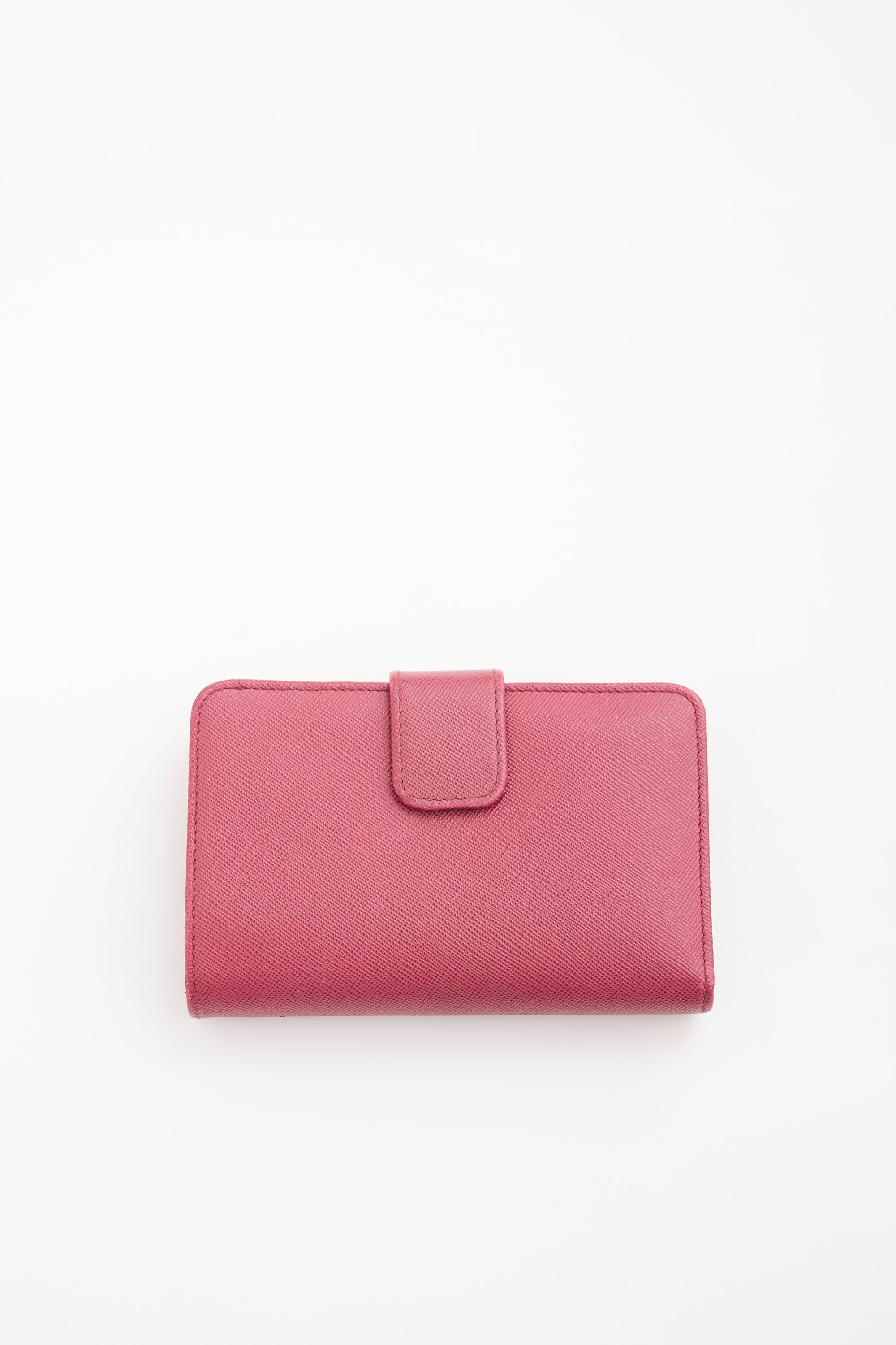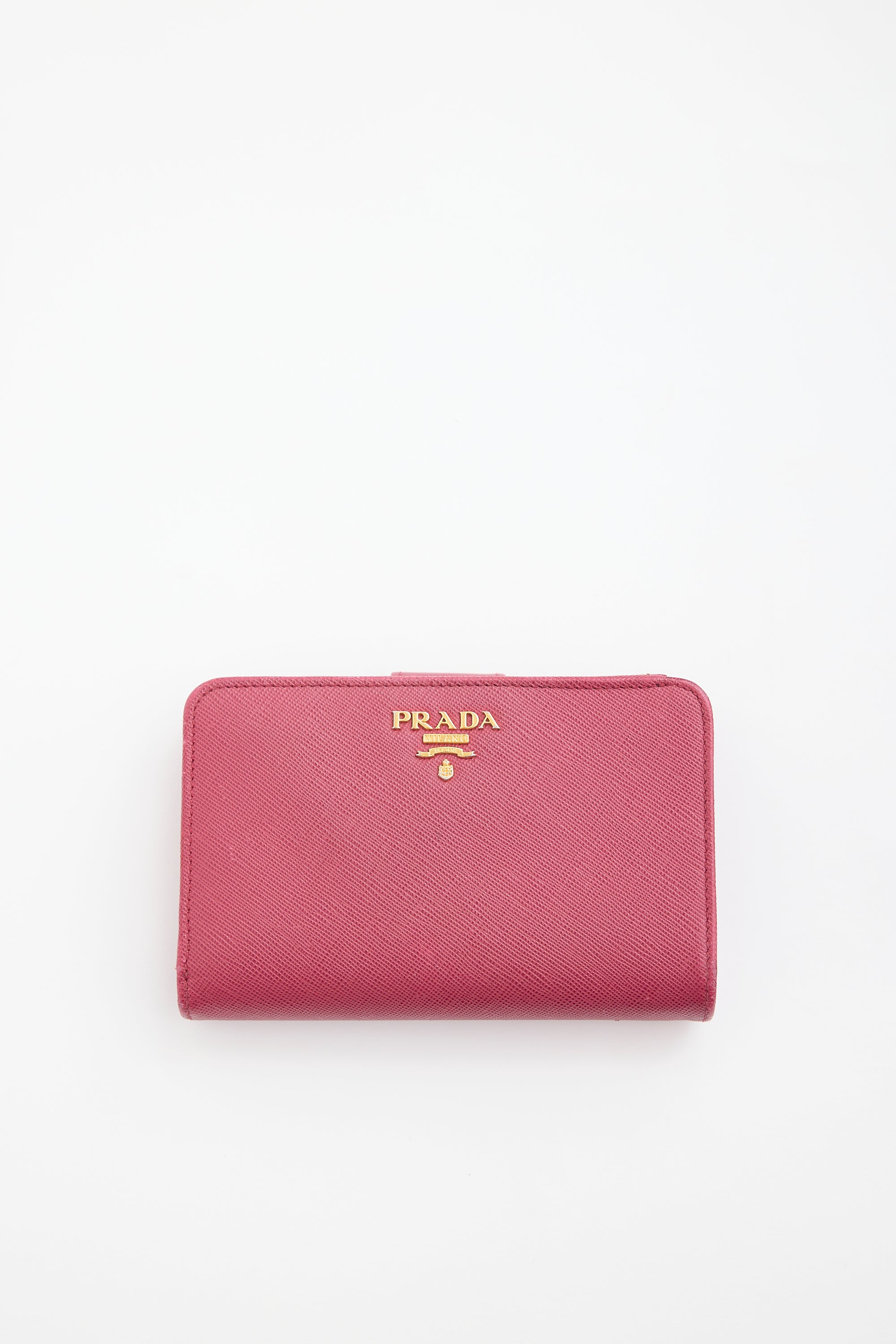 Pre-owned Prada fuchsia Saffiano leather bifold wallet featuring gold tone hardware, front logo embellishment, one zipped compartment with divider, snap button closure, and lined interior with one bill slot, two slip pockets, and ten card slots. Comes with original box and certificate of authenticity cards.