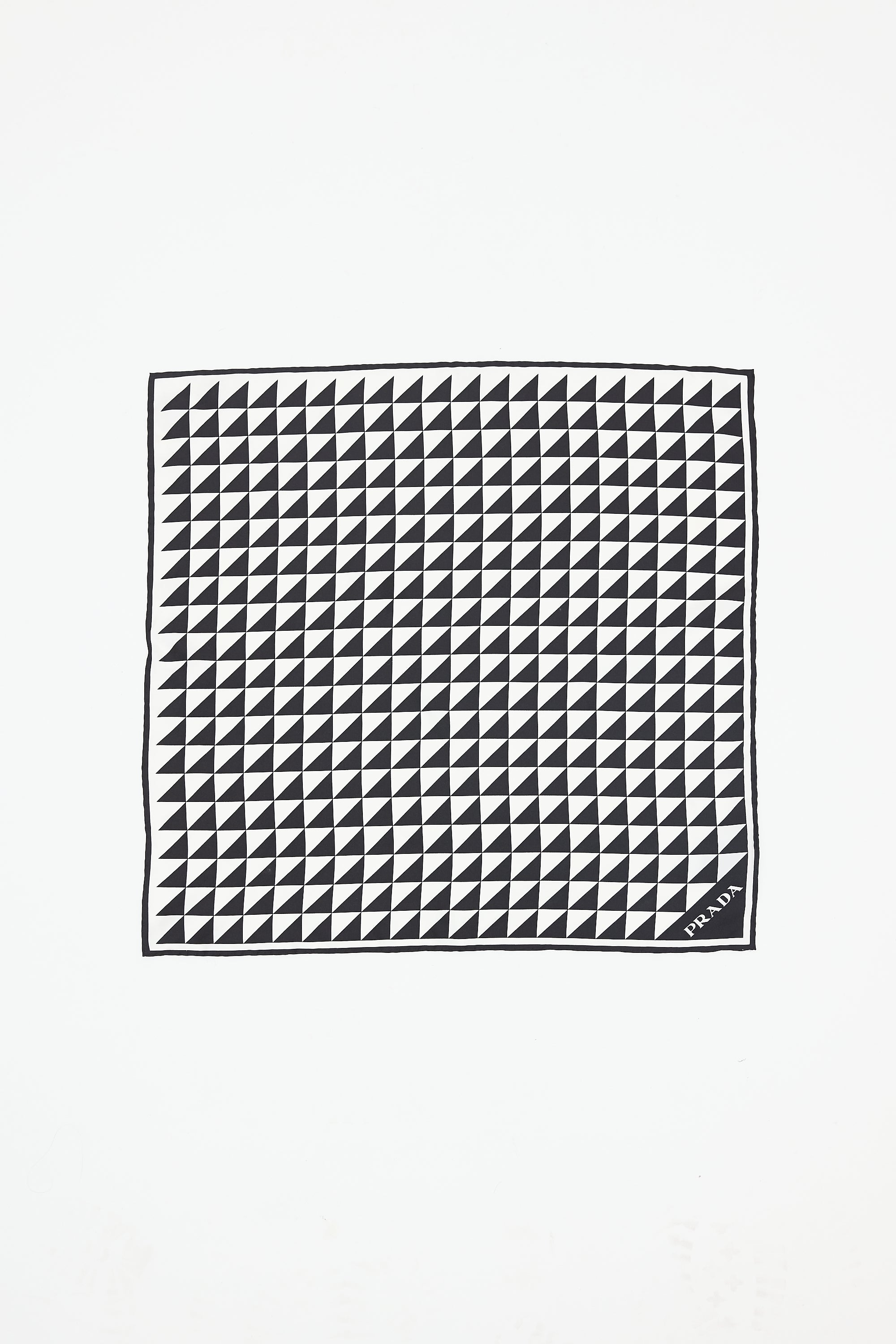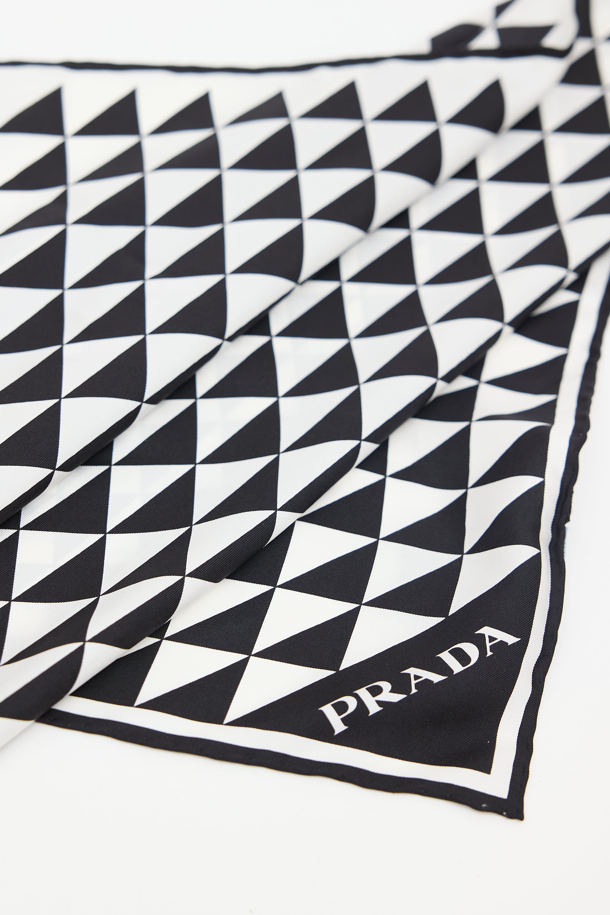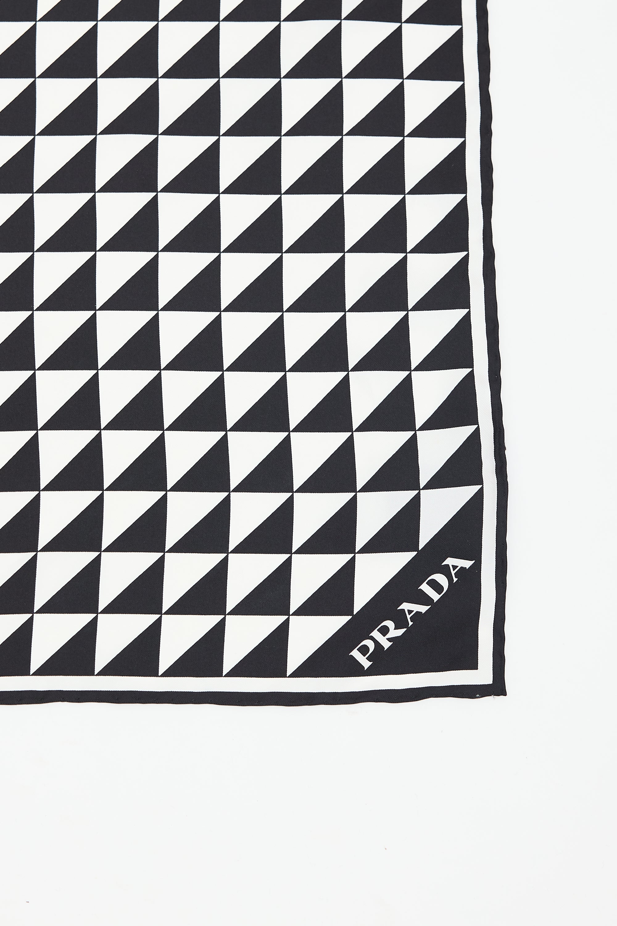 Pre-owned Prada black and white silk square scarf featuring geometric print, wordmark logo at bottom right corner, and hand rolled edges.