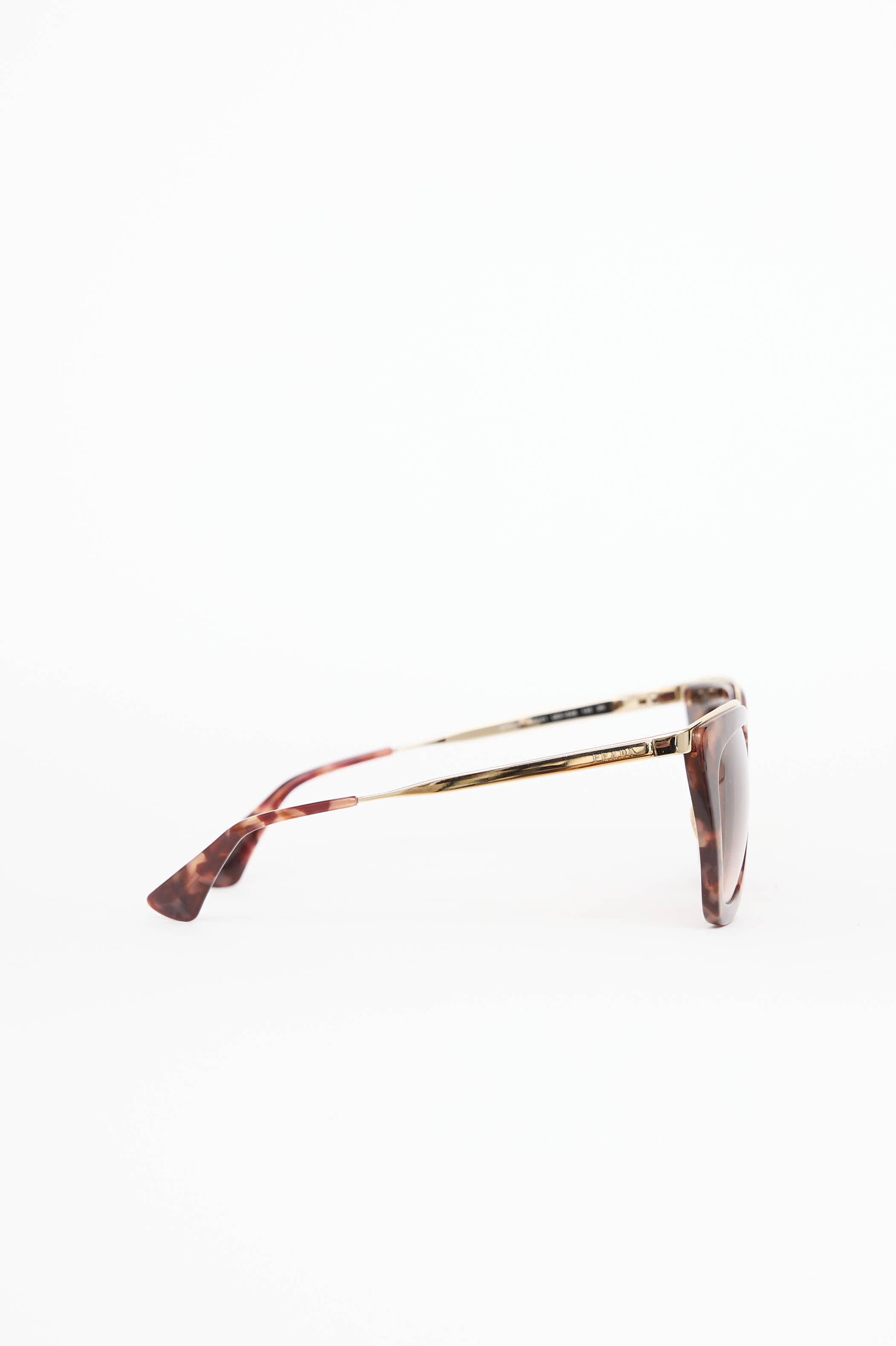 Pre-owned Prada pink and gold Catwalk sunglasses featuring brown gradient lenses, tortoise square lenses, nose pads with a gold tone wire bridge, wire arms, and engraved logo at temples.