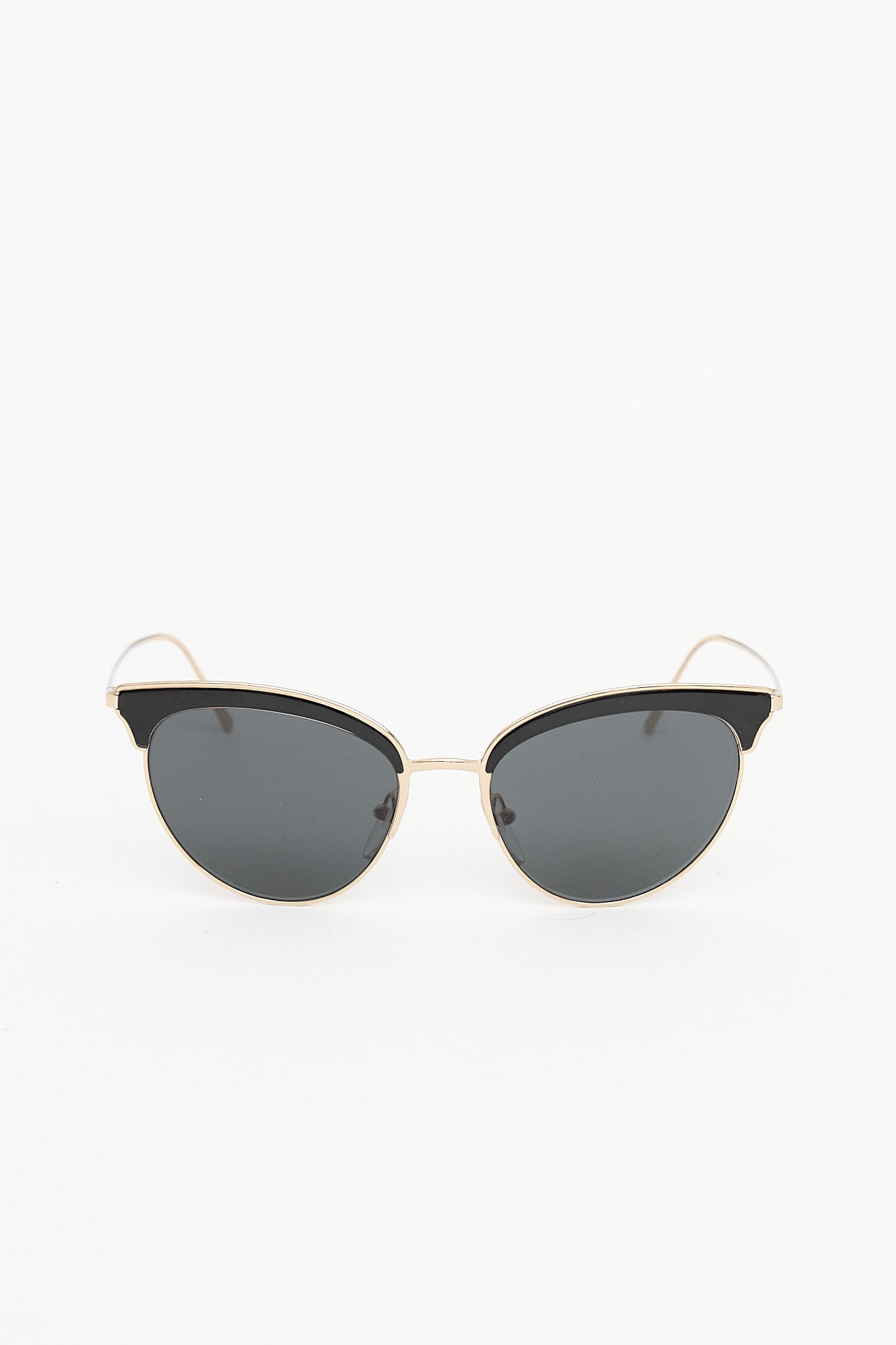 Pre-owned Prada black and gold SPR60V sunglasses featuring black tinted lenses, cat eye wired frames, nose pads, and wire arms.