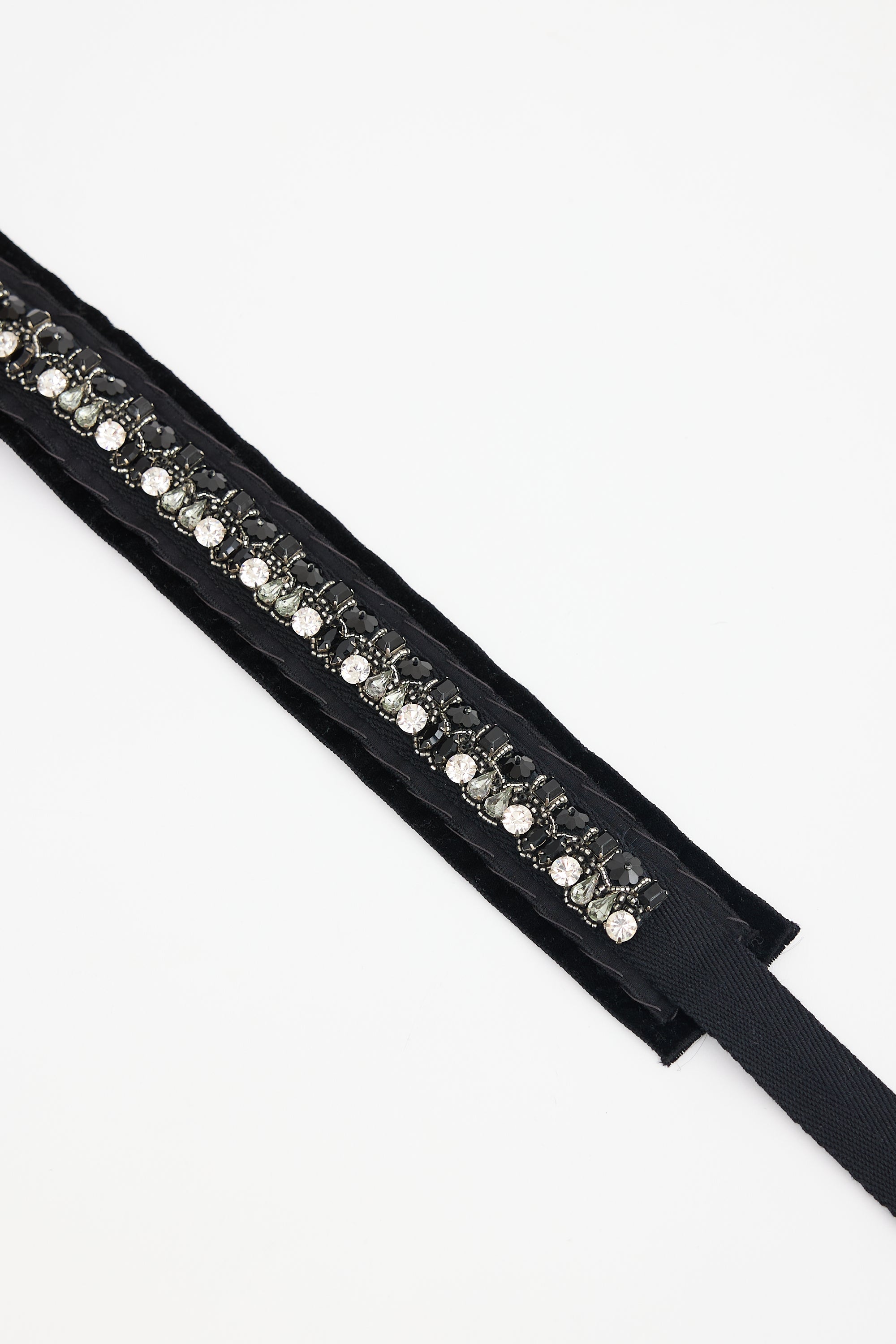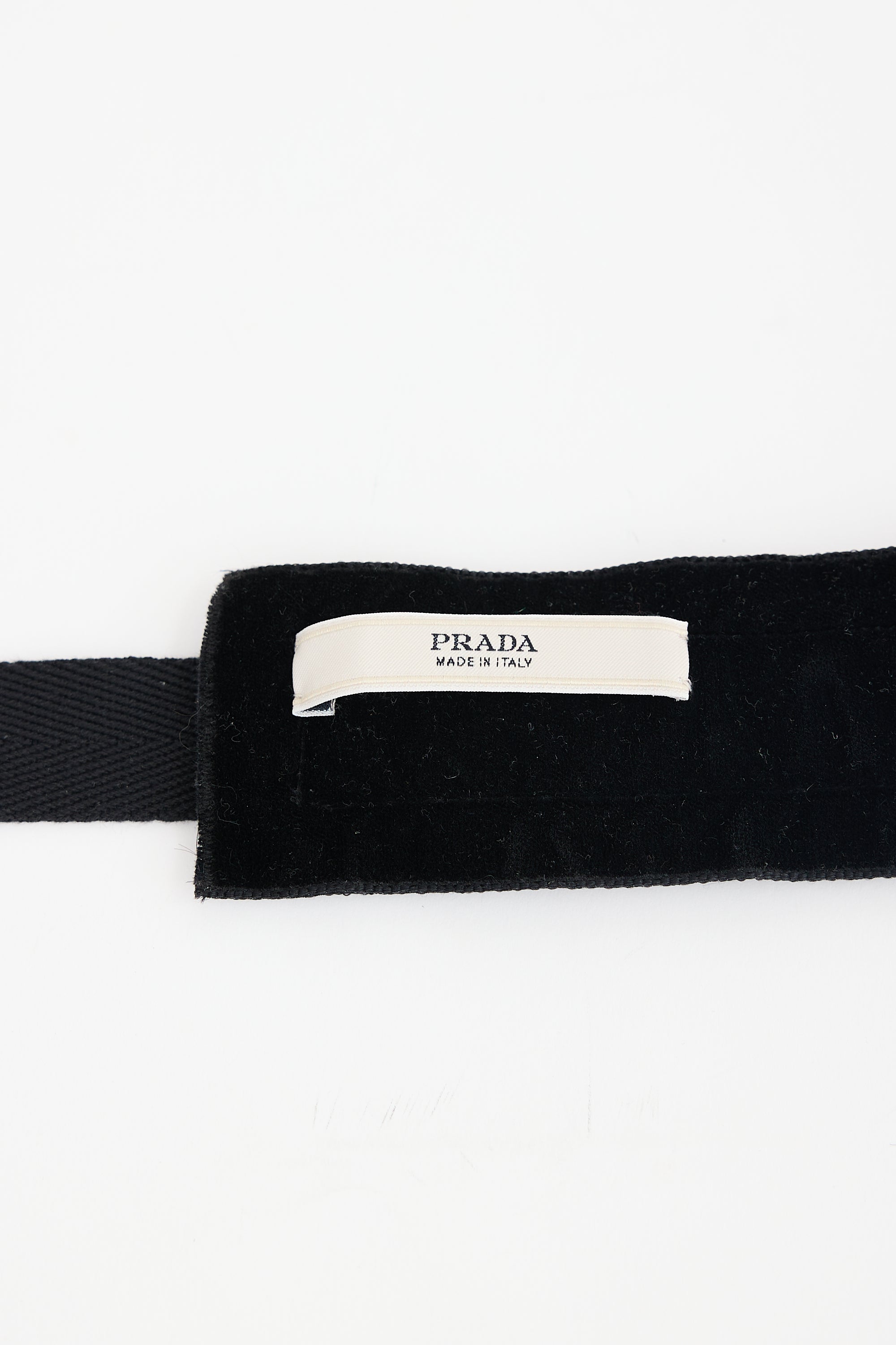 Pre-owned Prada black belt featuring webbed strap, velvet panel with multicolour crystal embellishment, and tie closure. Comes with original box and extra embellishments.
