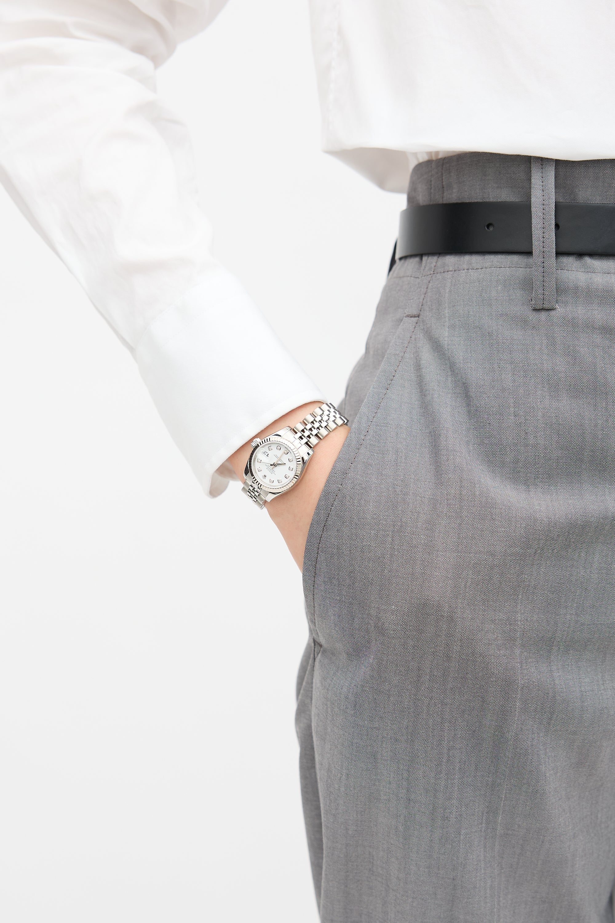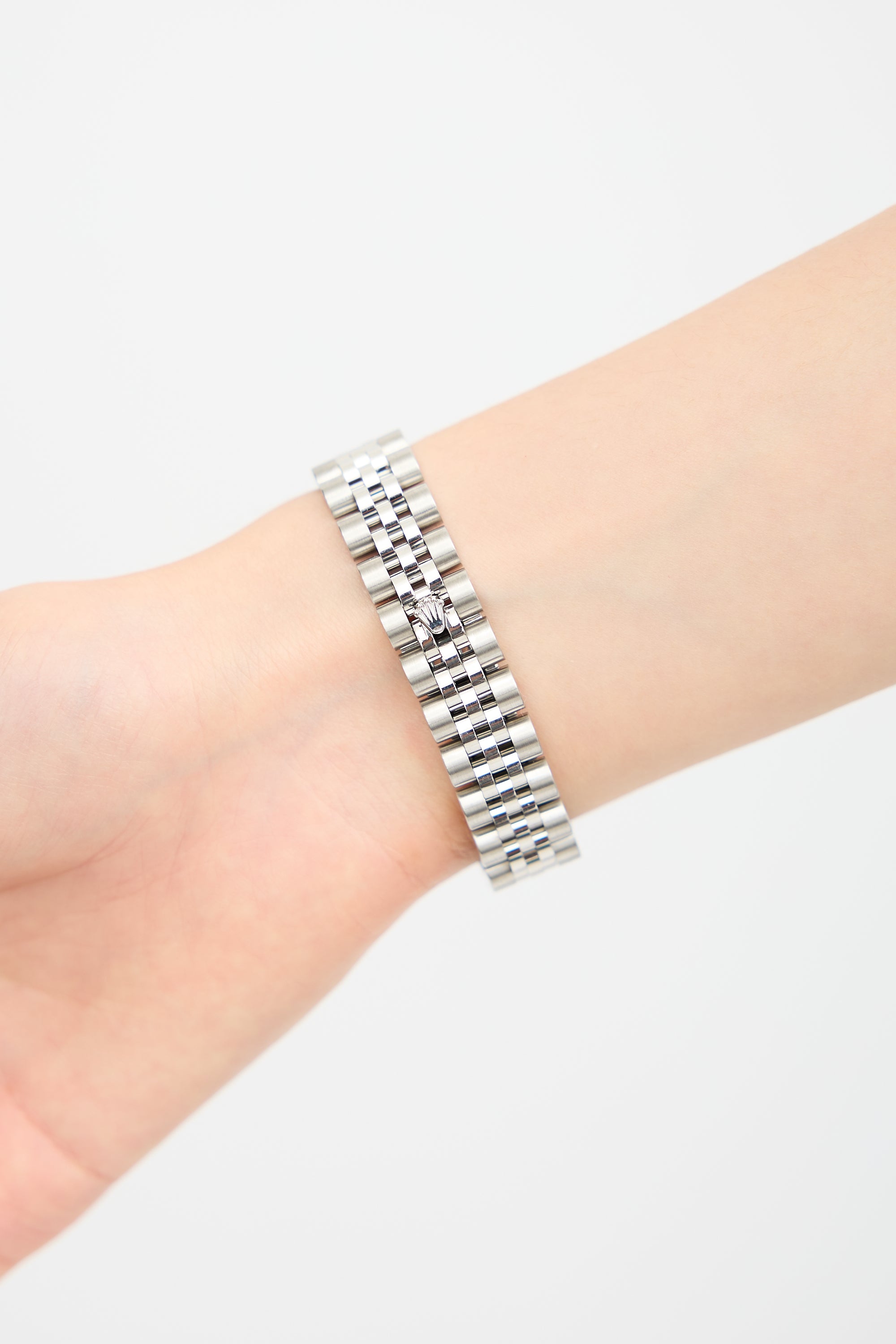 Pre-owned Rolex Oyster Perpetual Lady Datejust 26mm watch featuring an Oystersteel and white gold case, fluted bezel, white lacquer dial with diamond markers, sapphire crystal face with cyclops date magnifier, and an Oystersteel and white gold Jubilee five piece link bracelet with hidden Crownclasp. Comes with original case, pouch, three extra band links, and service card.