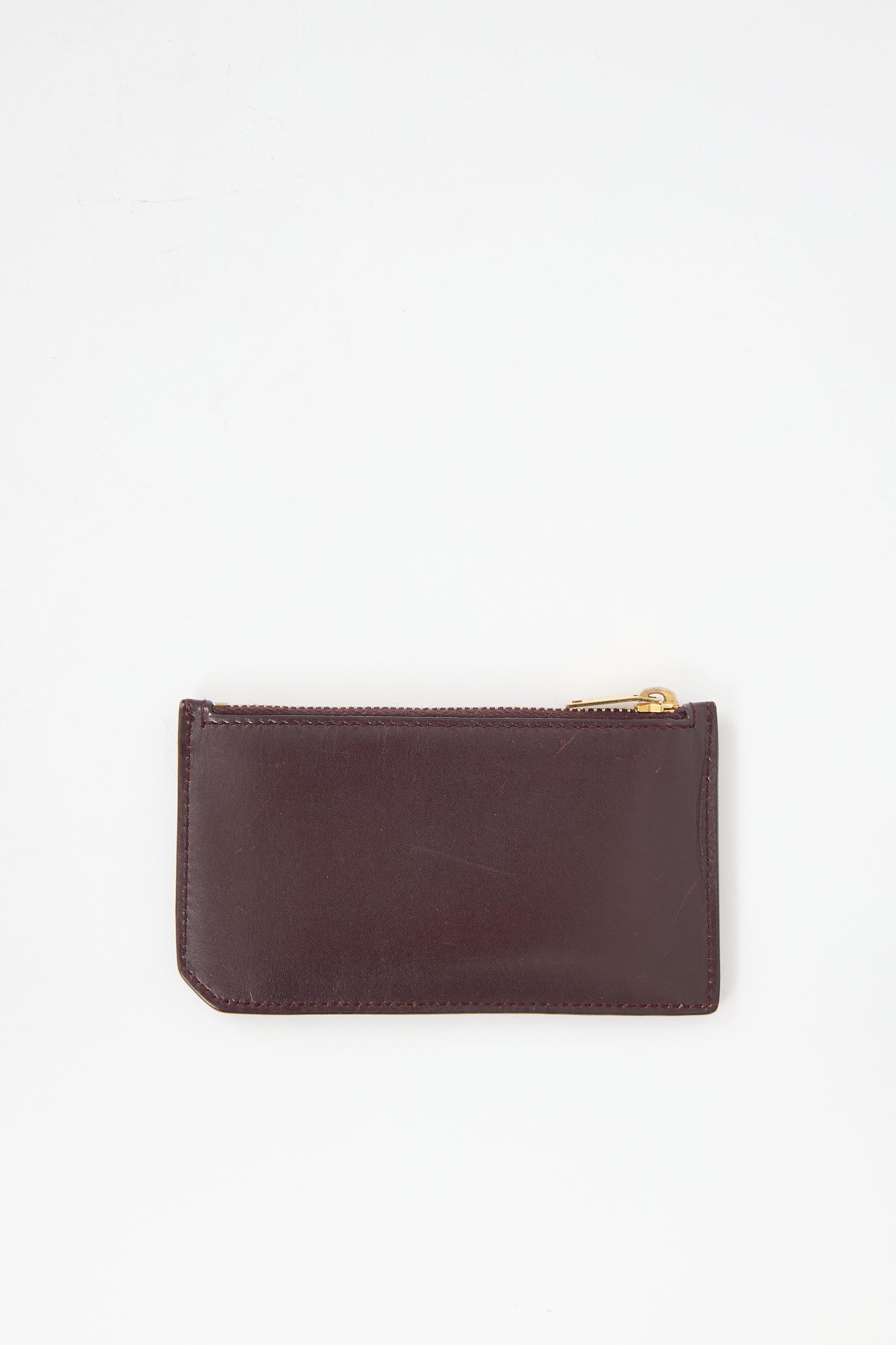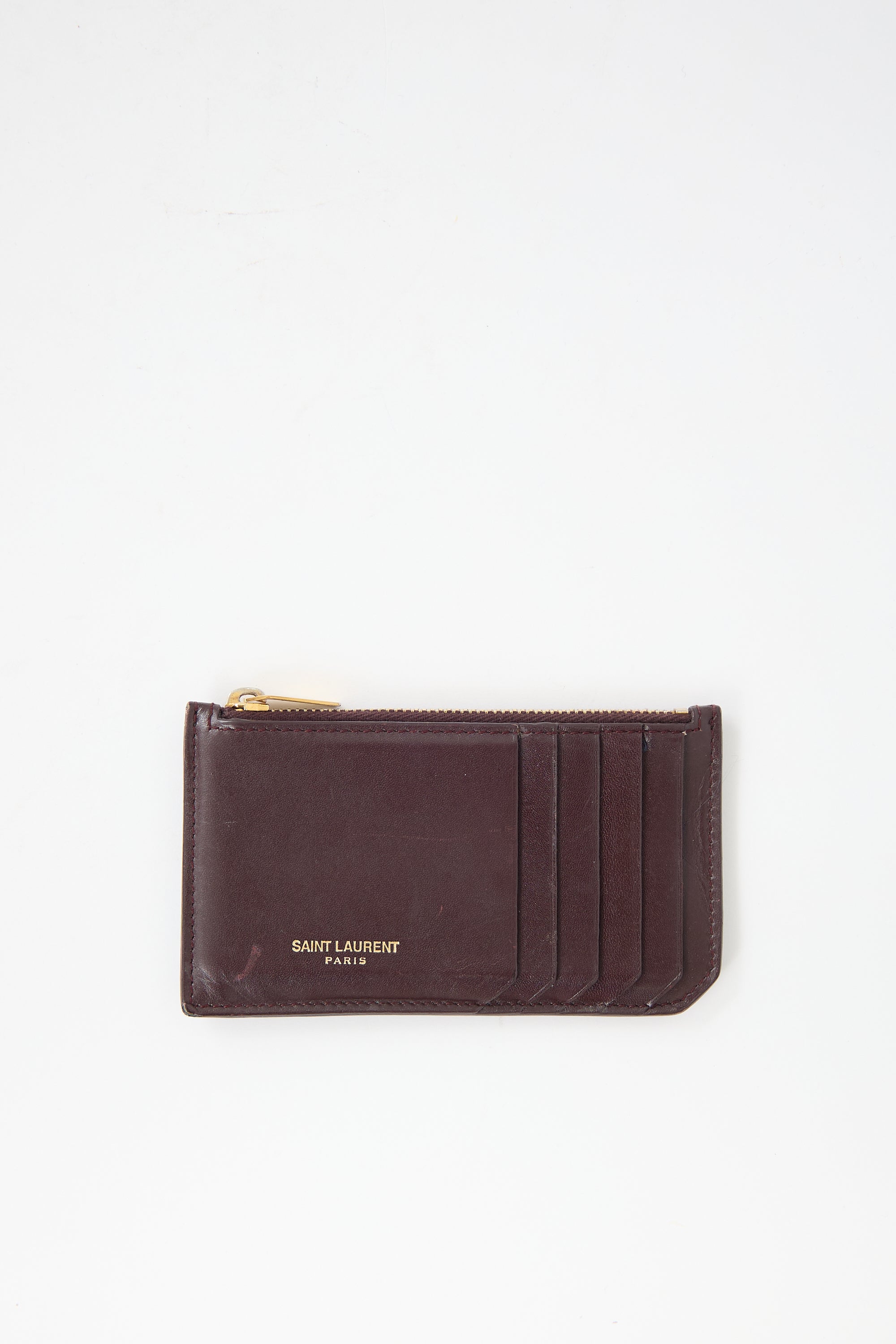 Pre-owned Saint Laurent brown brushed leather Fragment card holder featuring gold tone hardware, stamped logo at front, five exterior card slots, and one zip top compartment. Comes with original dust bag.