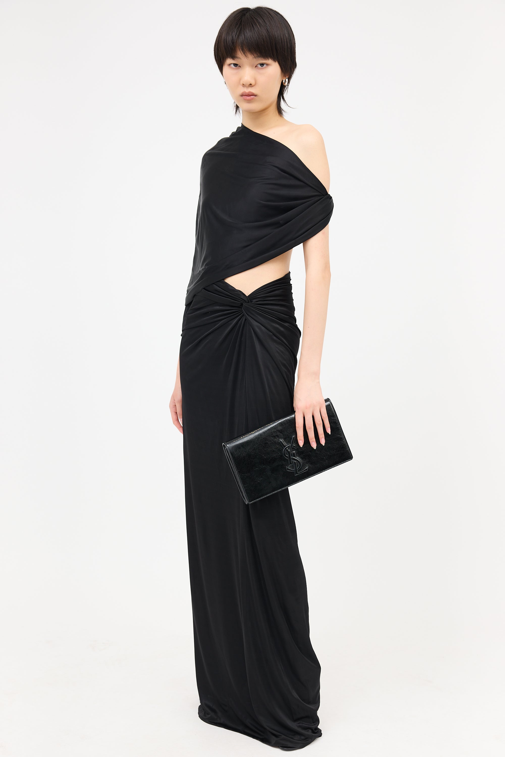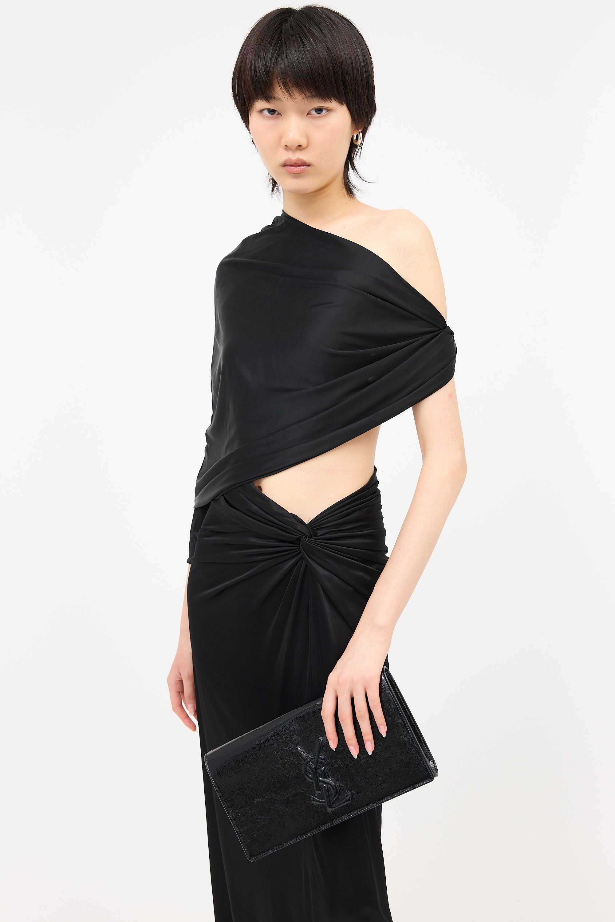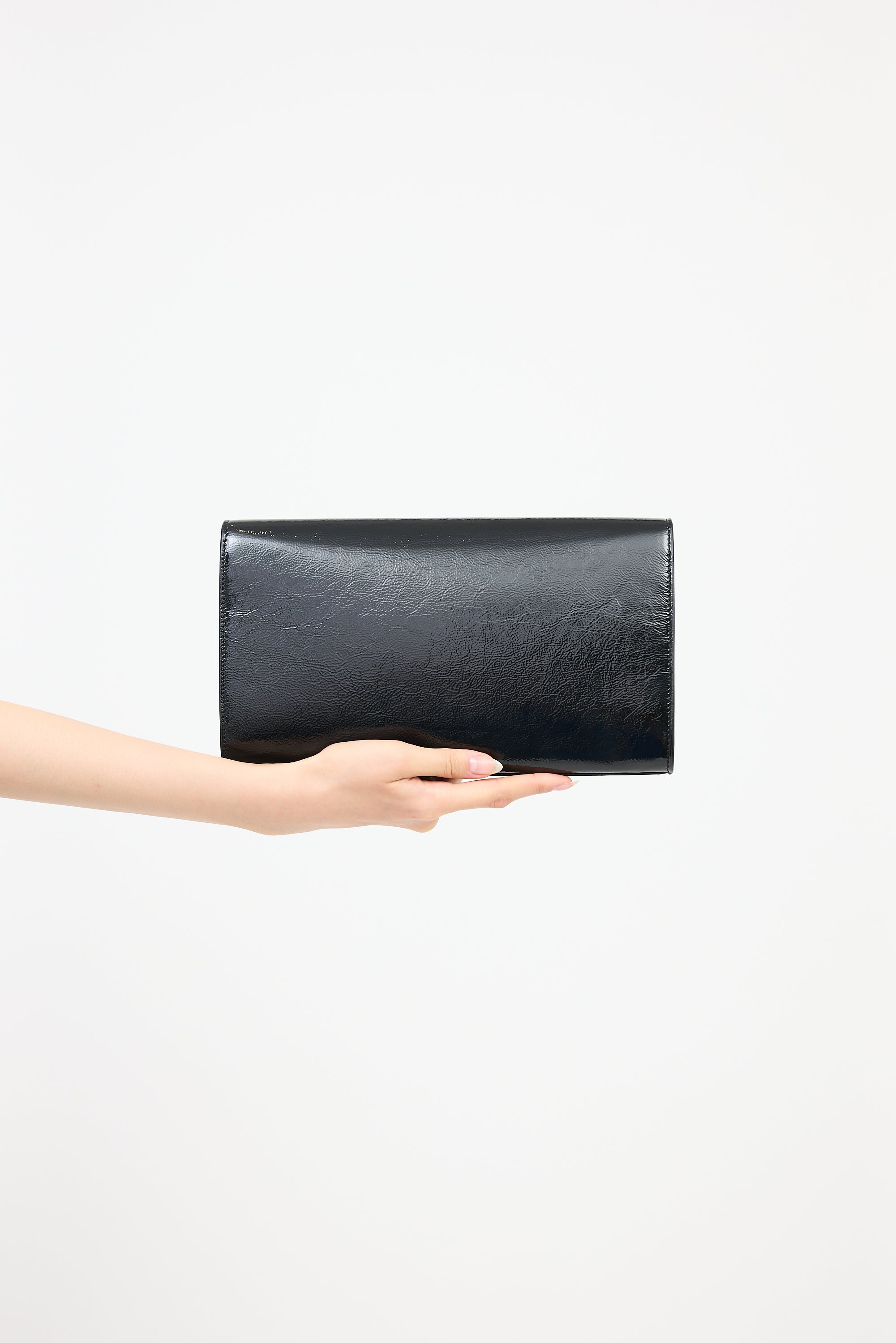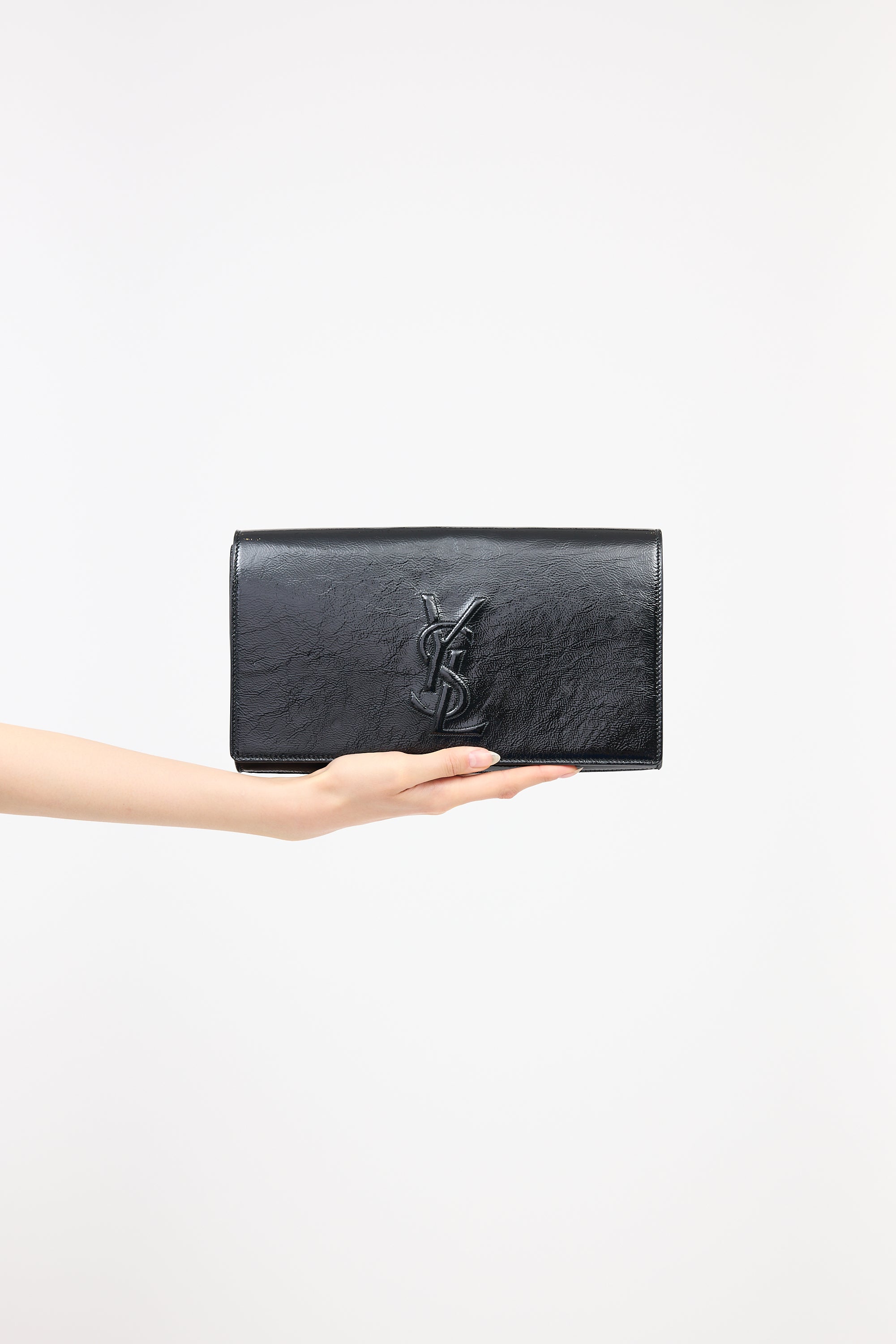 Pre-owned Saint Laurent black textured patent leather Belle de Jour clutch featuring a stitched Cassandre logo at face, magnetic top flap closure, satin lining, and one interior slip pocket. Comes with original dust bag.