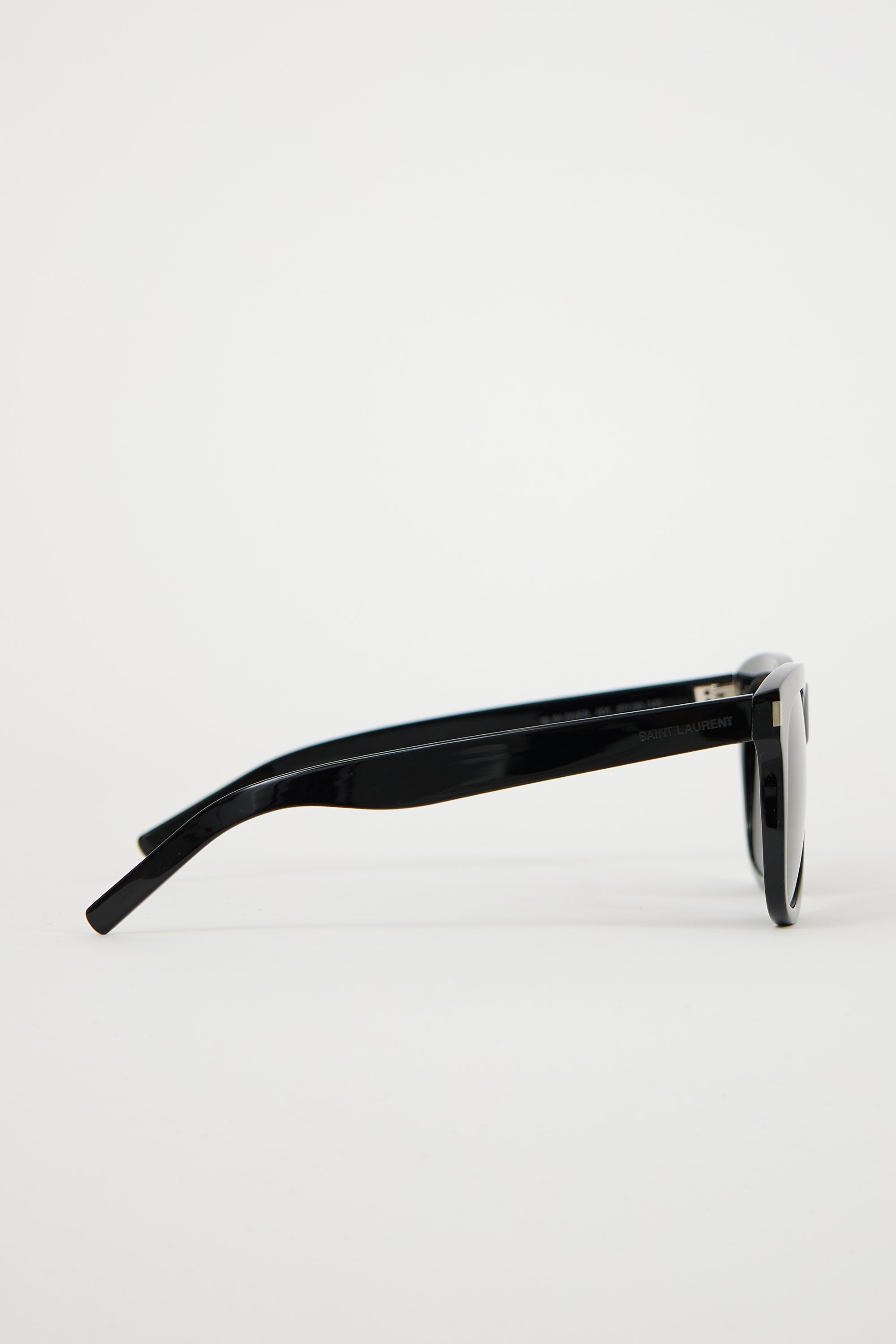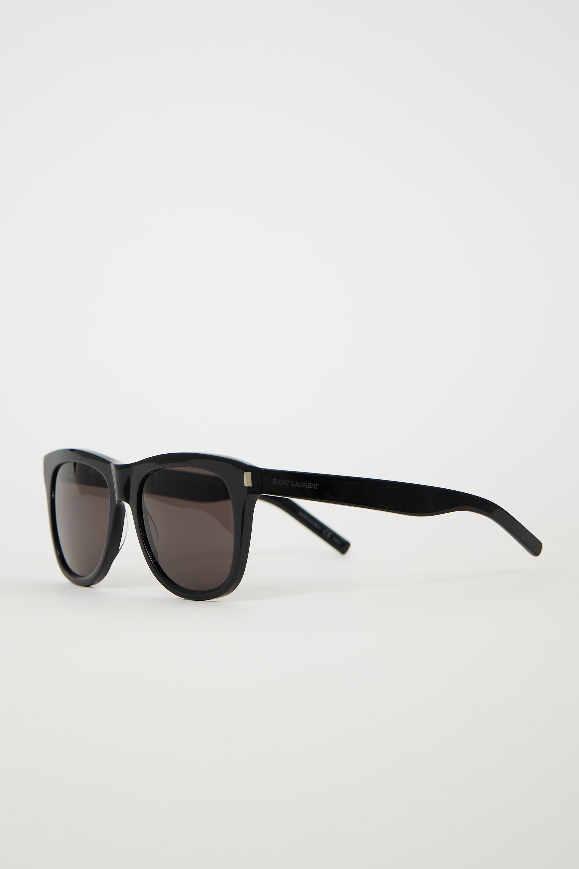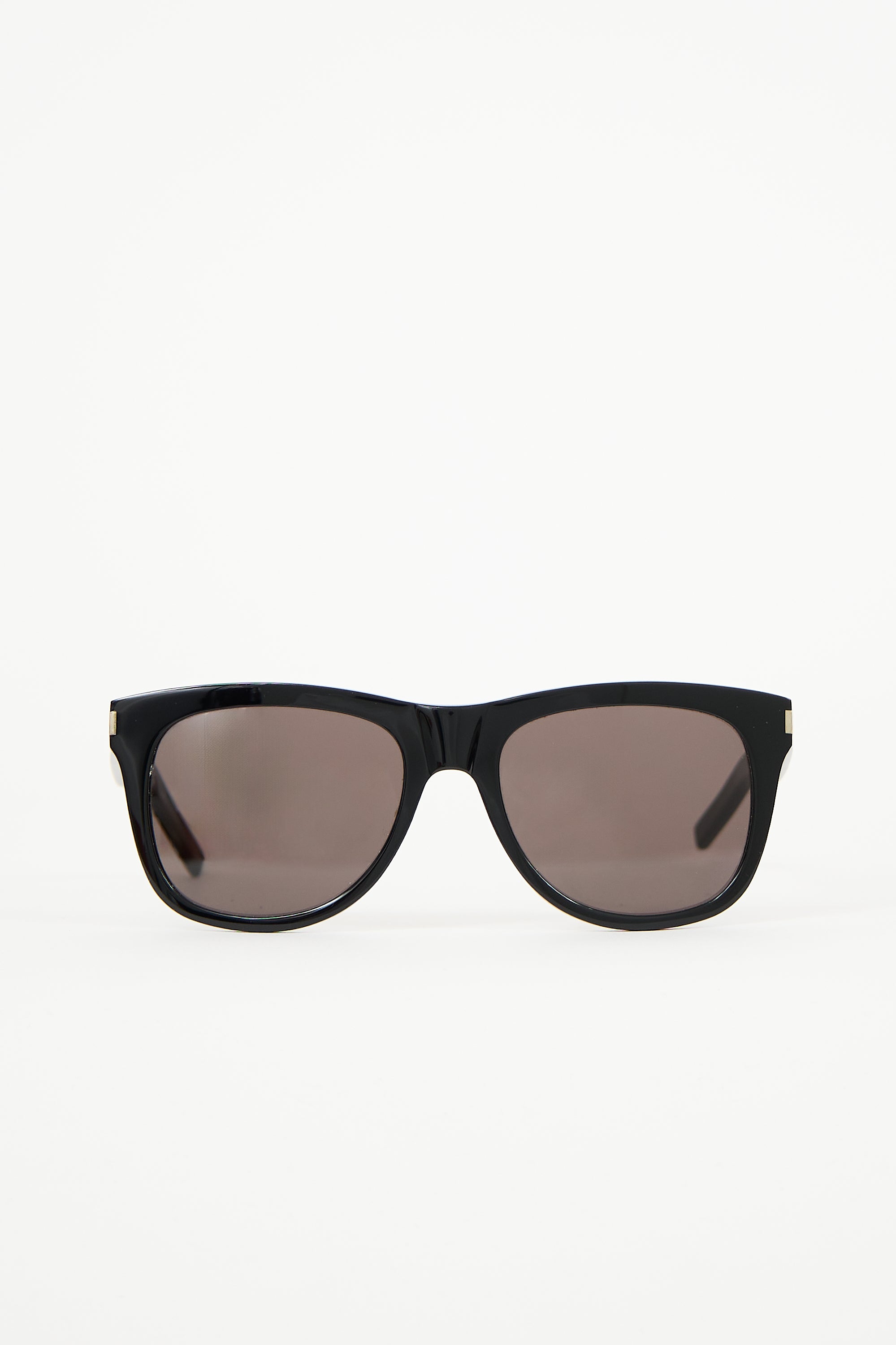 Pre-owned Saint Laurent SL51 Over sunglasses featuring grey tinted lenses, black acetate square frame, and tonal printed logo at temples. Comes with original case.