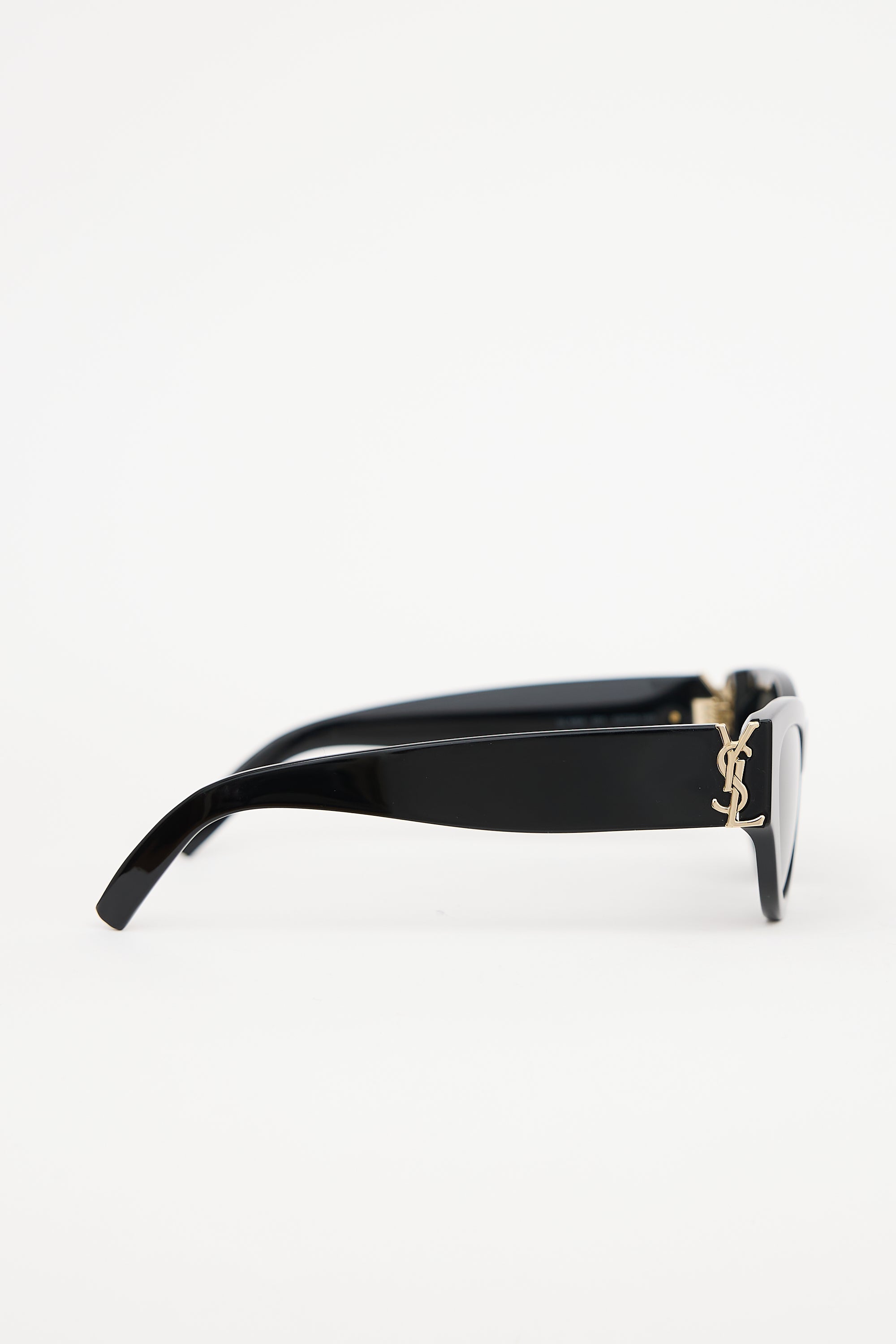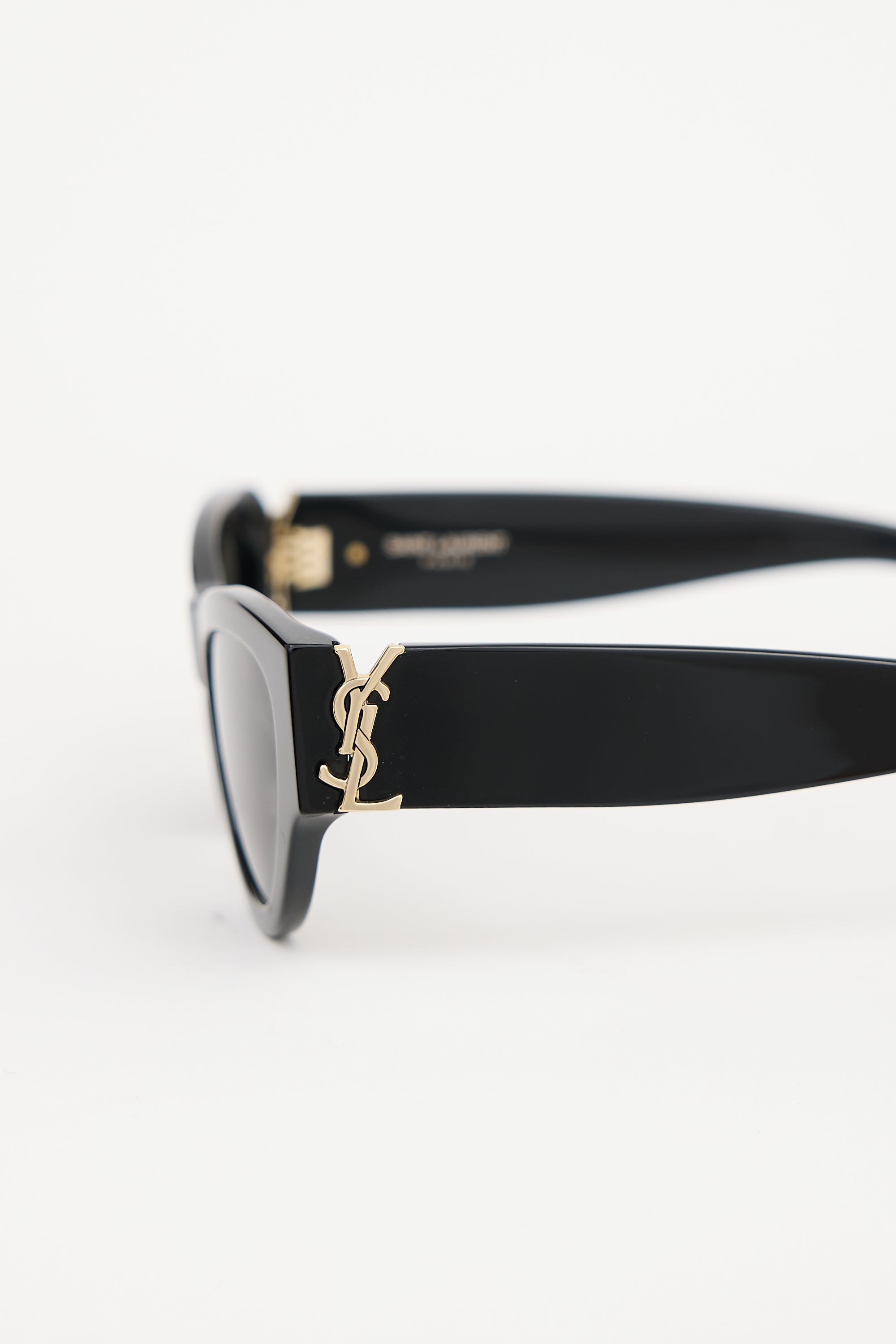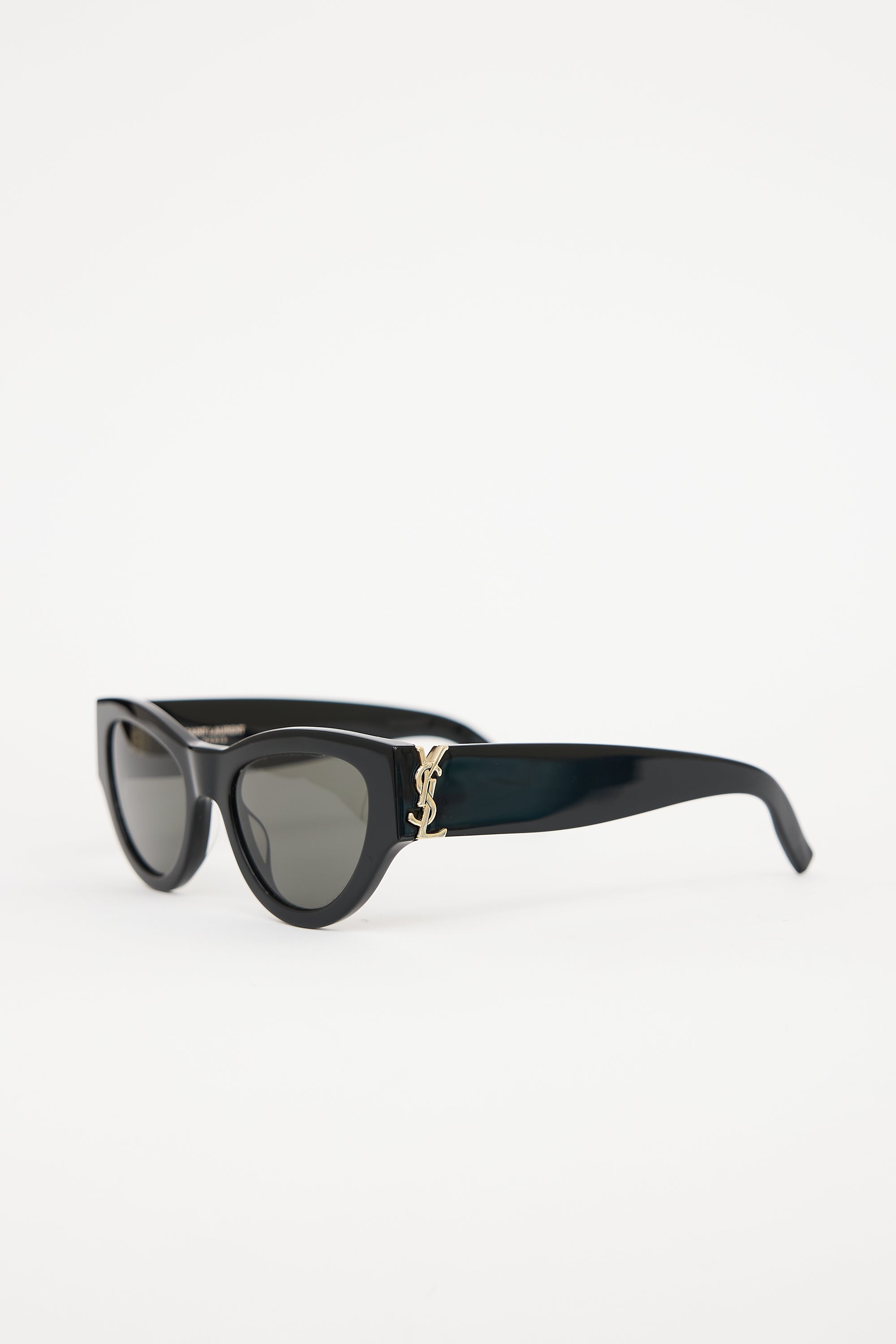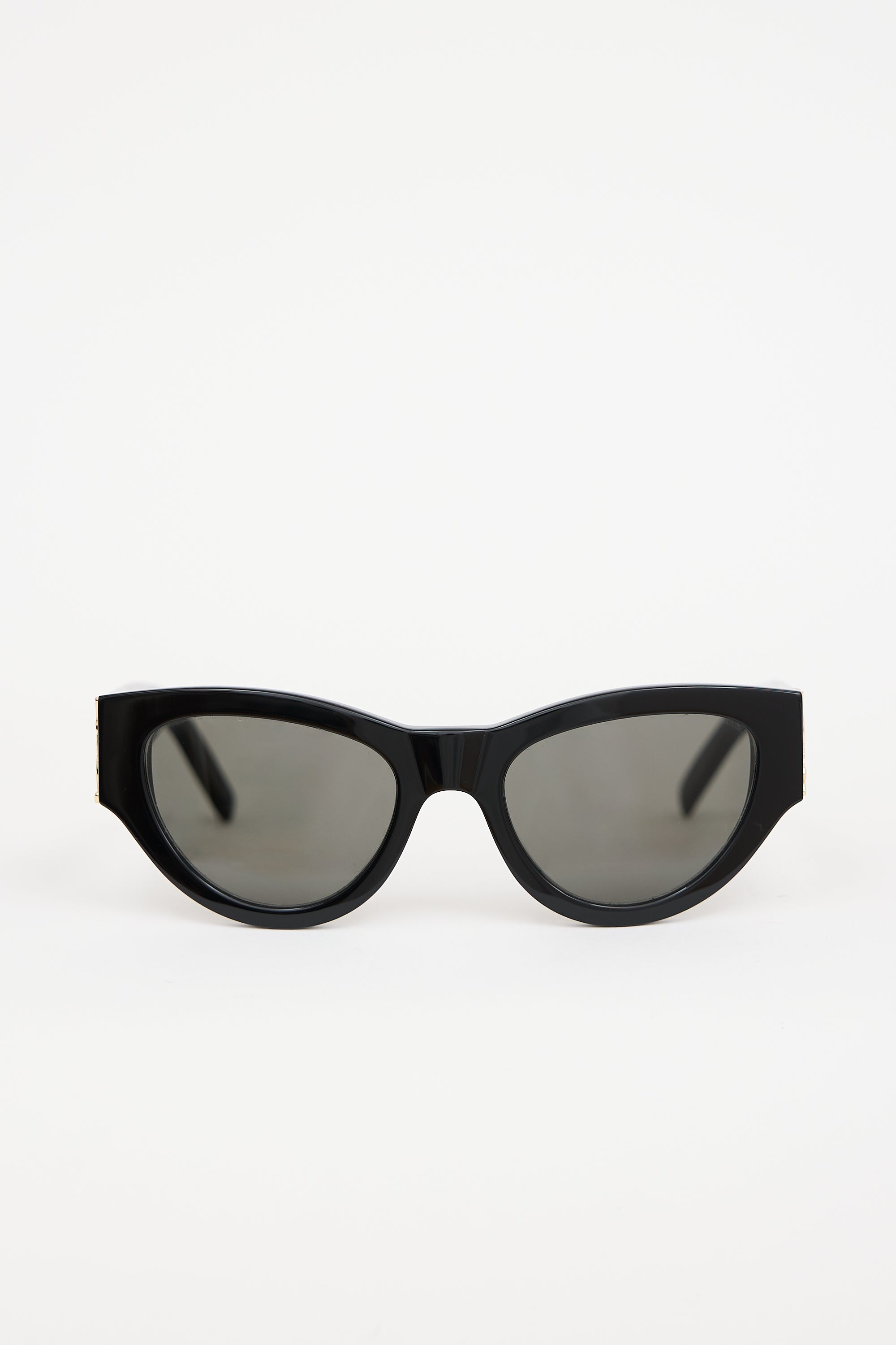 Pre-owned Saint Laurent SLM94 sunglasses featuring grey tinted lenses, black acetate cat eye frame, and gold tone Cassandre accent at temples. Comes with original case and wipe cloth.