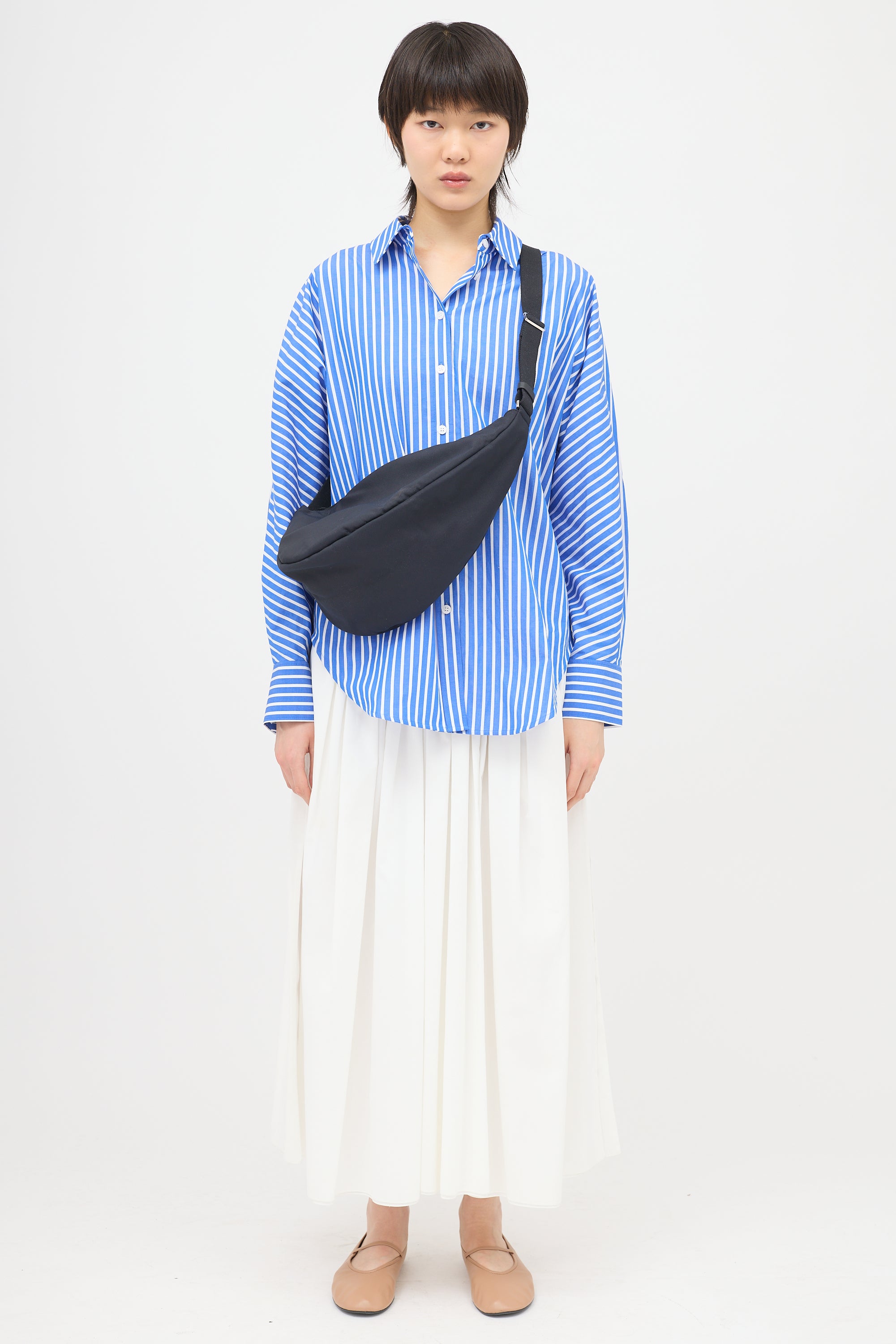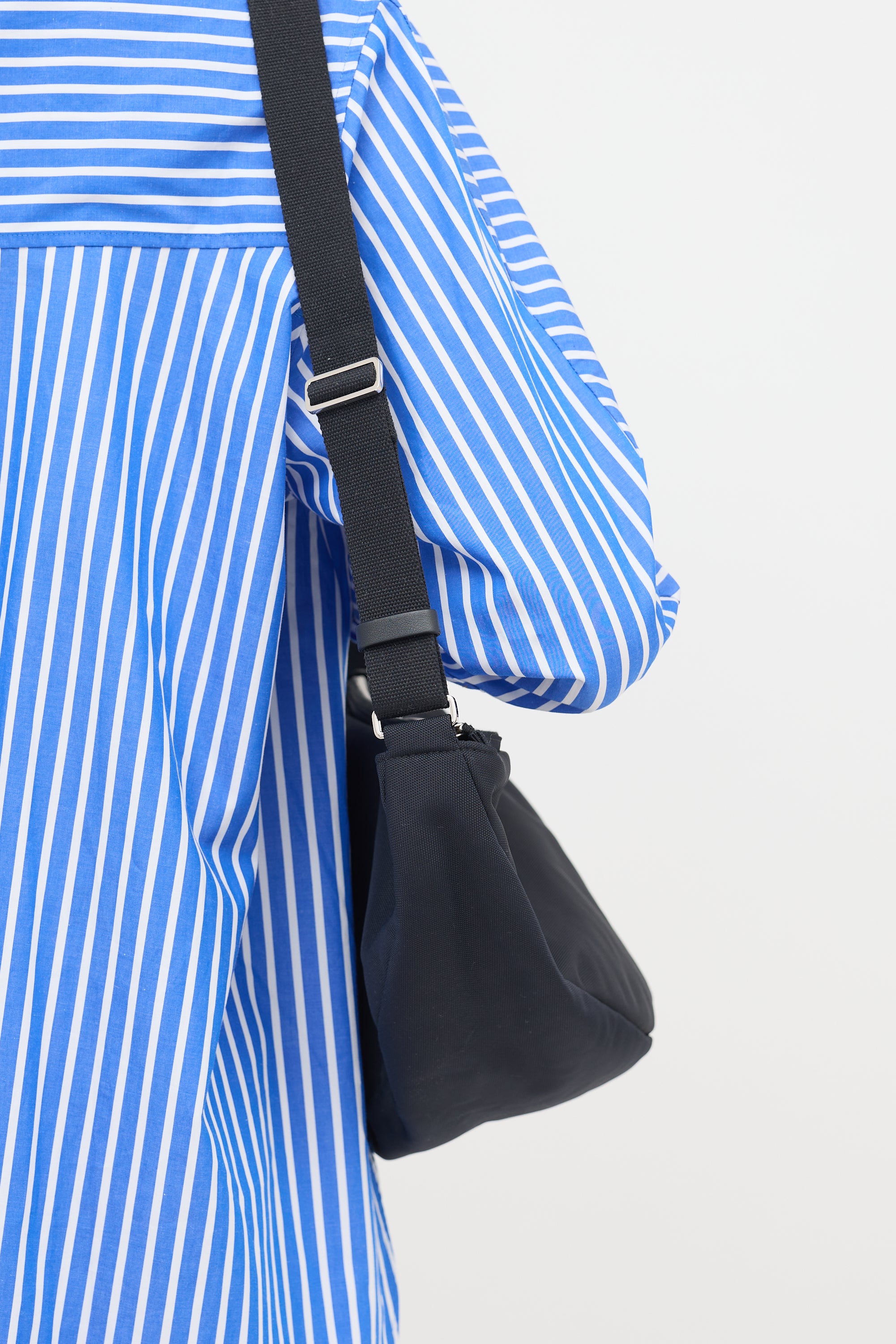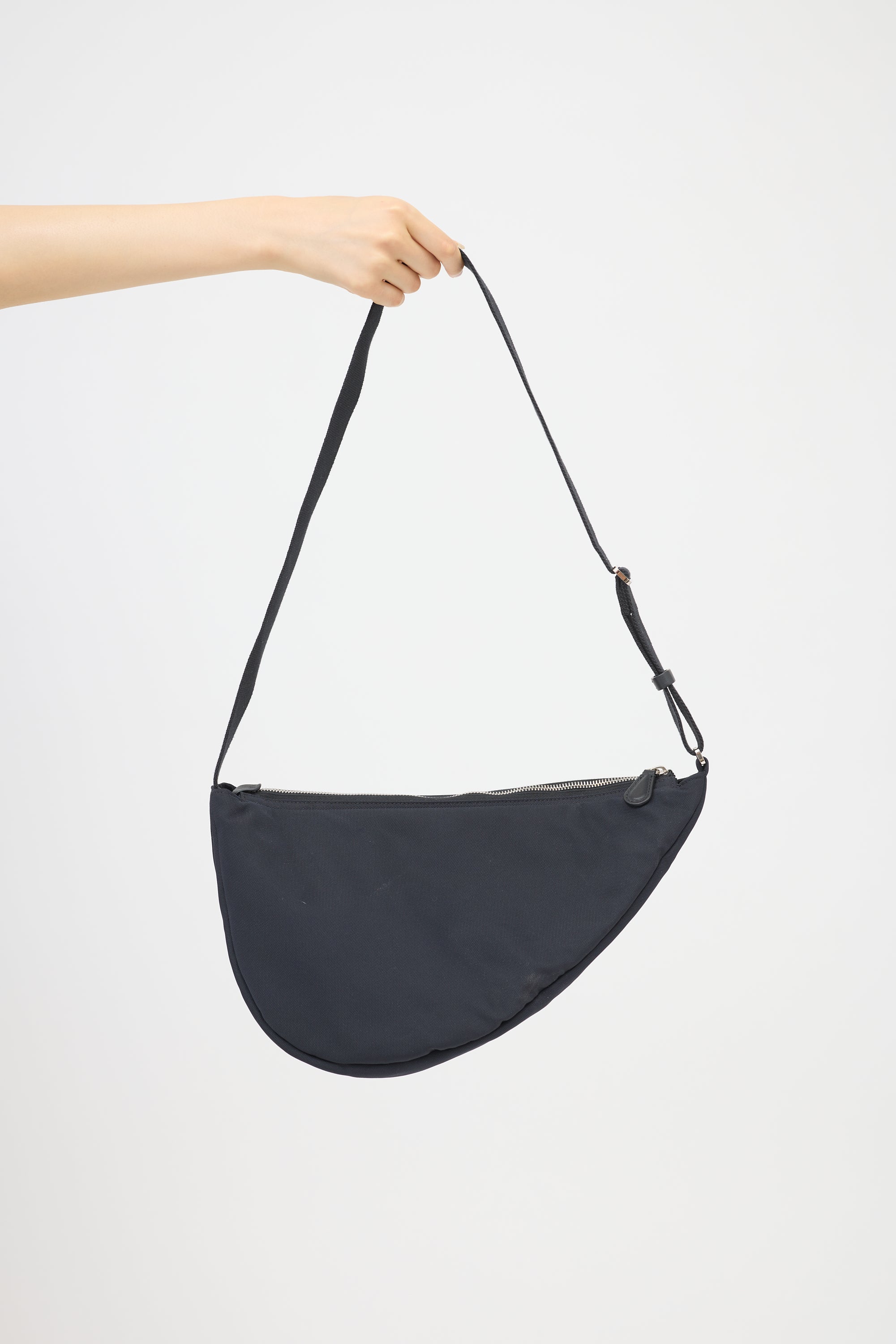 Pre-owned The Row black nylon Slouchy Banana bag featuring silver tone hardware, adjustable canvas shoulder strap, top zip closure, and one lined main compartment. Comes with original dust bag.