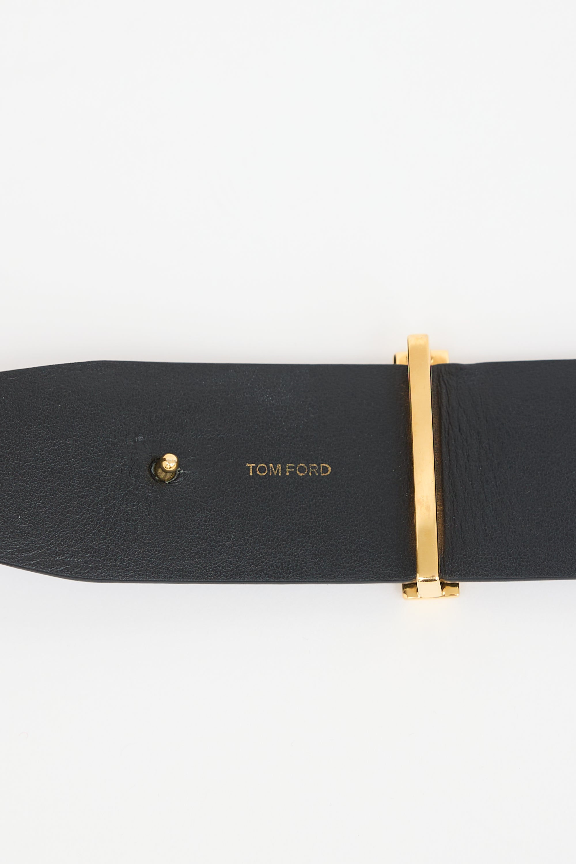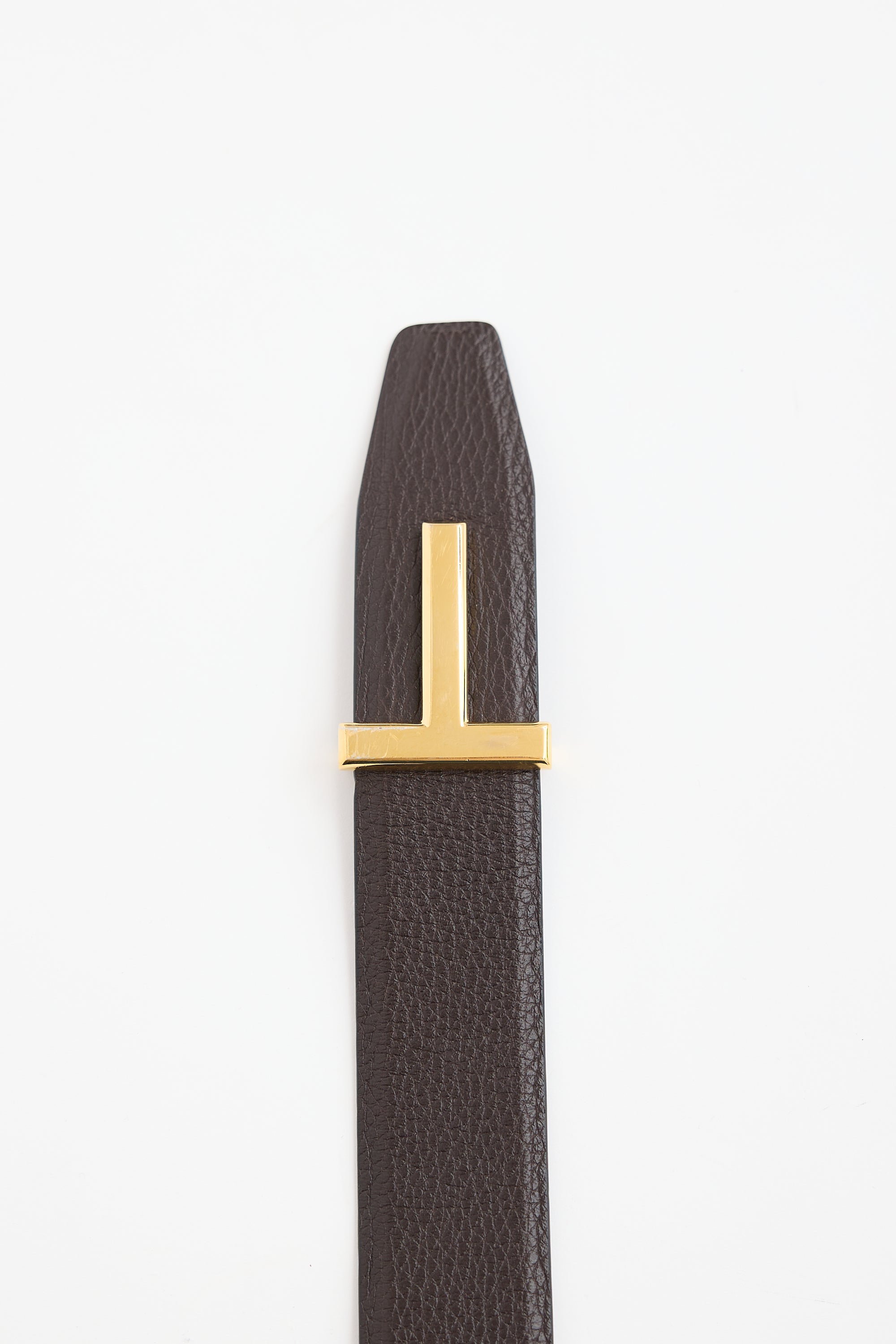 Pre-owned Tom Ford reversible belt featuring brown leather strap, black reverse, and gold tone T logo buckle with push pin closure.