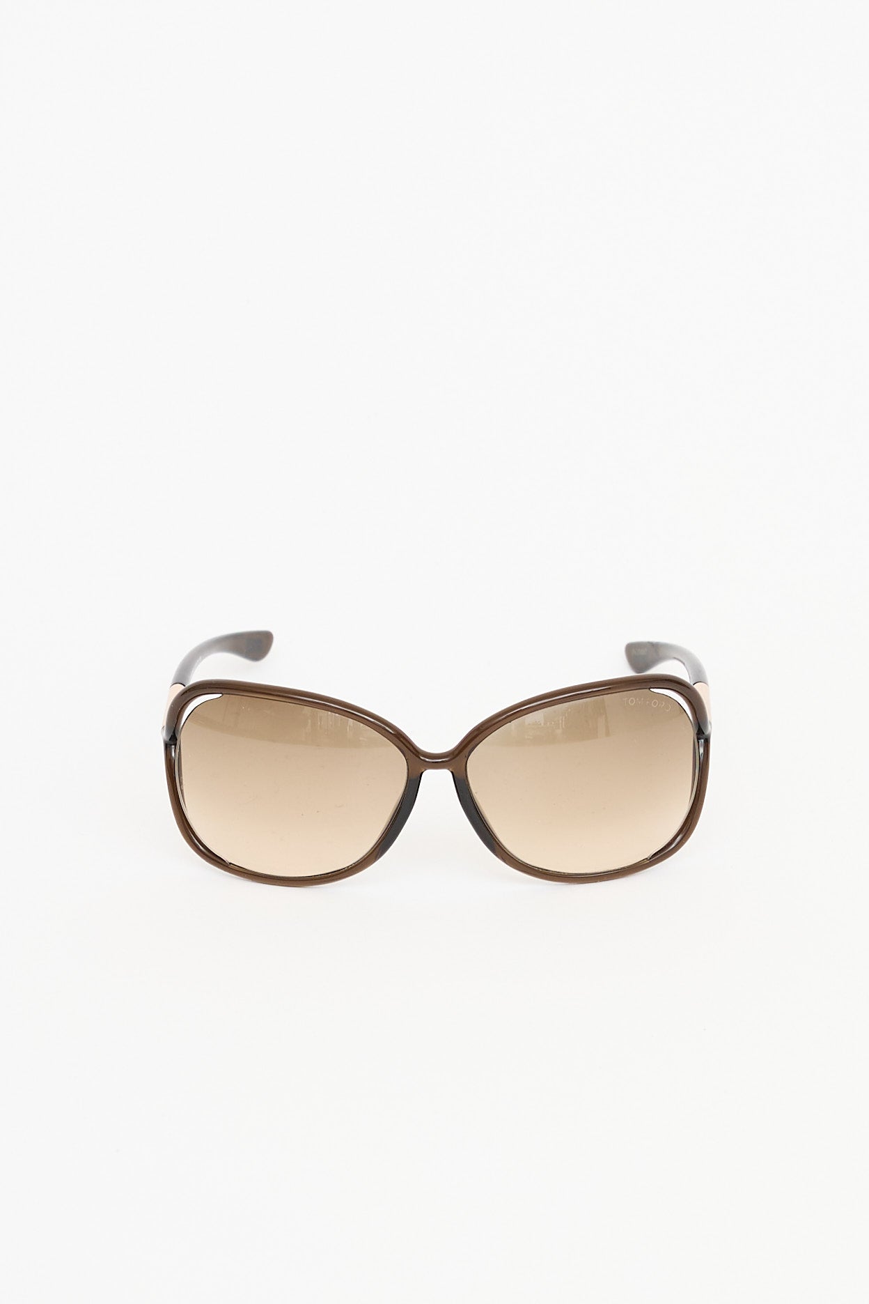 Pre-owned Tom Ford brown Raquel sunglasses featuring an oval frame, tinted lenses, nose pads, and gold tone logo hardware at arms.