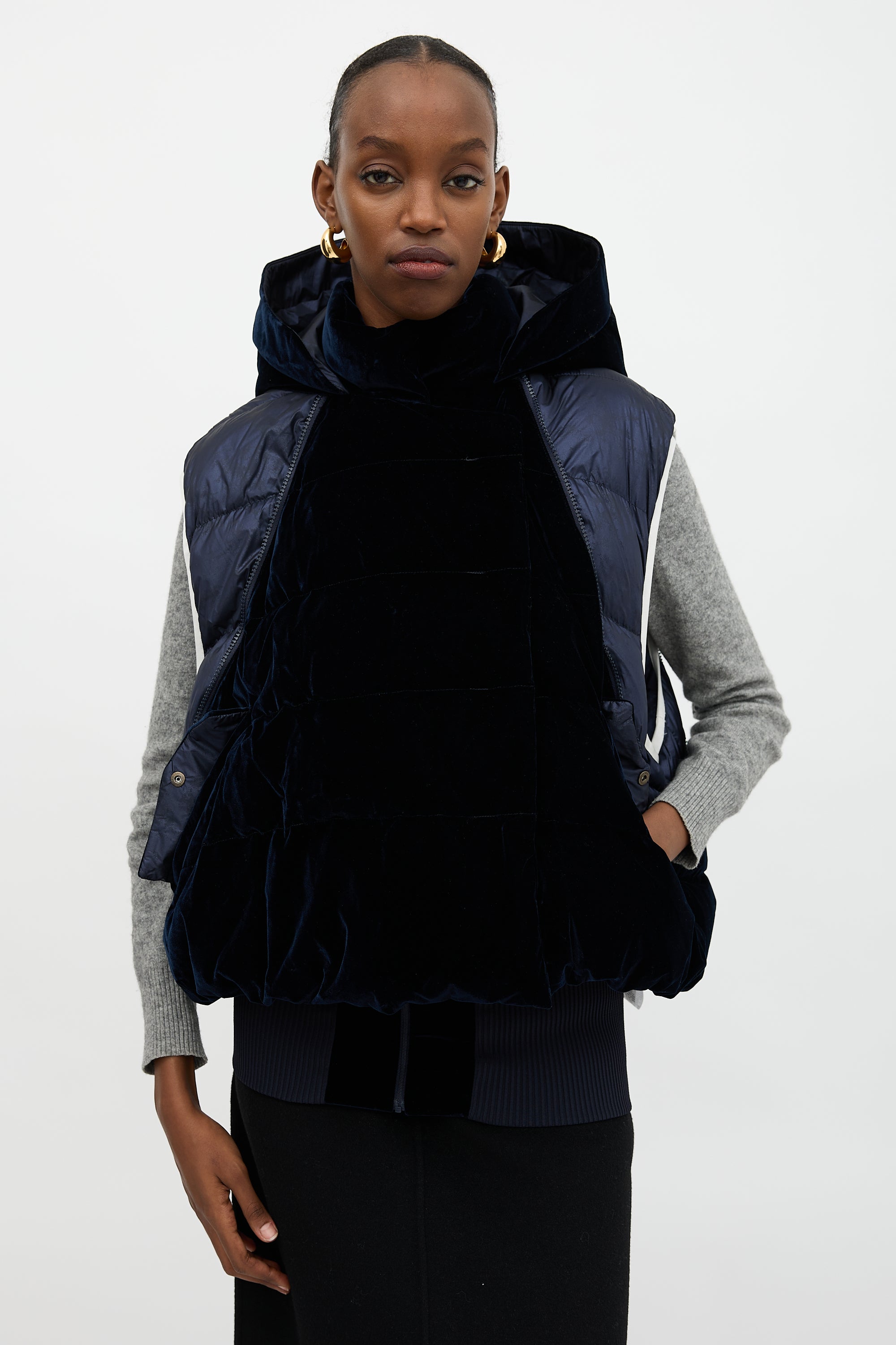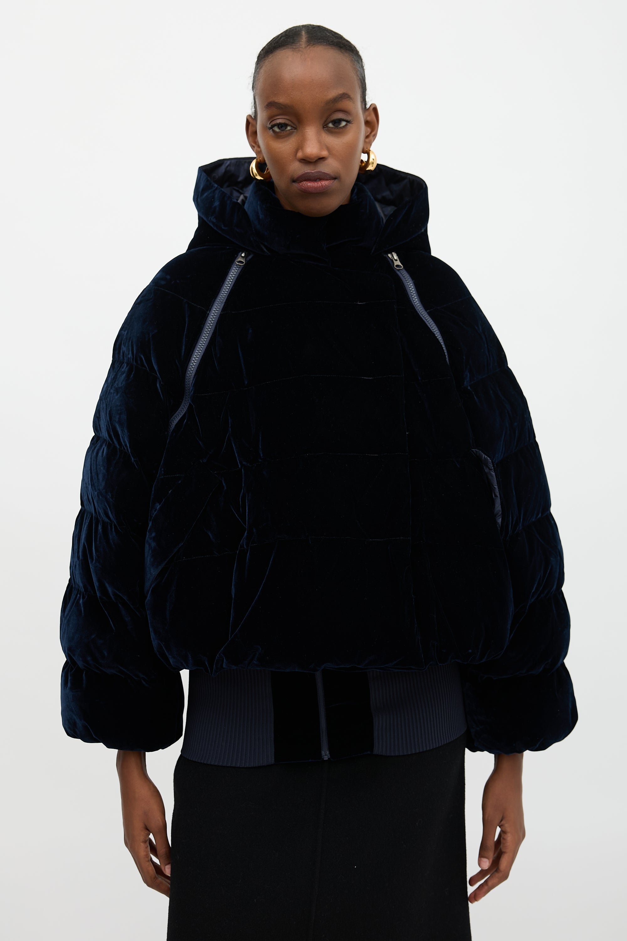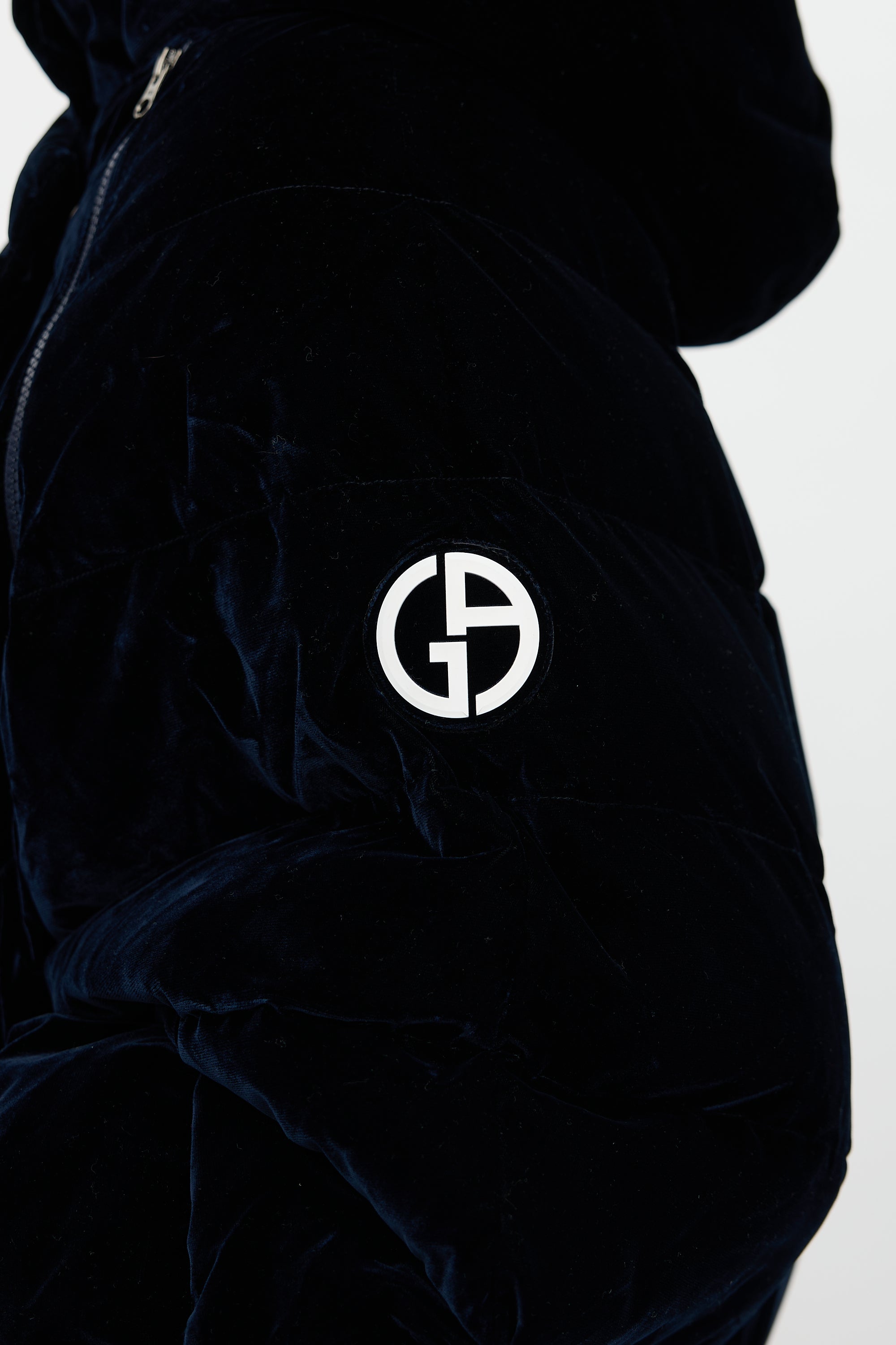 Pre-owned Giorgio Armani Neve navy velvet cropped puffer jacket featuring stand collar, attached hood, front zip and snap button closure, removable ribbed hem layer, detachable sleeves, rubber logo patch at left arm, and inset ribbed cuffs. Padded and lined.