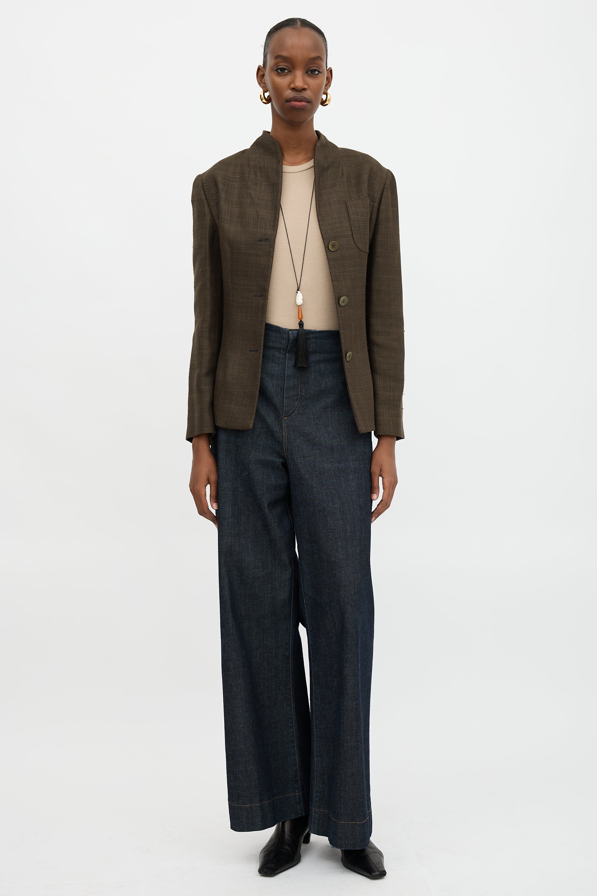 Pre-owned Armani green silk and wool jacket featuring woven exterior, shawl collar, button up front, patch pocket at left chest, and buttoned cuffs. Lined. Clipped to fit model.