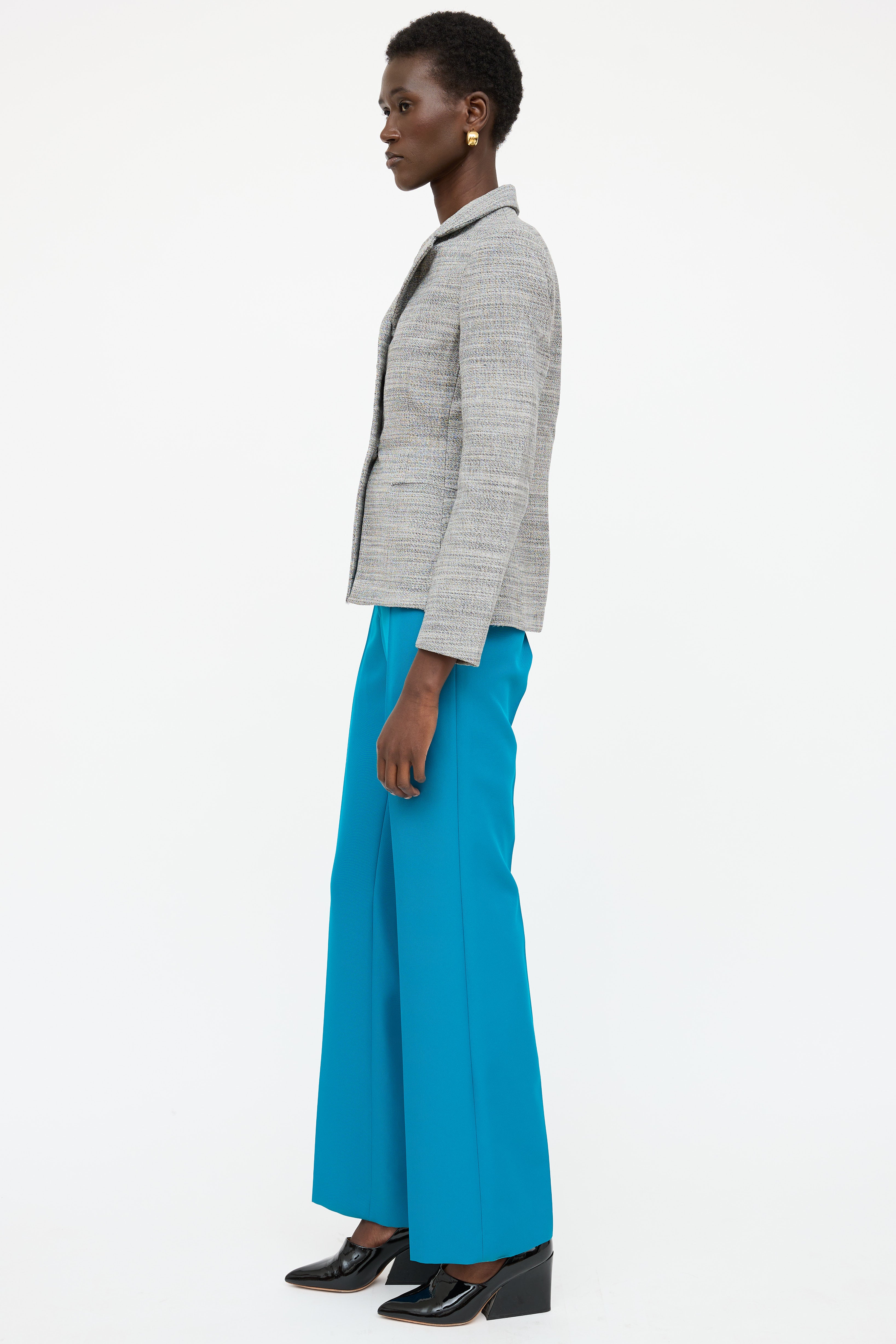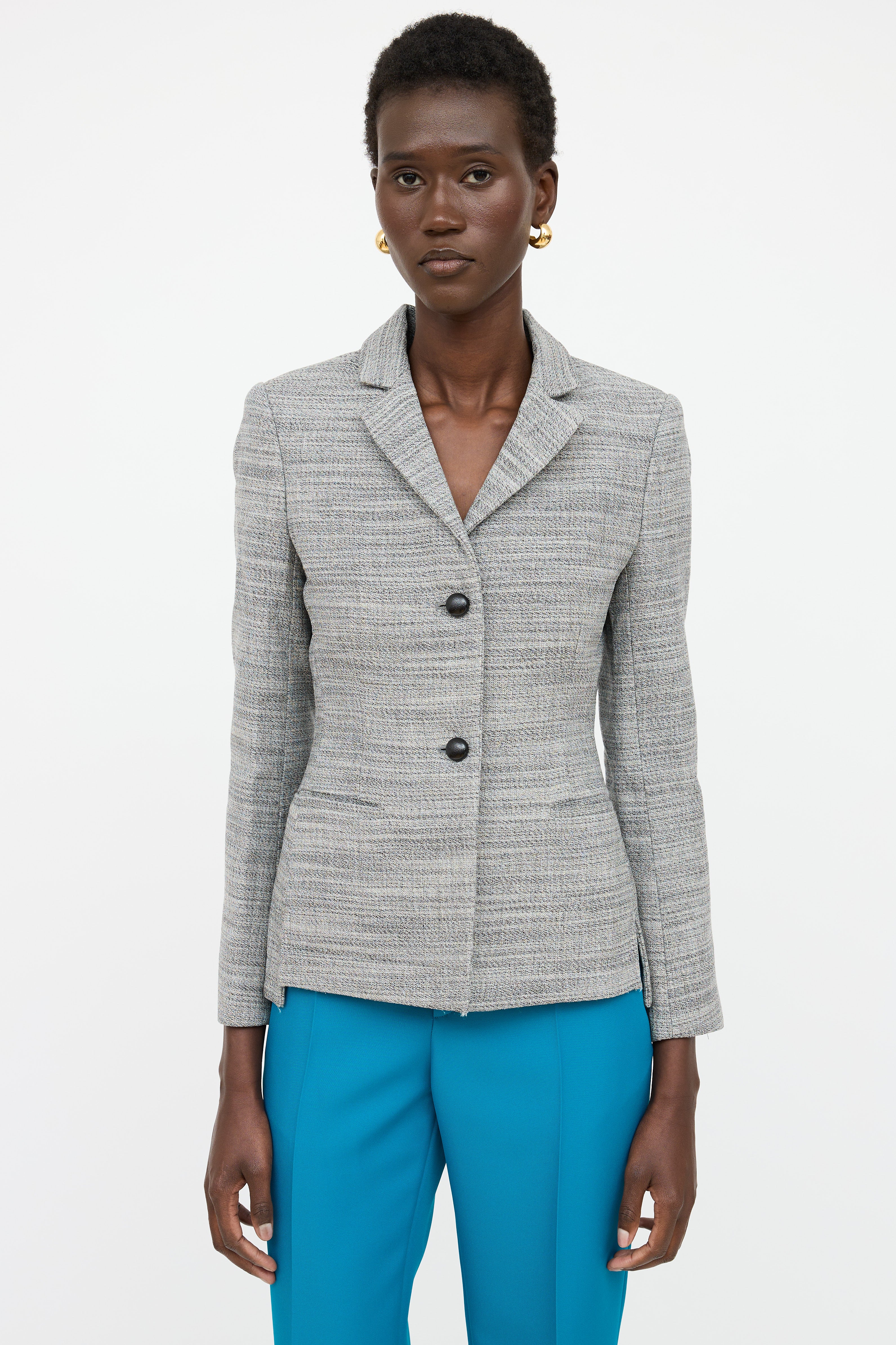 Pre-owned Balenciaga Paris grey wool tweed blazer featuring notch lapel, dual button front, welt pockets at side, and side vents. Lined.