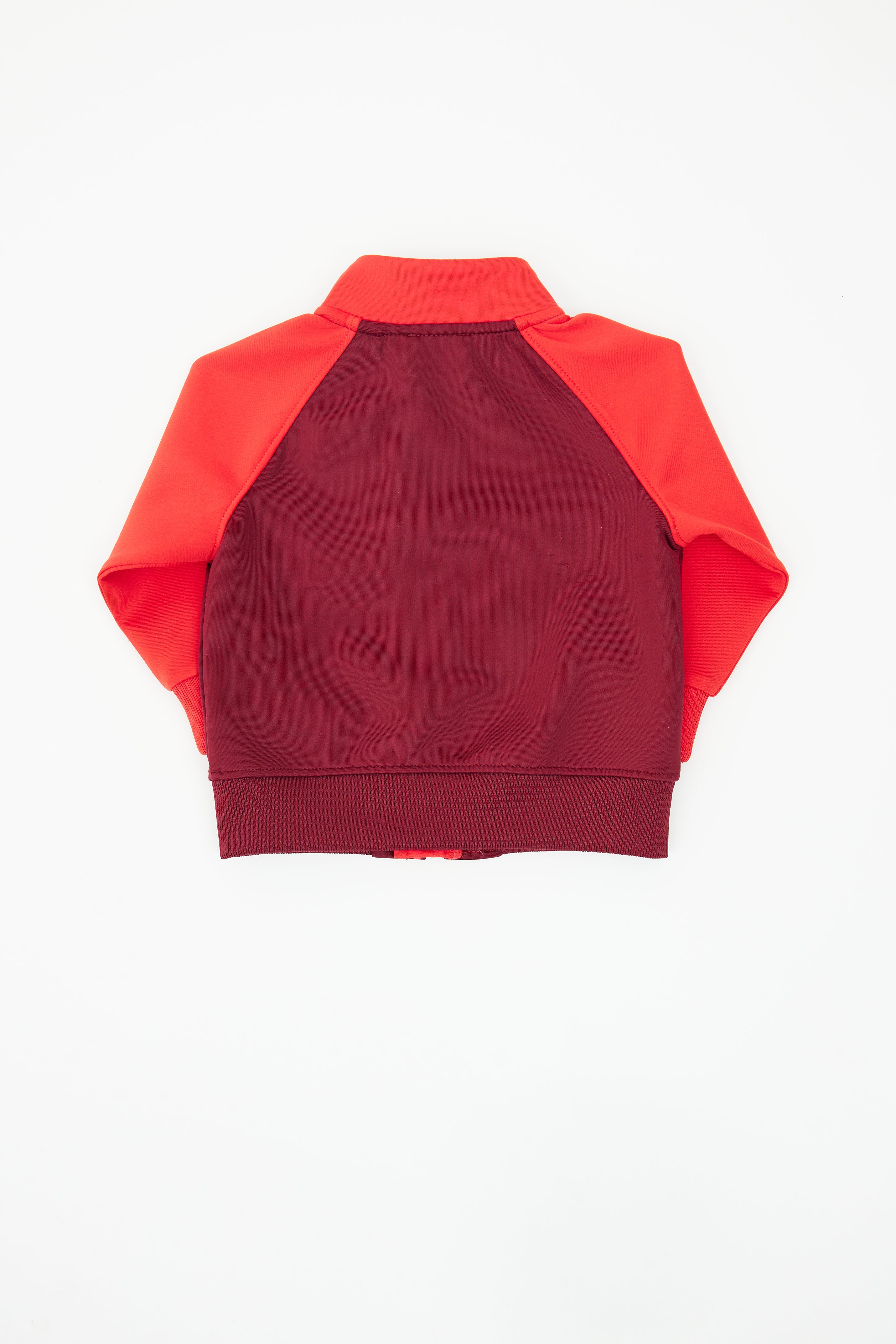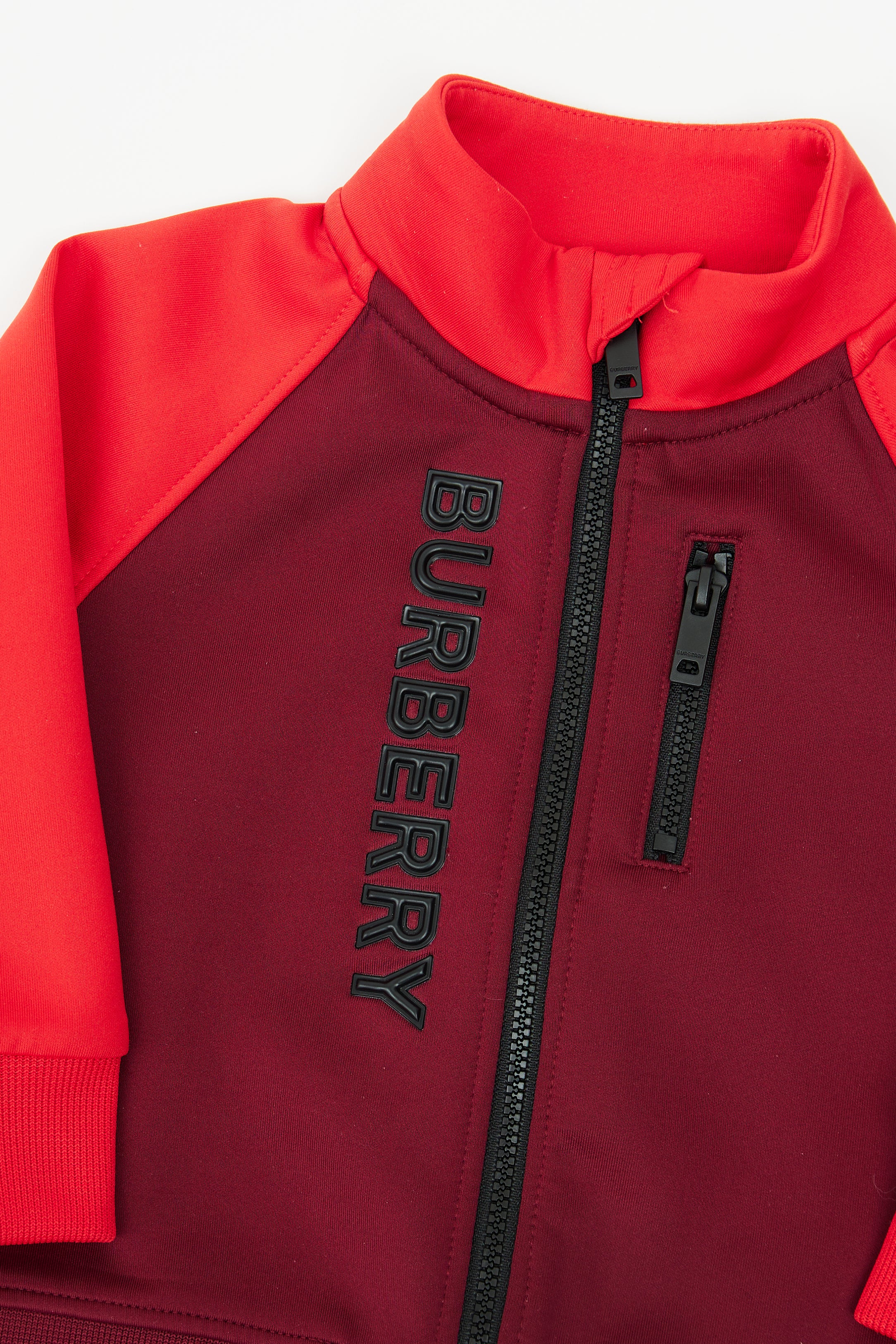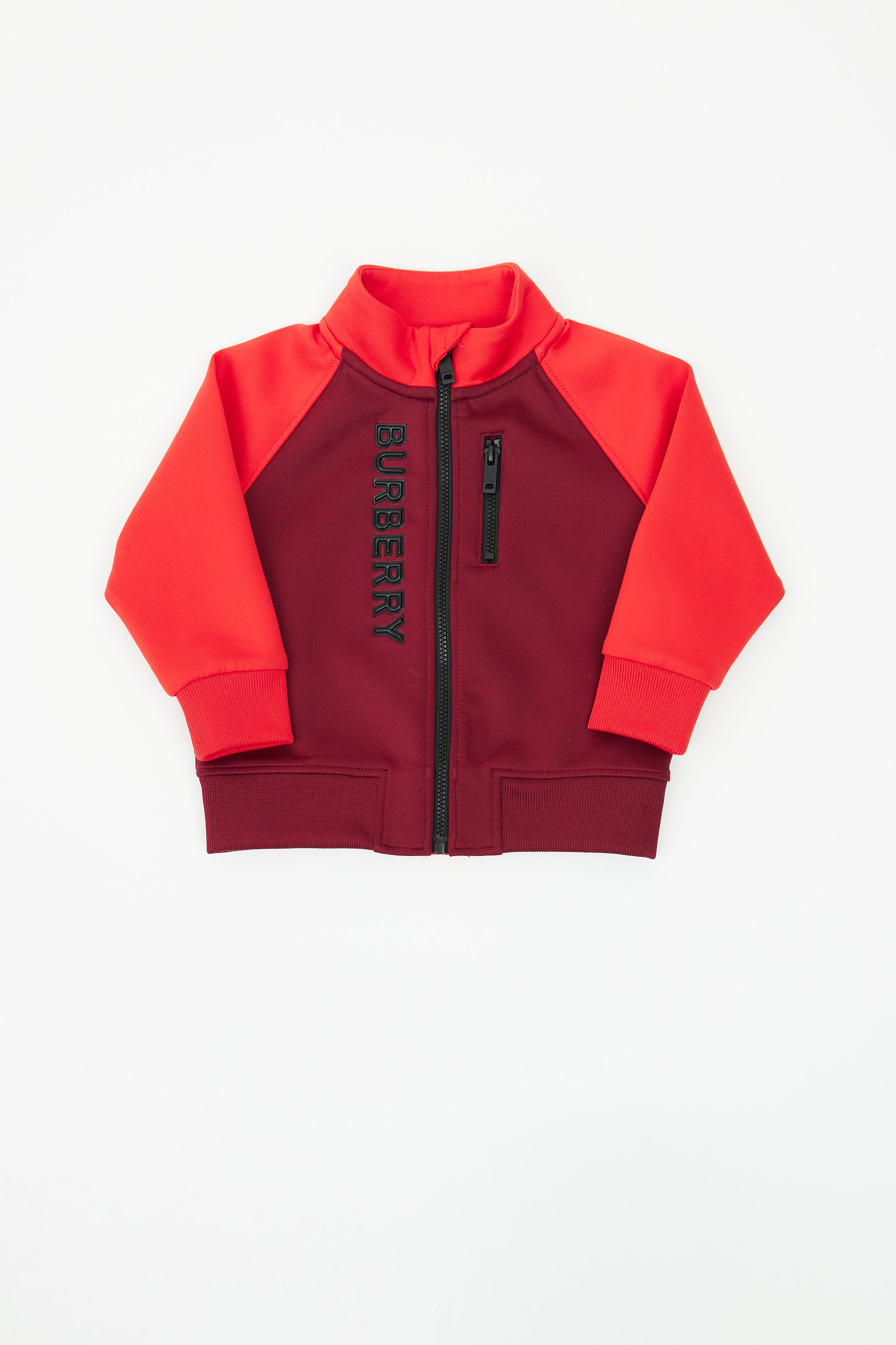Pre-owned Burberry red and burgundy long sleeve zip jacket featuring high neck, ribbed cuffs, ribbed hemline, zip up, zip pocket on left chest and rubberized logo text on right chest.