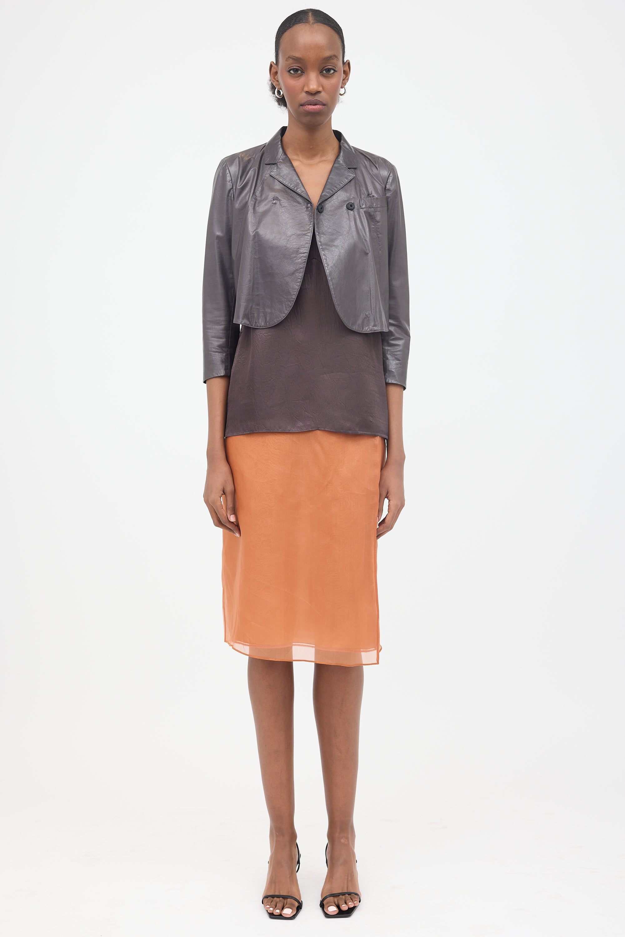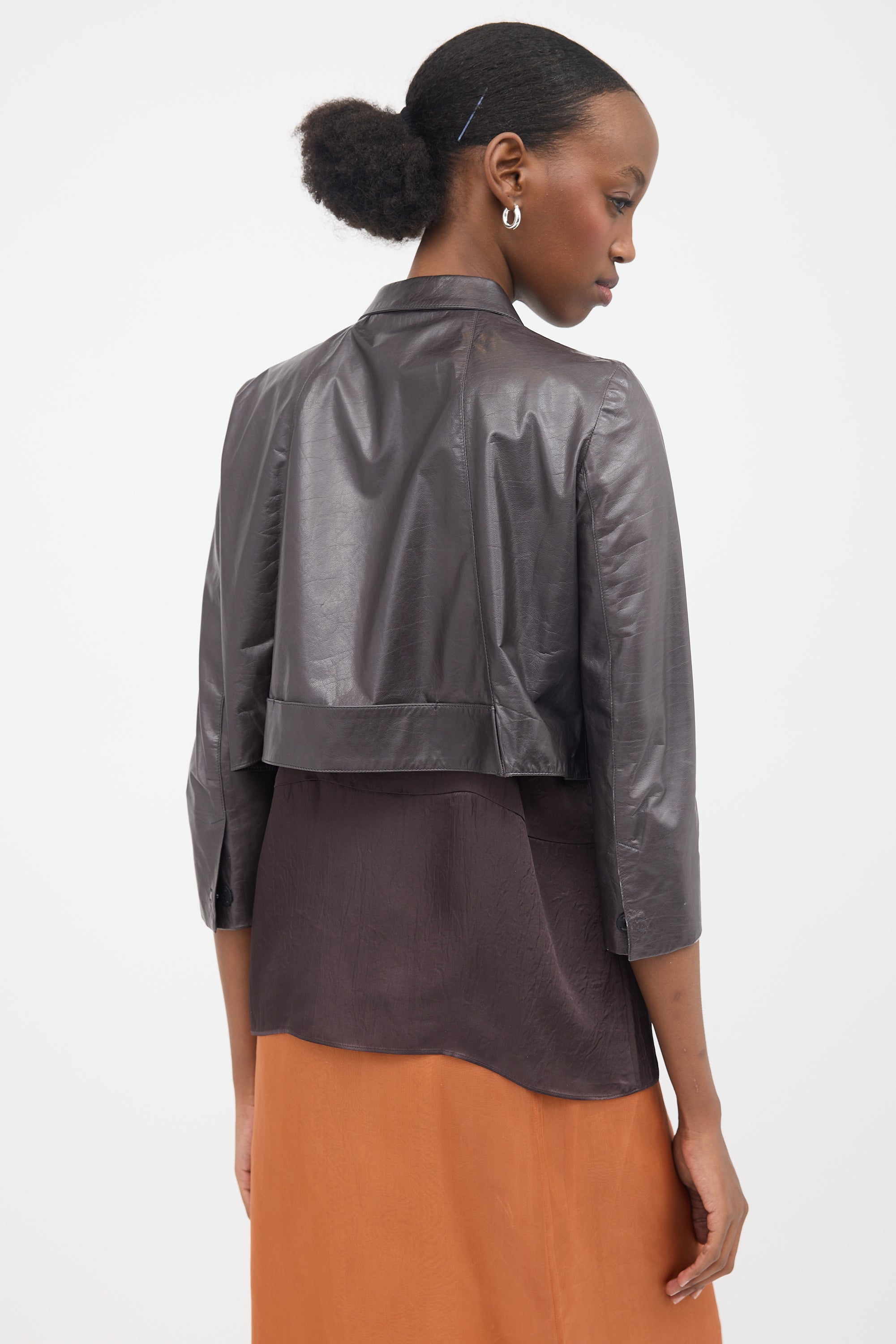 Pre-owned Prada 2009 brown leather jacket featuring a notched collar, snap button front, aback strap detail, and cropped fit. Lined.