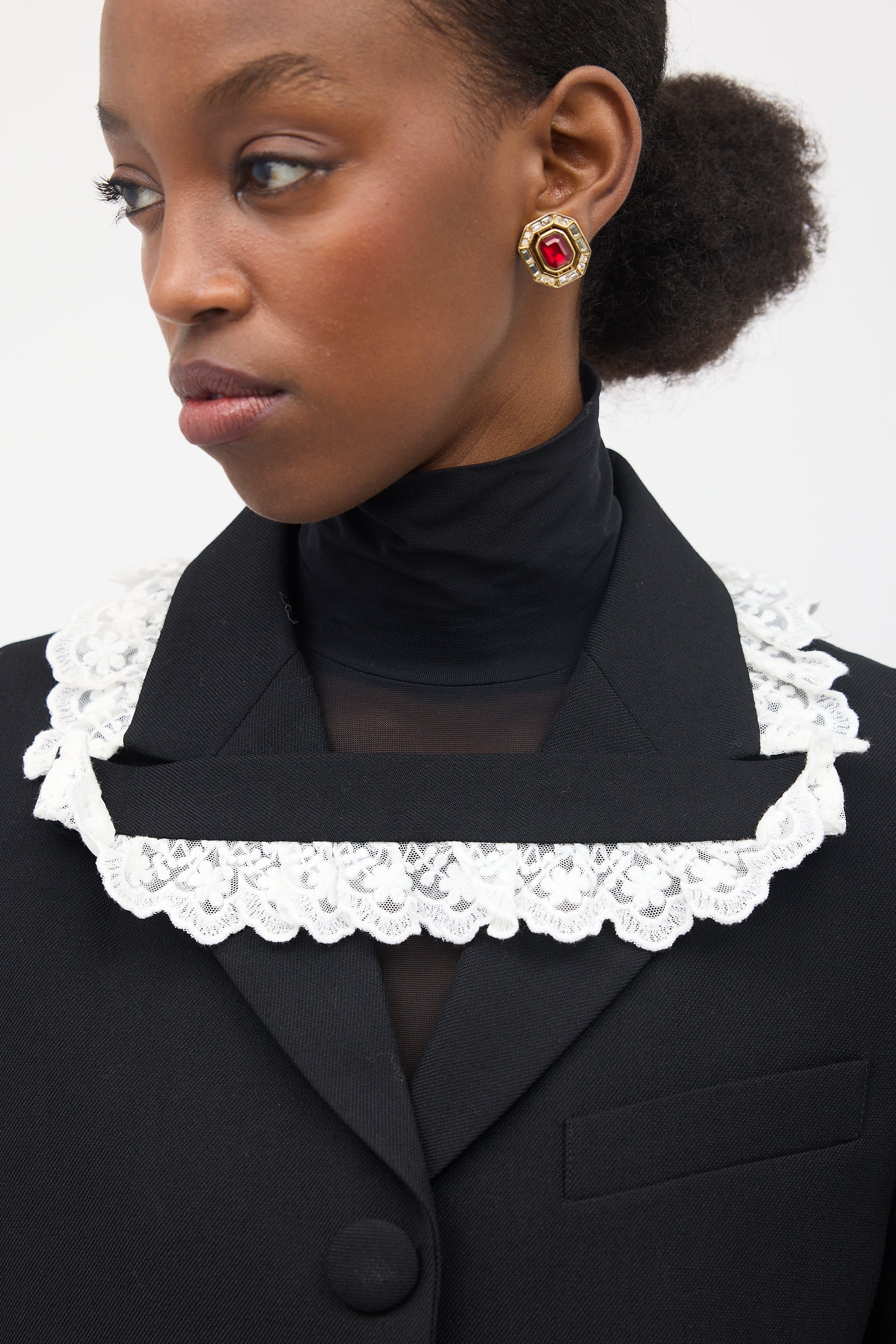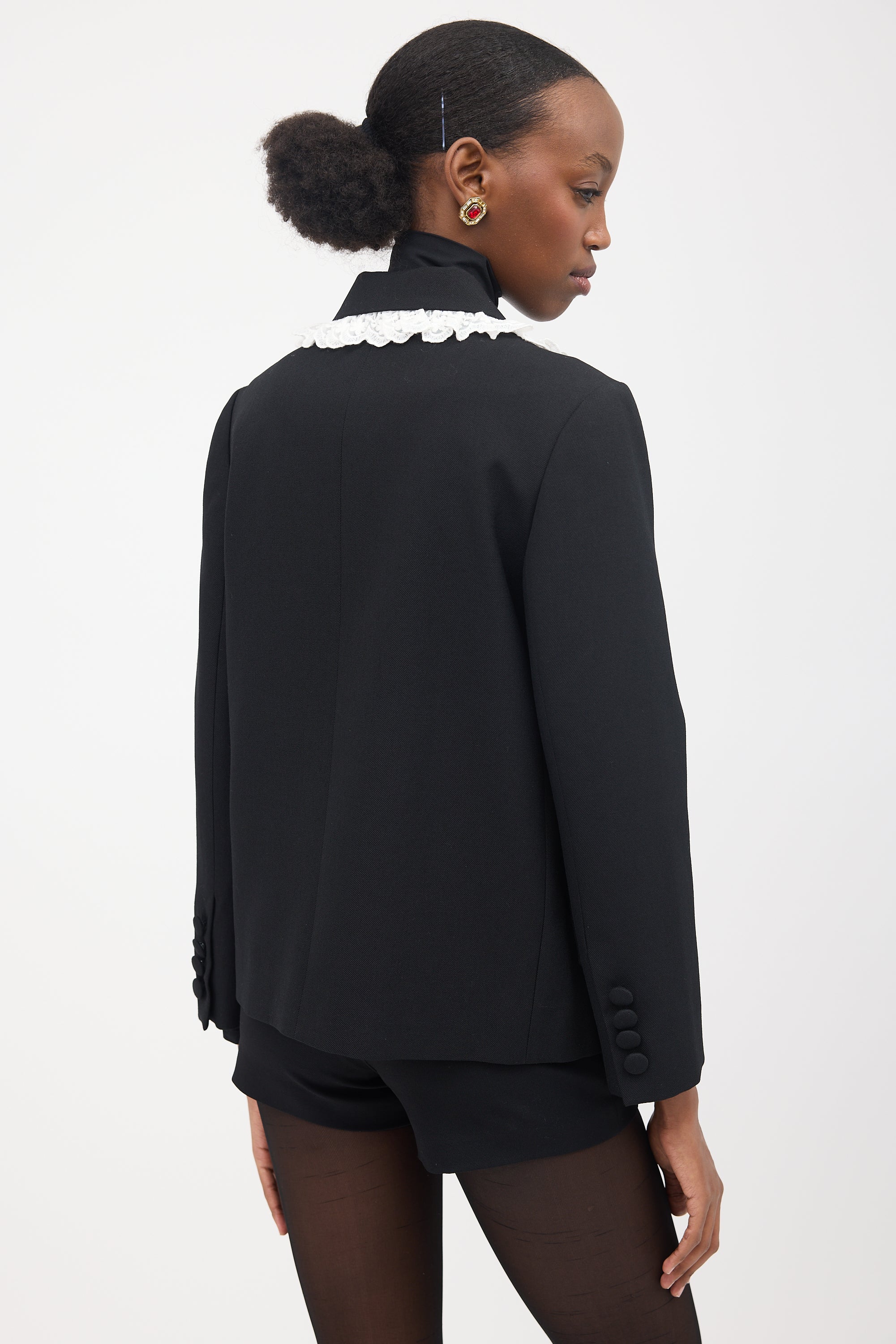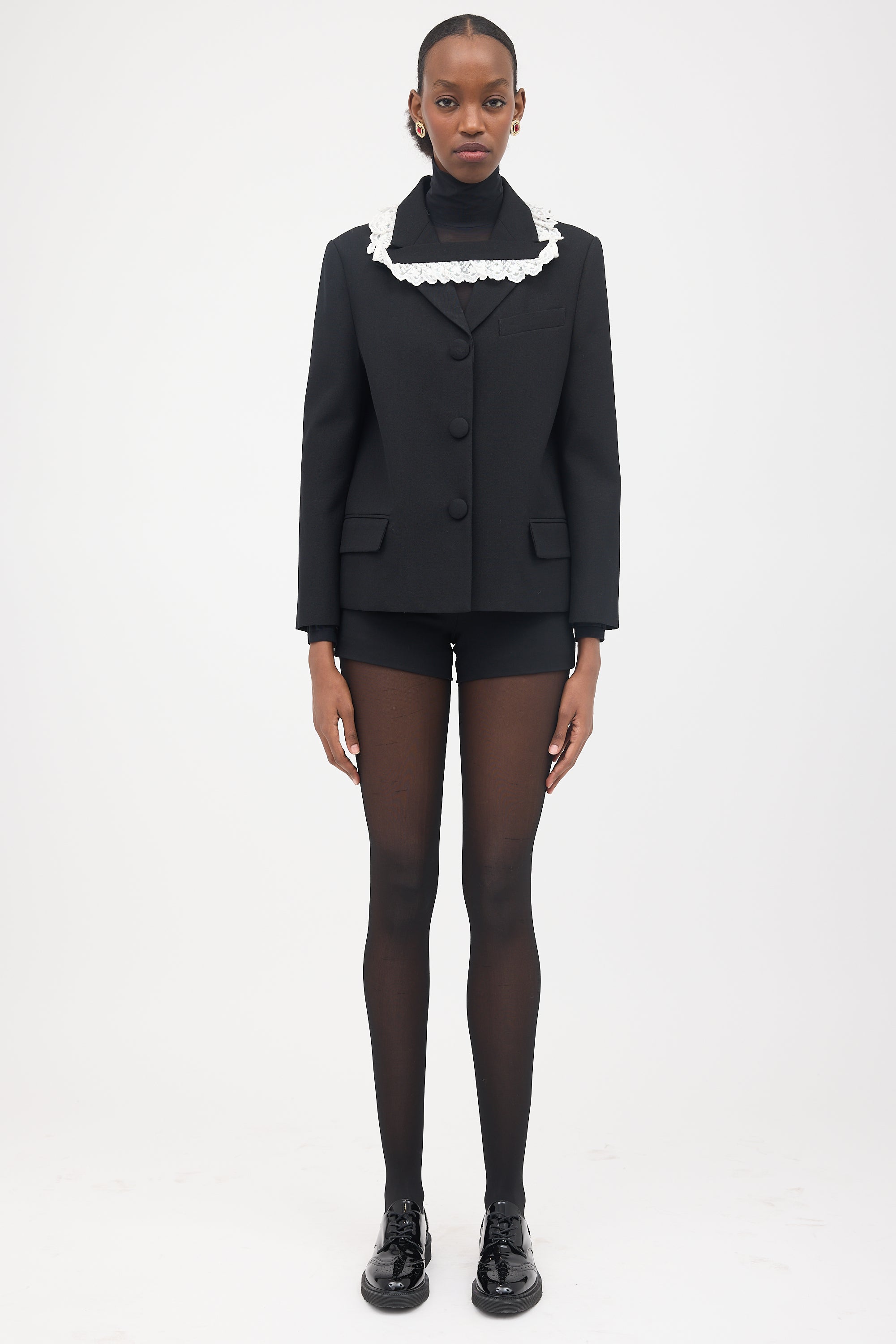 Pre-owned Shushu/Tong black wool & silk blazer featuring white lace trim, notched collar with detachable strap, snap button front, and double welt pockets. Lined.
