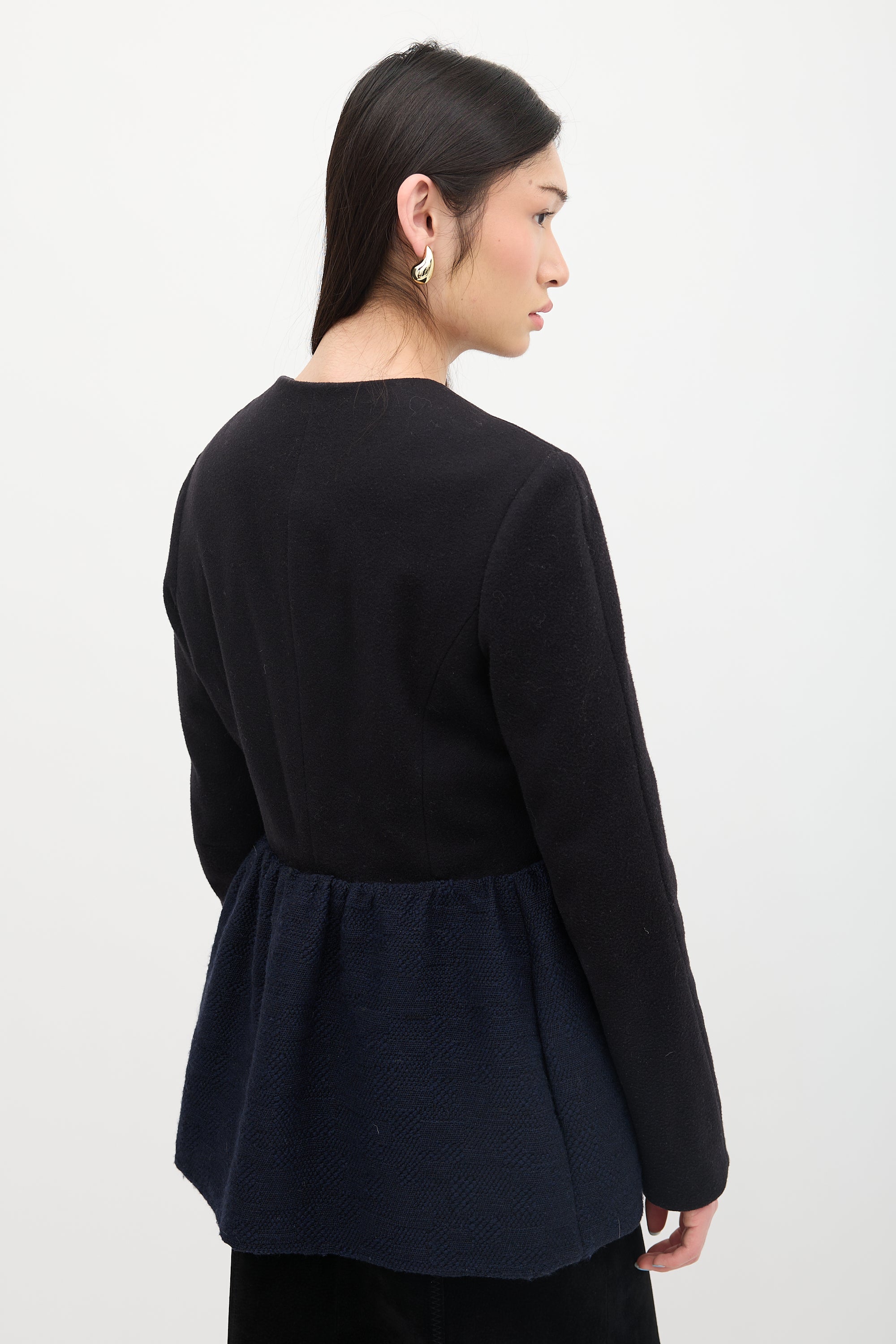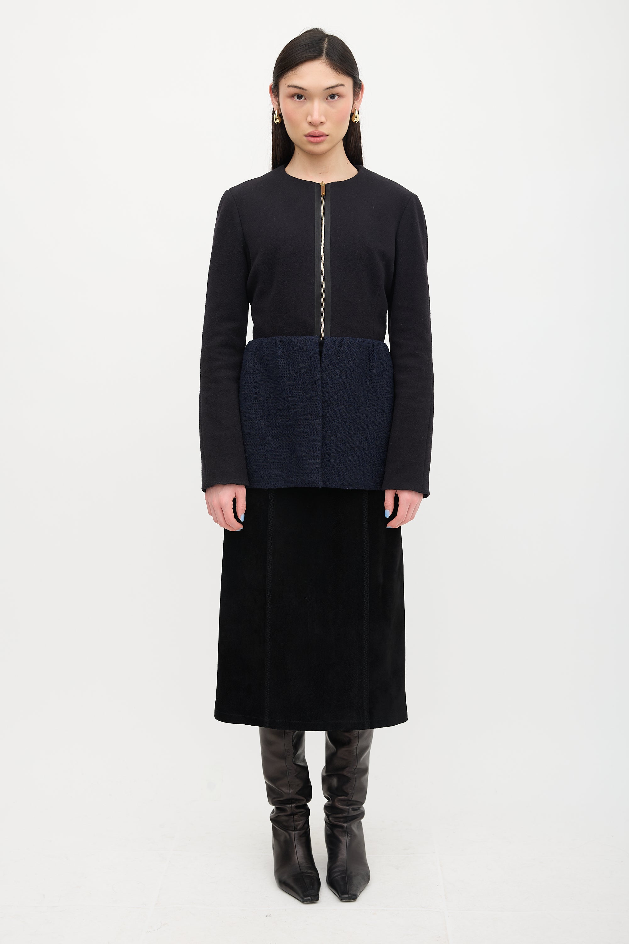 Pre-owned The Row navy Loxton jacket featuring a round collar, gold tone zip front with snap button fastening, woven peplum hem, and two inseam pockets. Lined.