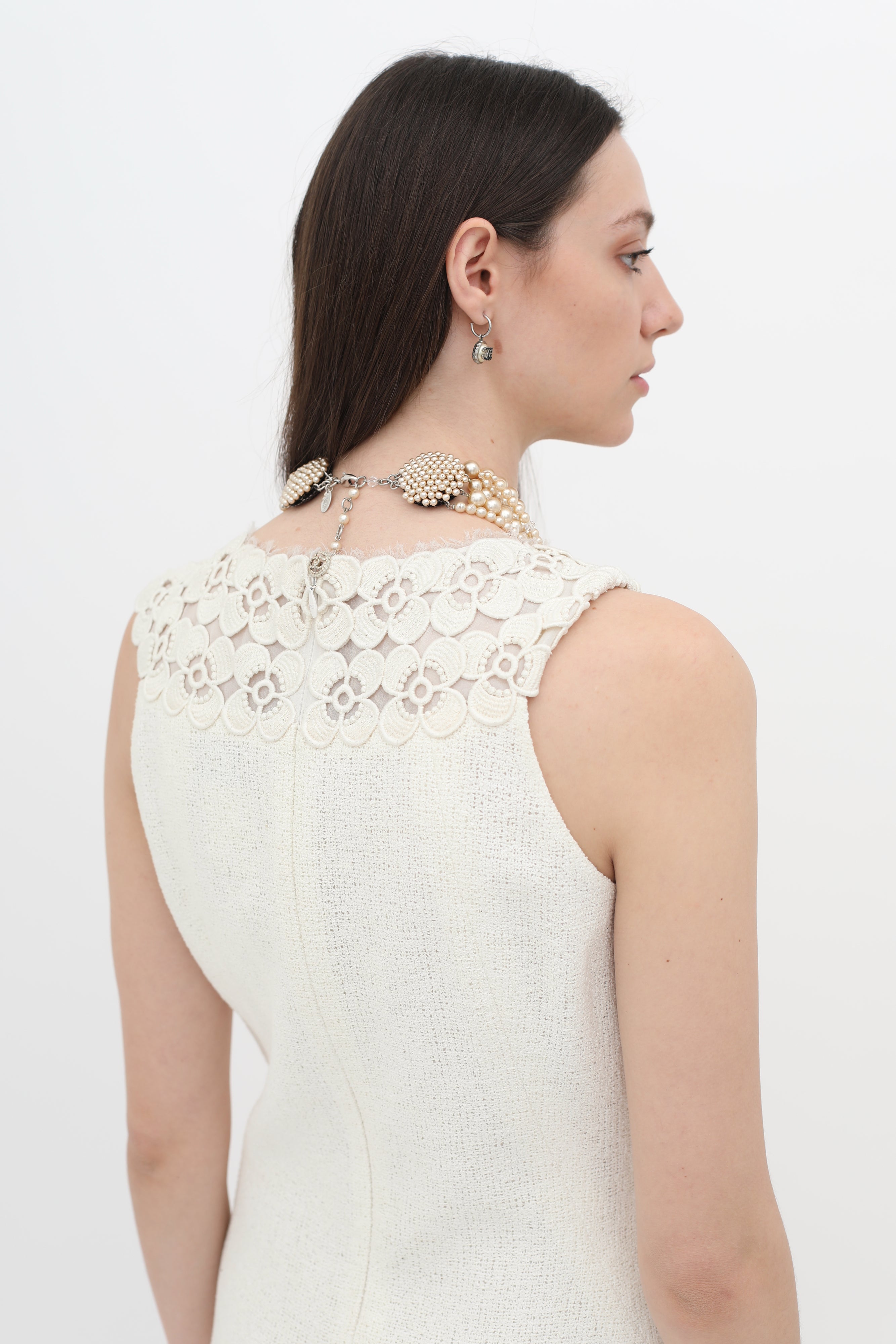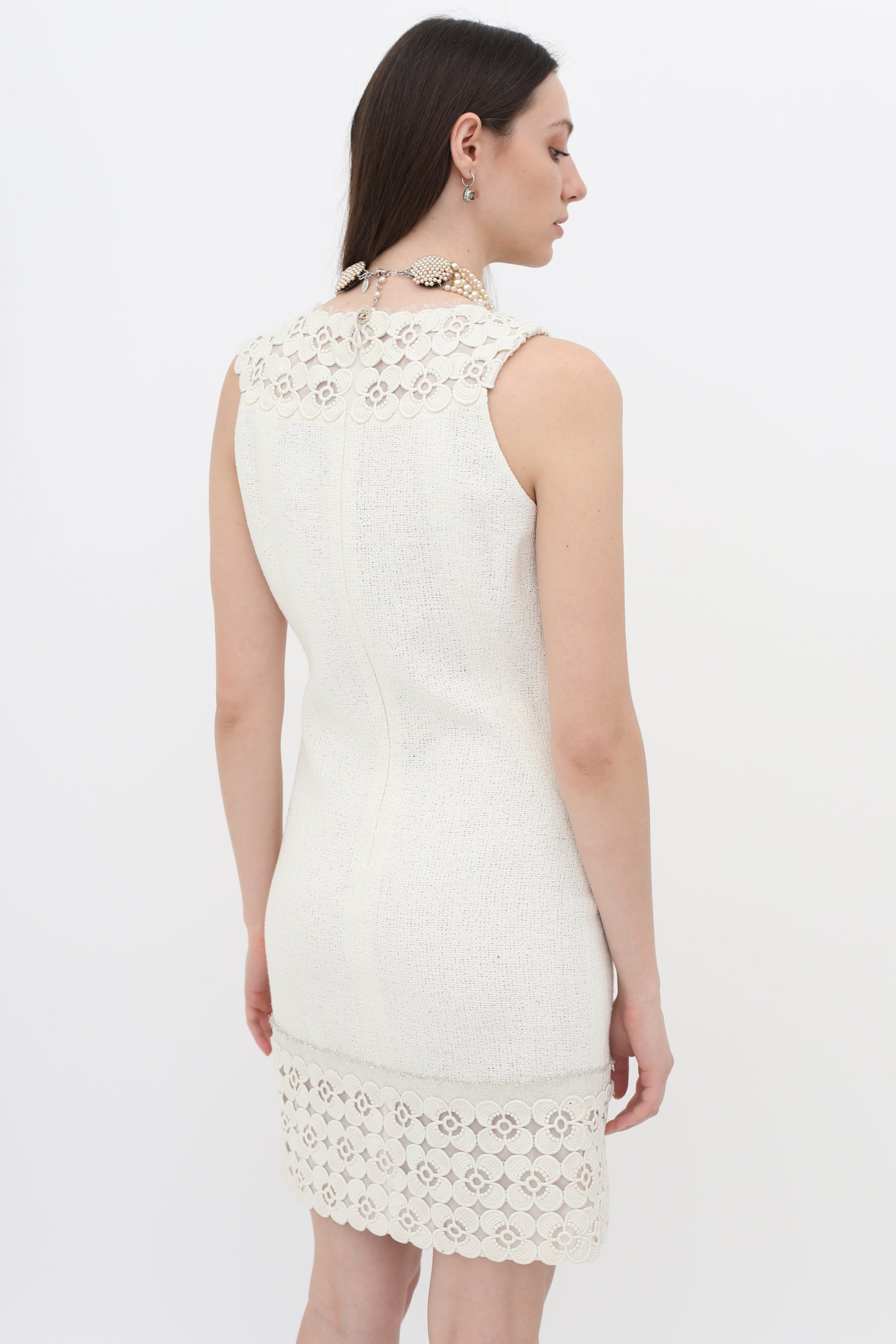 Chanel pre-owned cream sleeveless shift dress featuring an embroidered floral lace appliqué at the collar and bottom hem, rounded neckline, woven outer, concealed zipper at center back with hook-clasp closure and accent Chanel logo button in gold-toned hardware, white shimmer bead trim on bottom hem, interior lining.