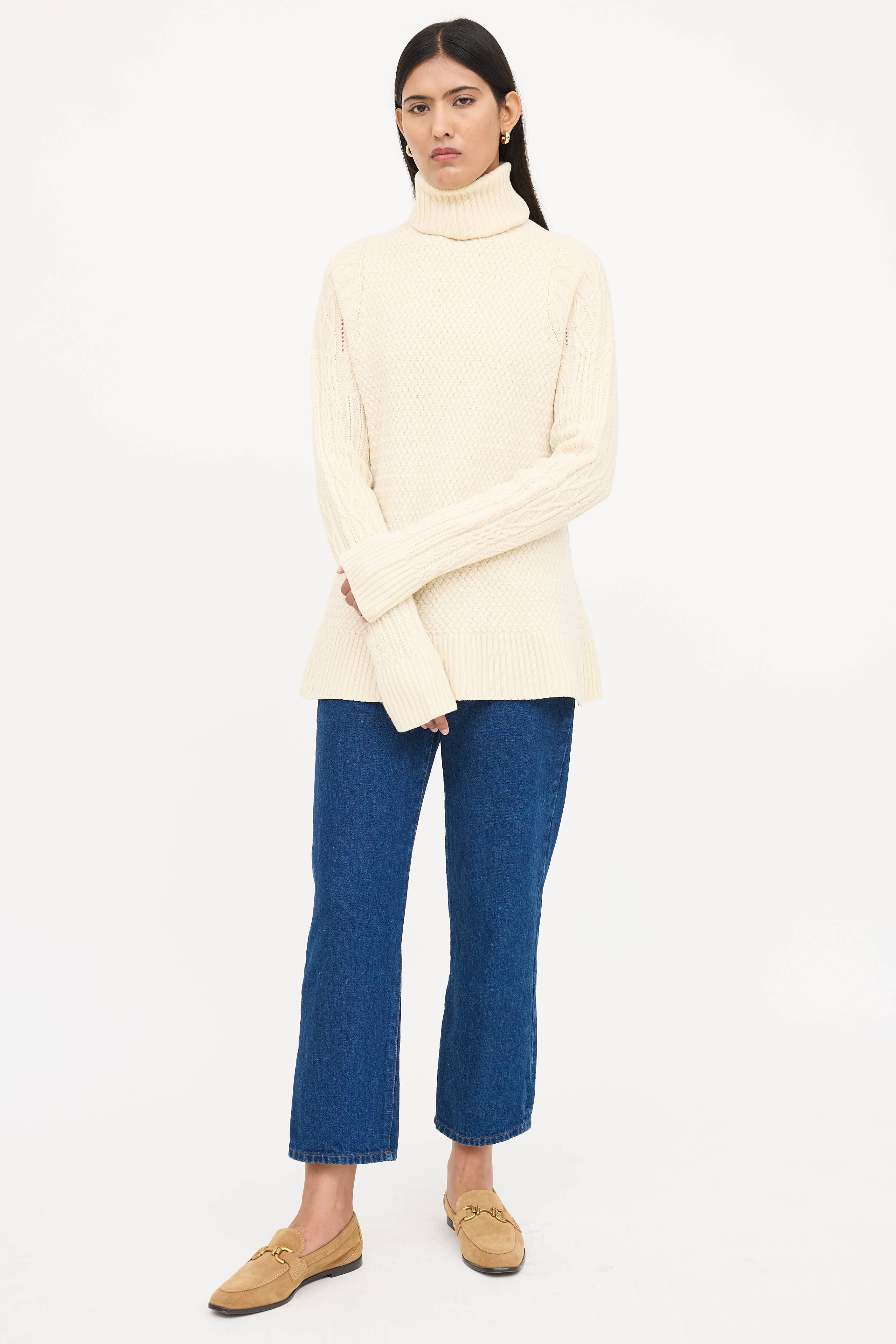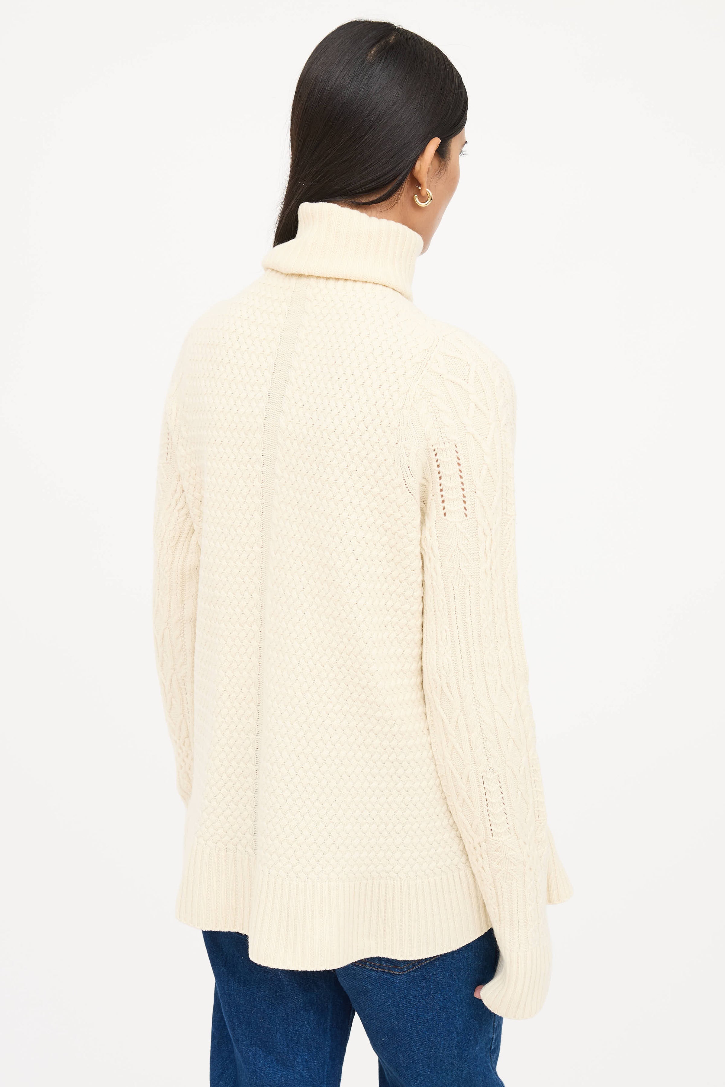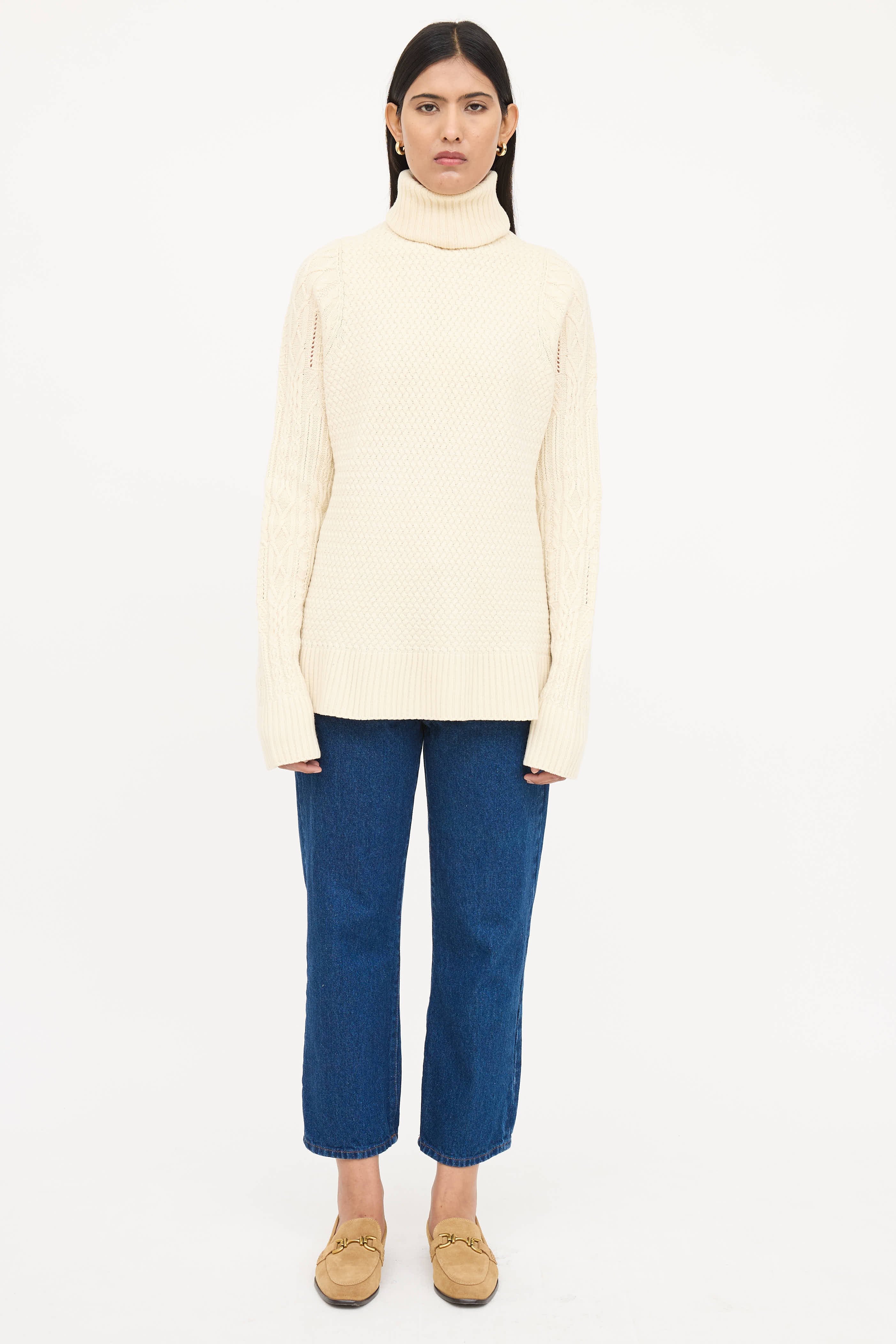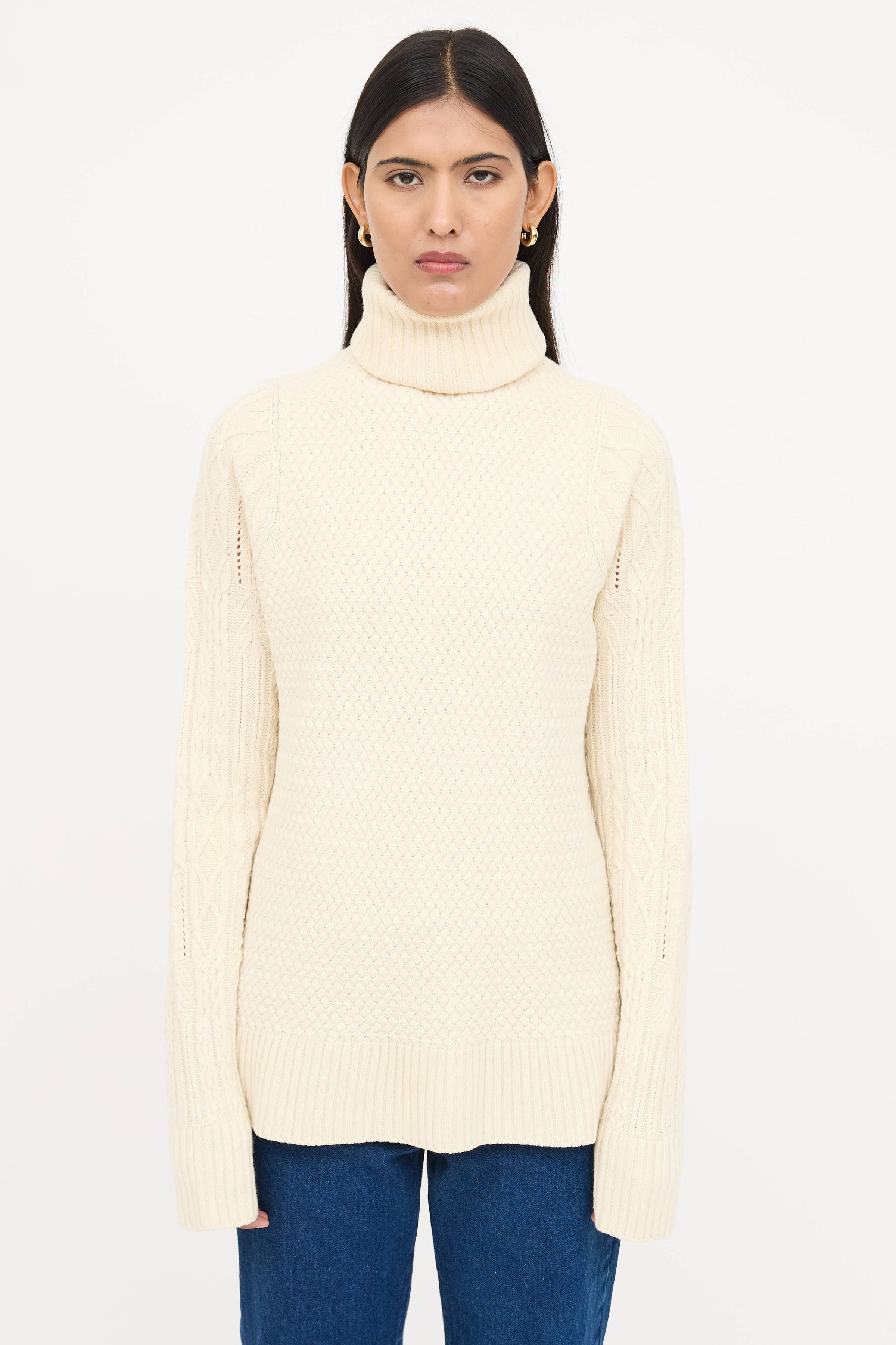 Pre-owned The Row cream long sleeve sweater featuring turtleneck, cable knit sleeves, ribbed trims, and woven bodice.