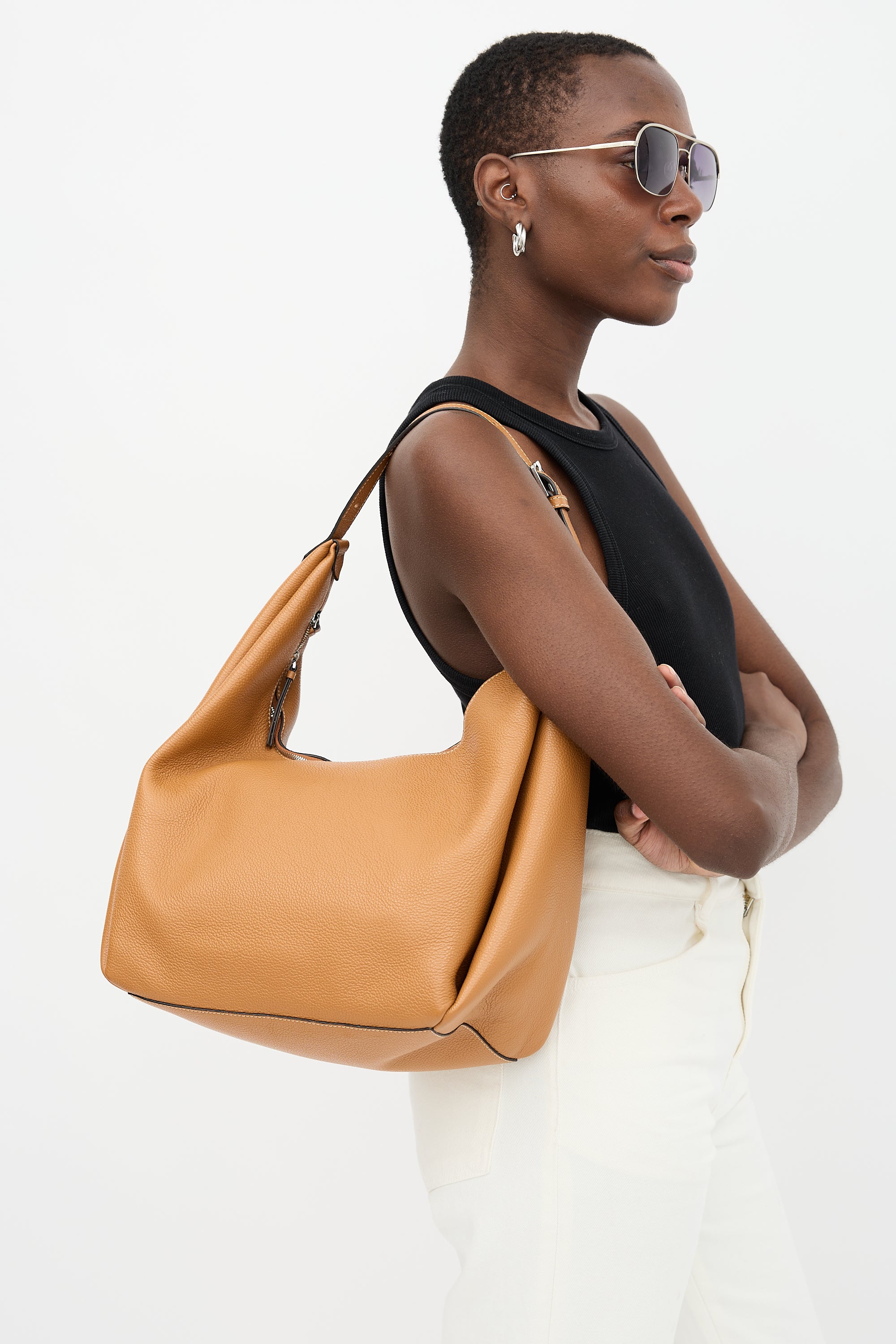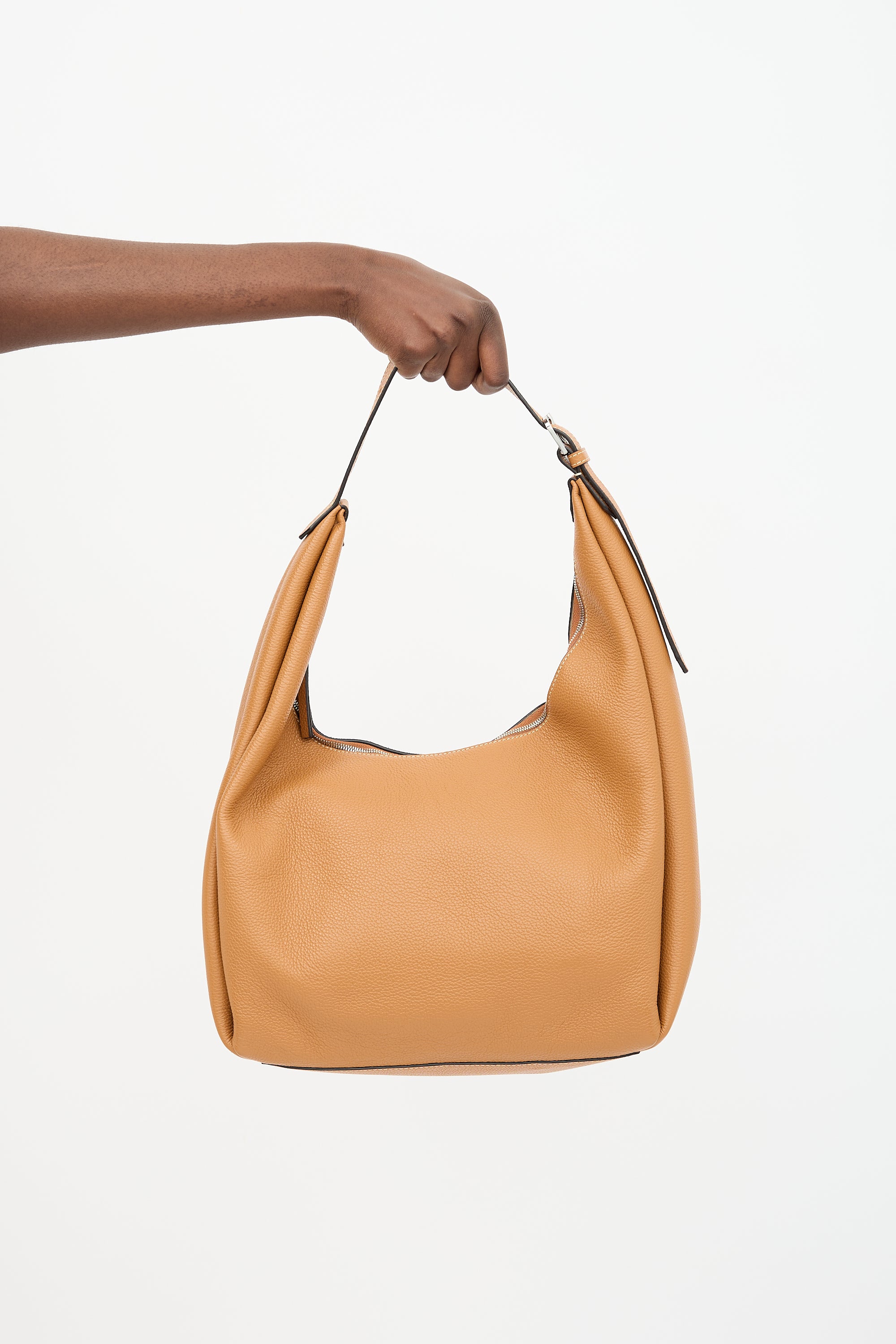 Pre-owned Toteme brown grained leather hobo bag featuring single adjustable shoulder strap with logo plaque, silver tone hardware, top zip closure, and one main compartment with one slip pocket and two card slots. Comes with original dust bag.