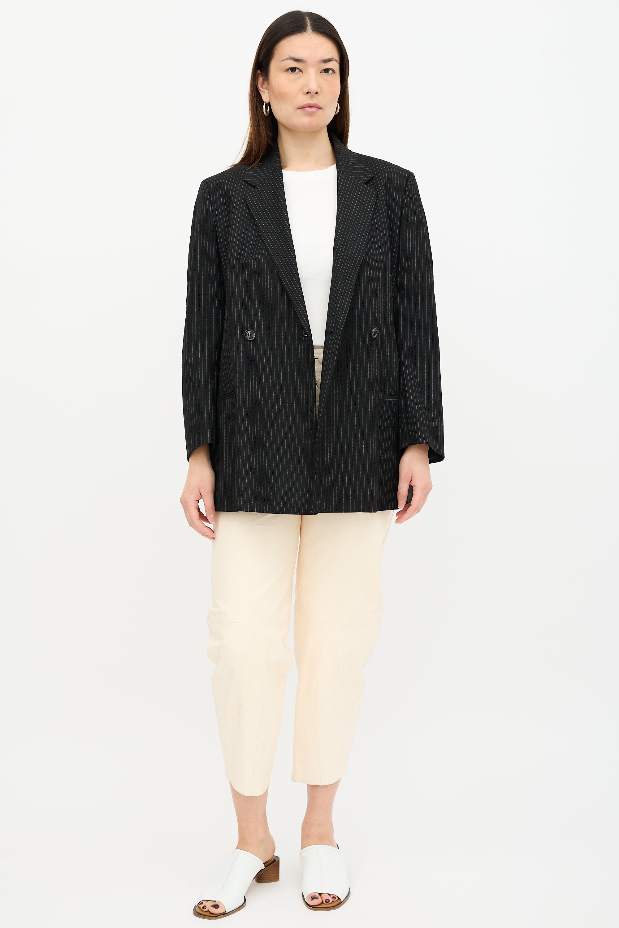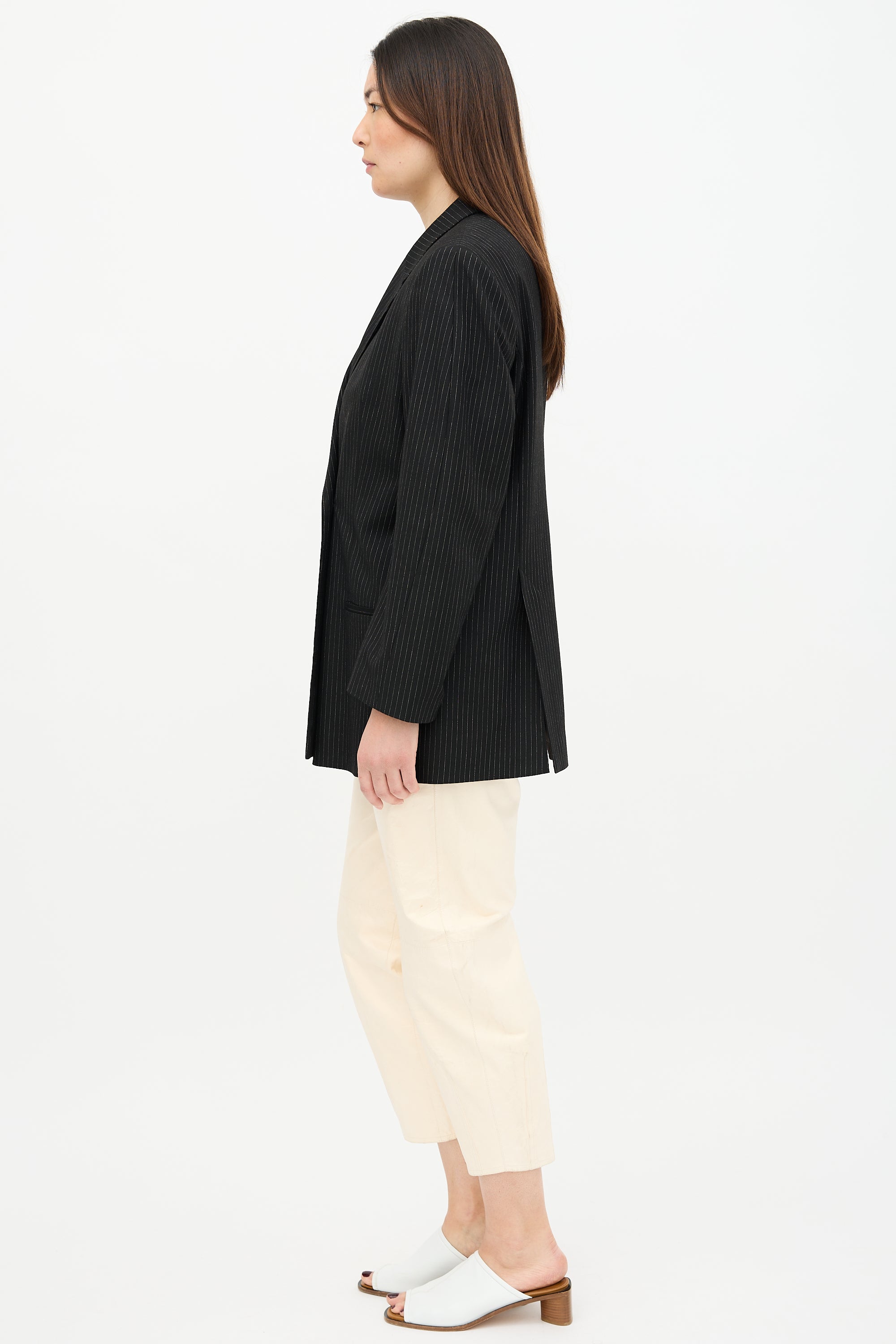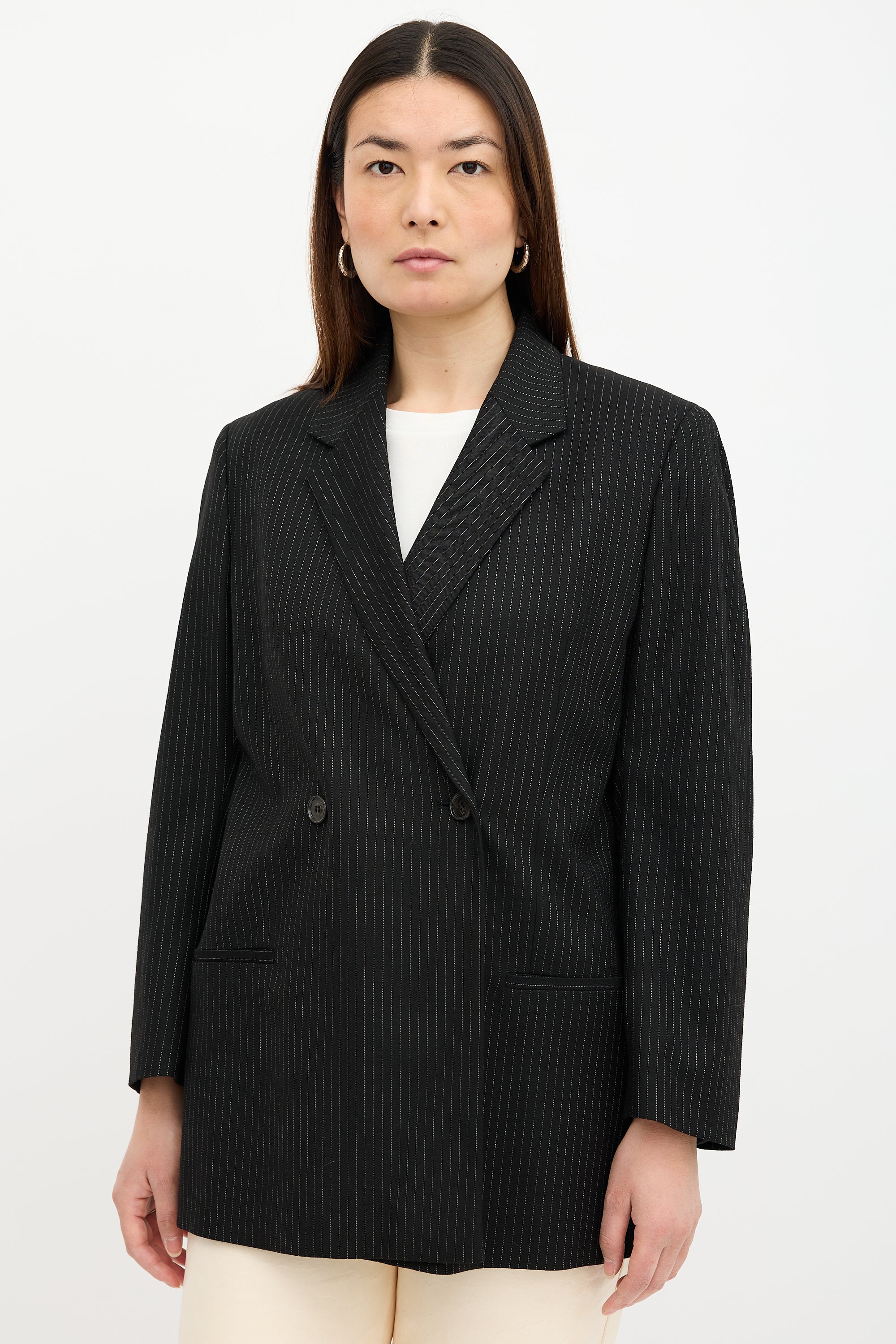 Pre-owned Toteme black oversized blazer featuring white pinstripes, peak lapel, double breasted button closure, two welt pockets, and back double vent. Lined.