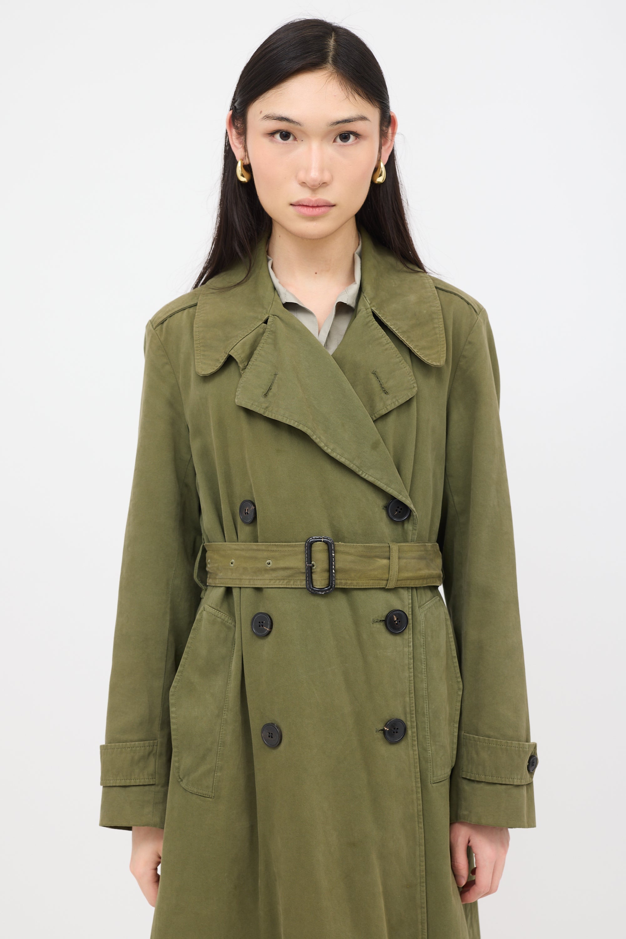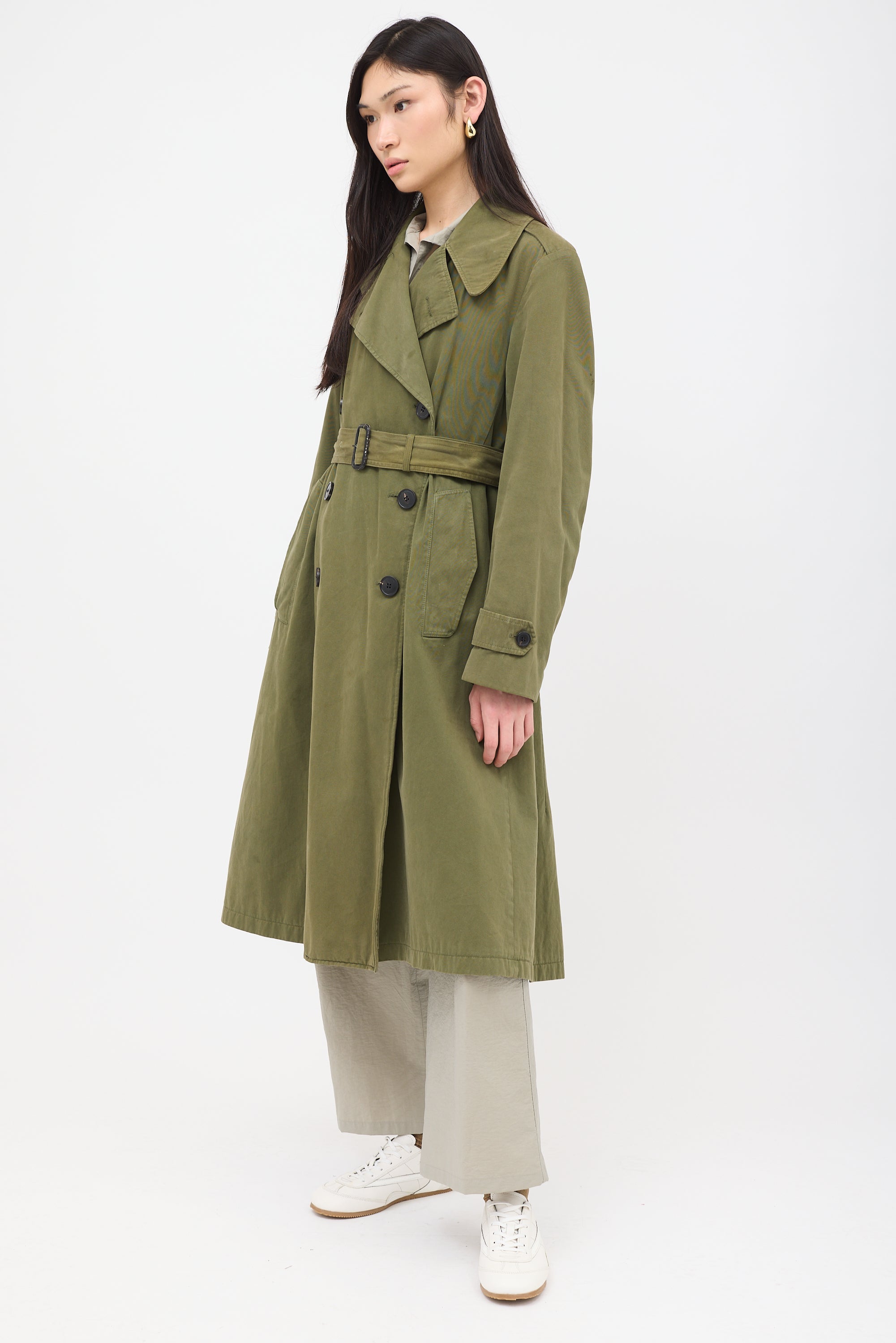 Pre-owned Dries Van Noten green trench coat featuring wide notched collar, button front, adjustable belt, two flap pockets, and convertible back vent. Lined.