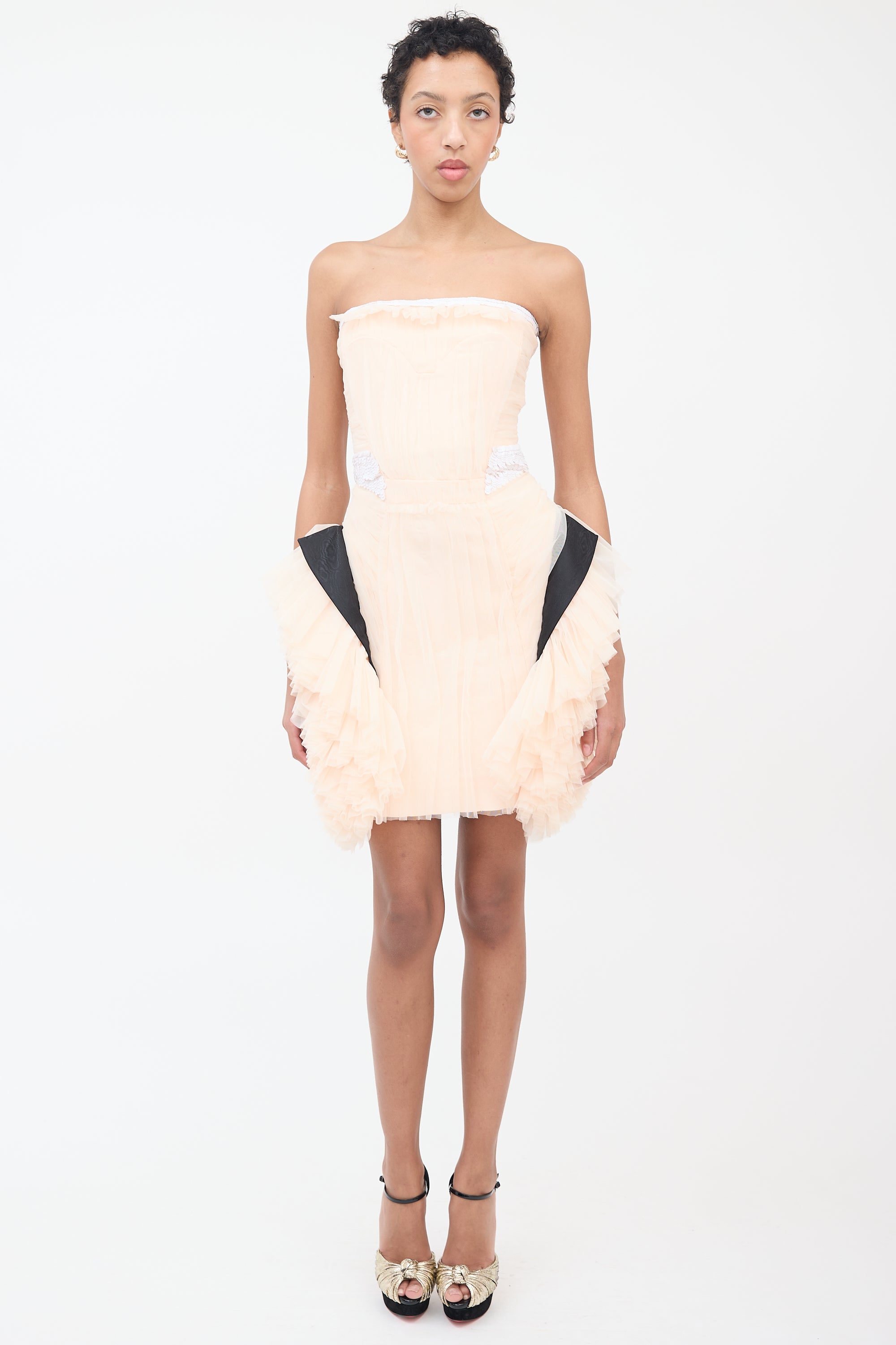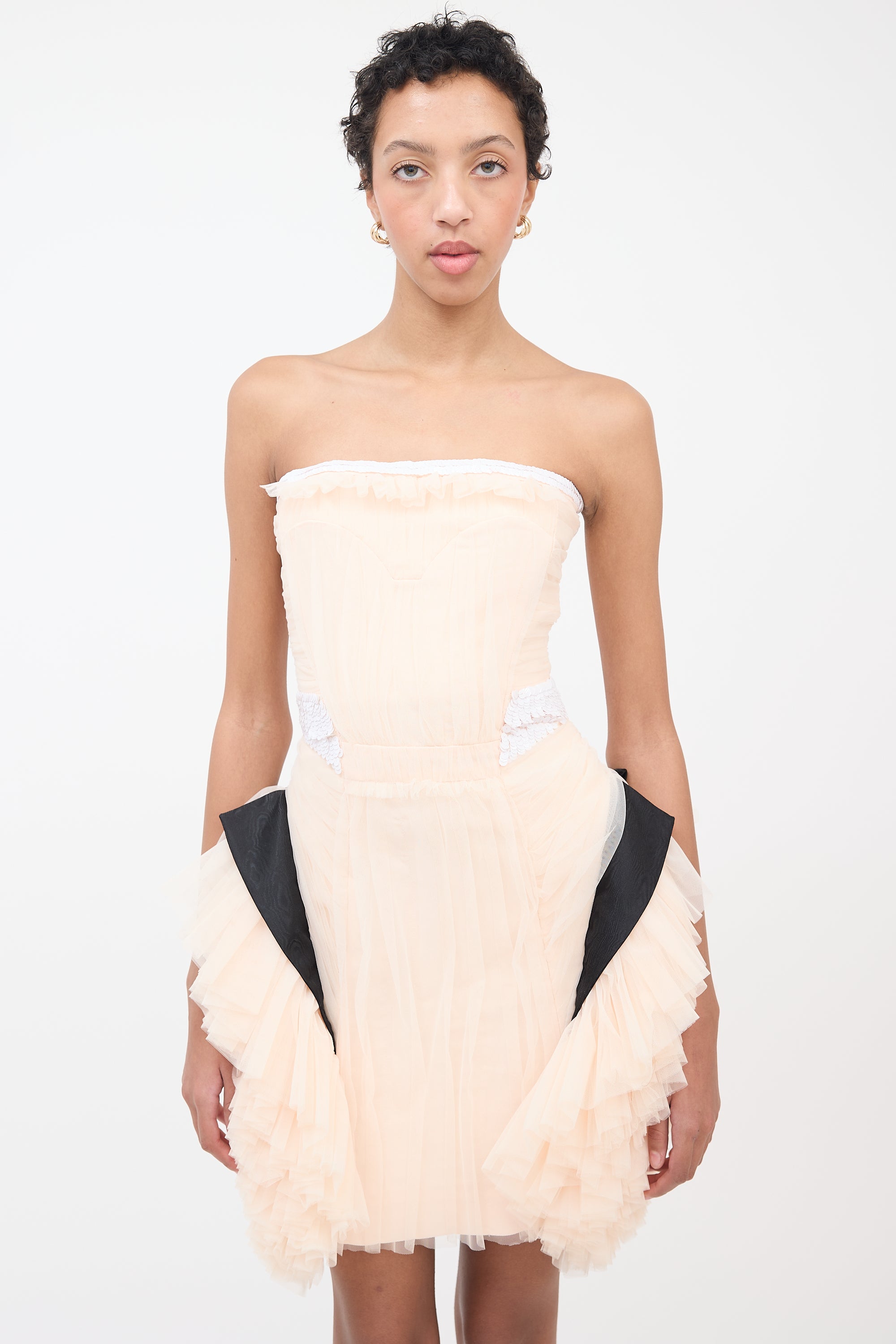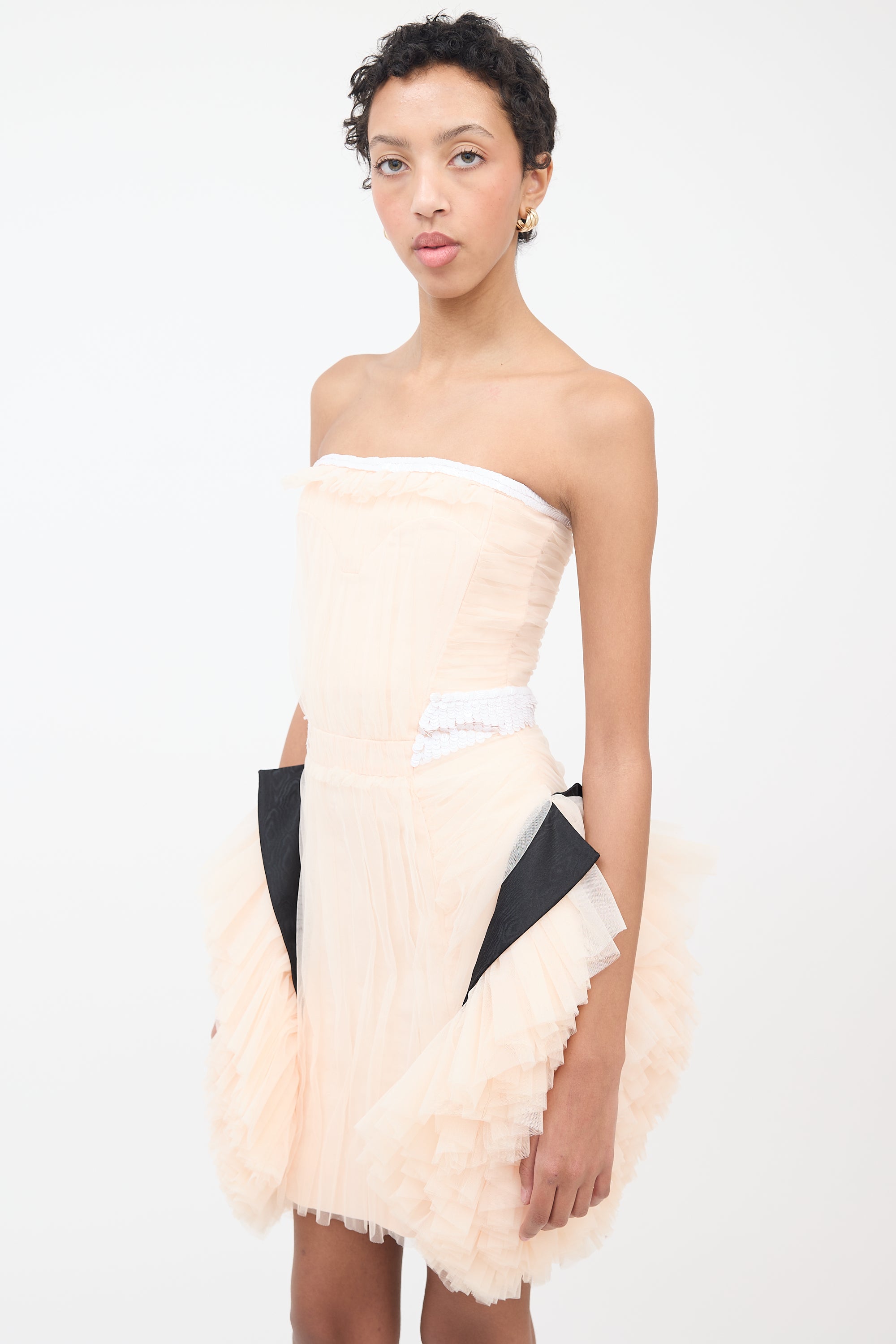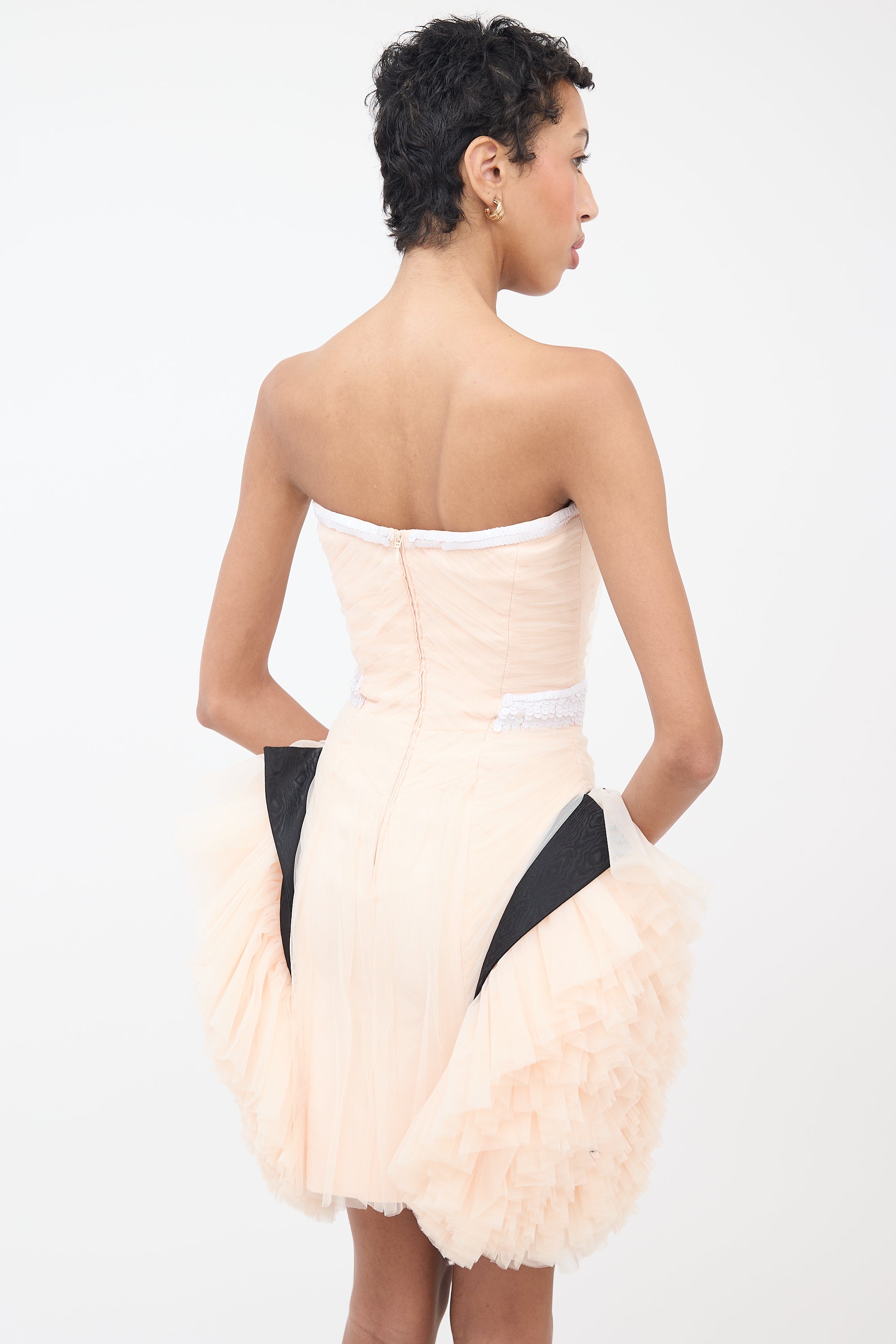 Viktor & Rolf pink tulle strapless dress featuring white sequin embellishment trim at straight neckline and waist, interior corset with boning and back zip closure, tiered tulle construction at hips with contrast black paneling, and back zip closure. Lined.