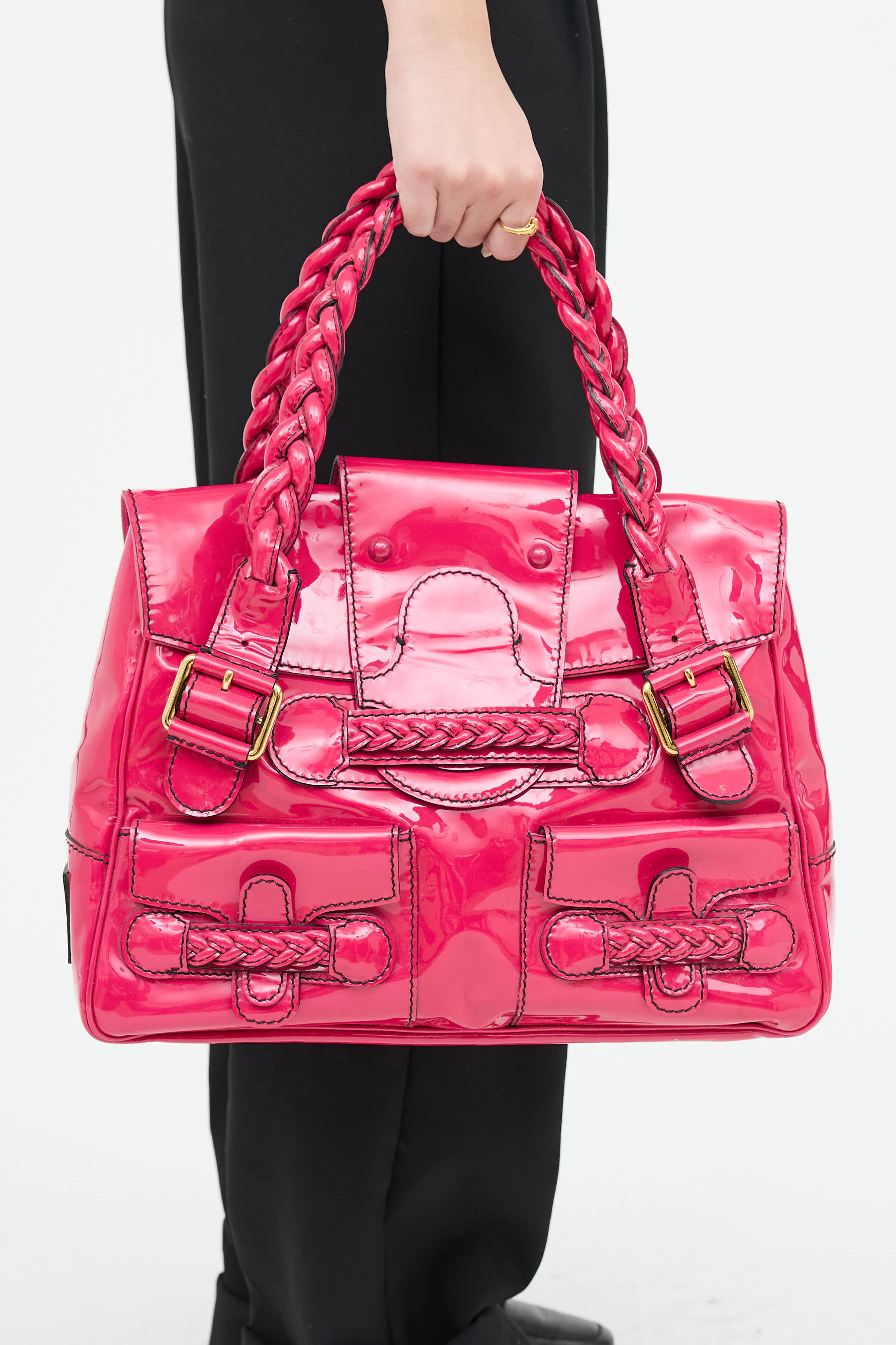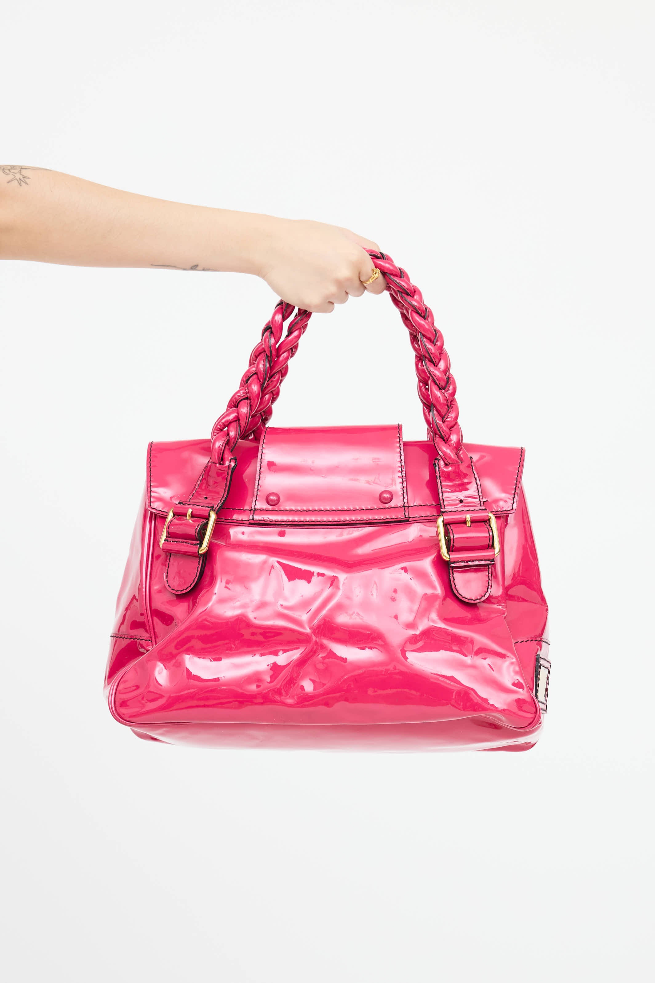 Pre-owned Valentino pink patent leather bag featuring two woven handles, two flap pockets at front, gold tone hardware, logo plaque at side, flap closure, interior lined in woven textile and one internal zip pocket.