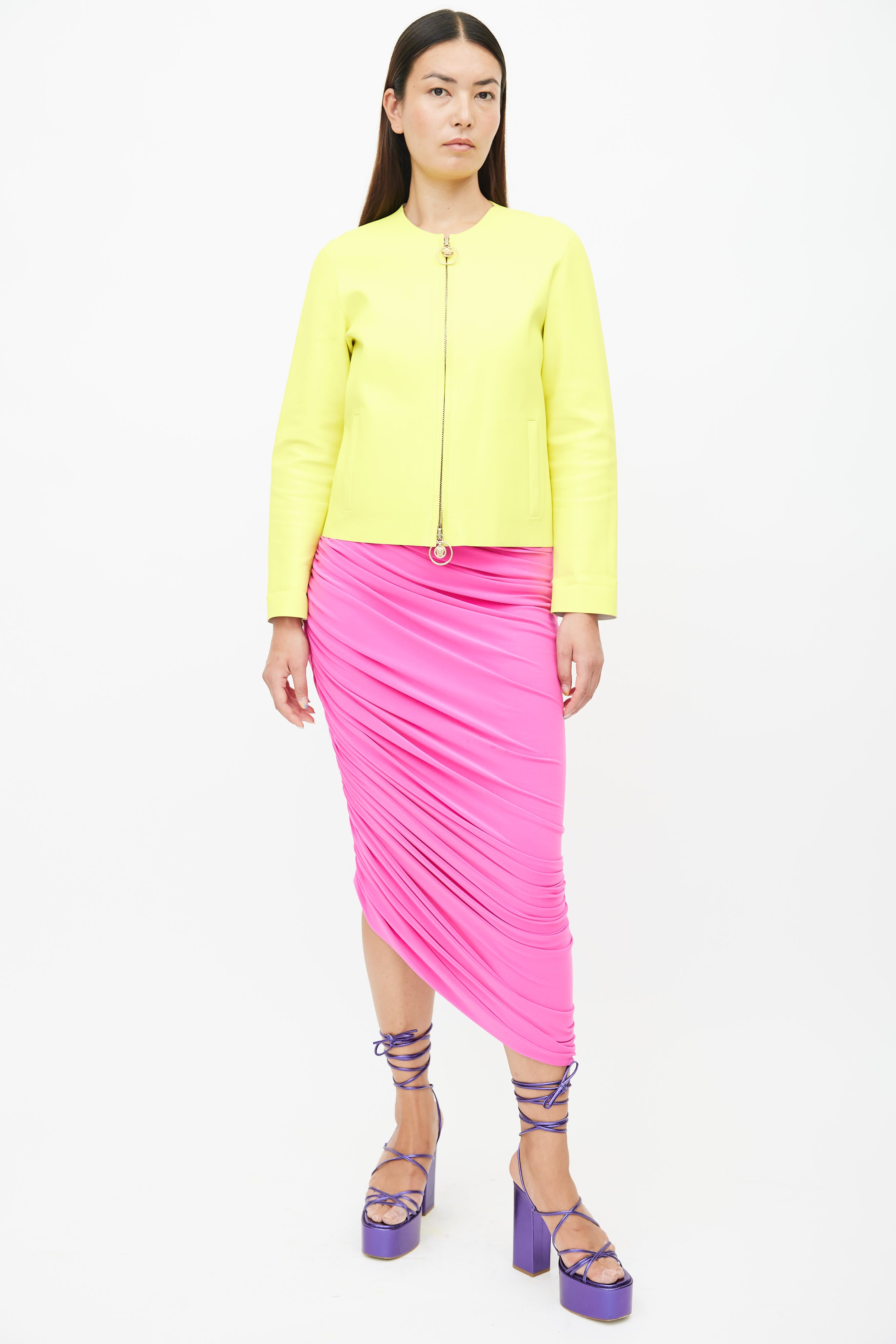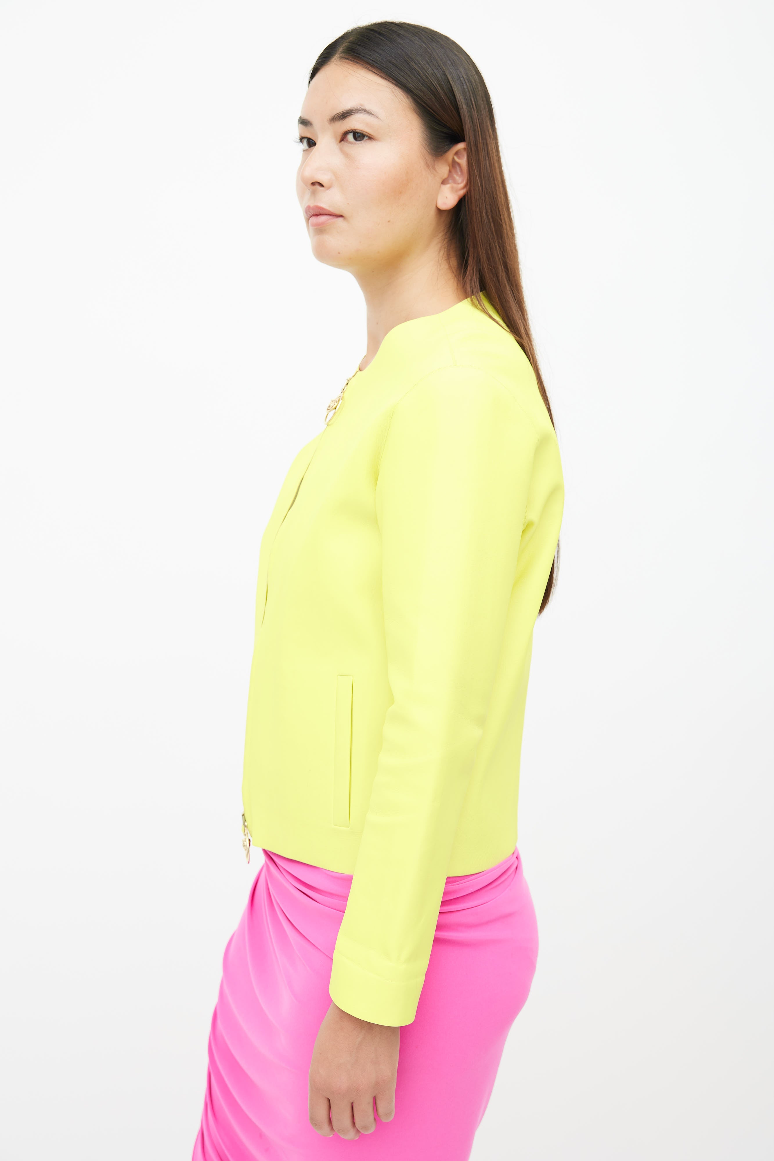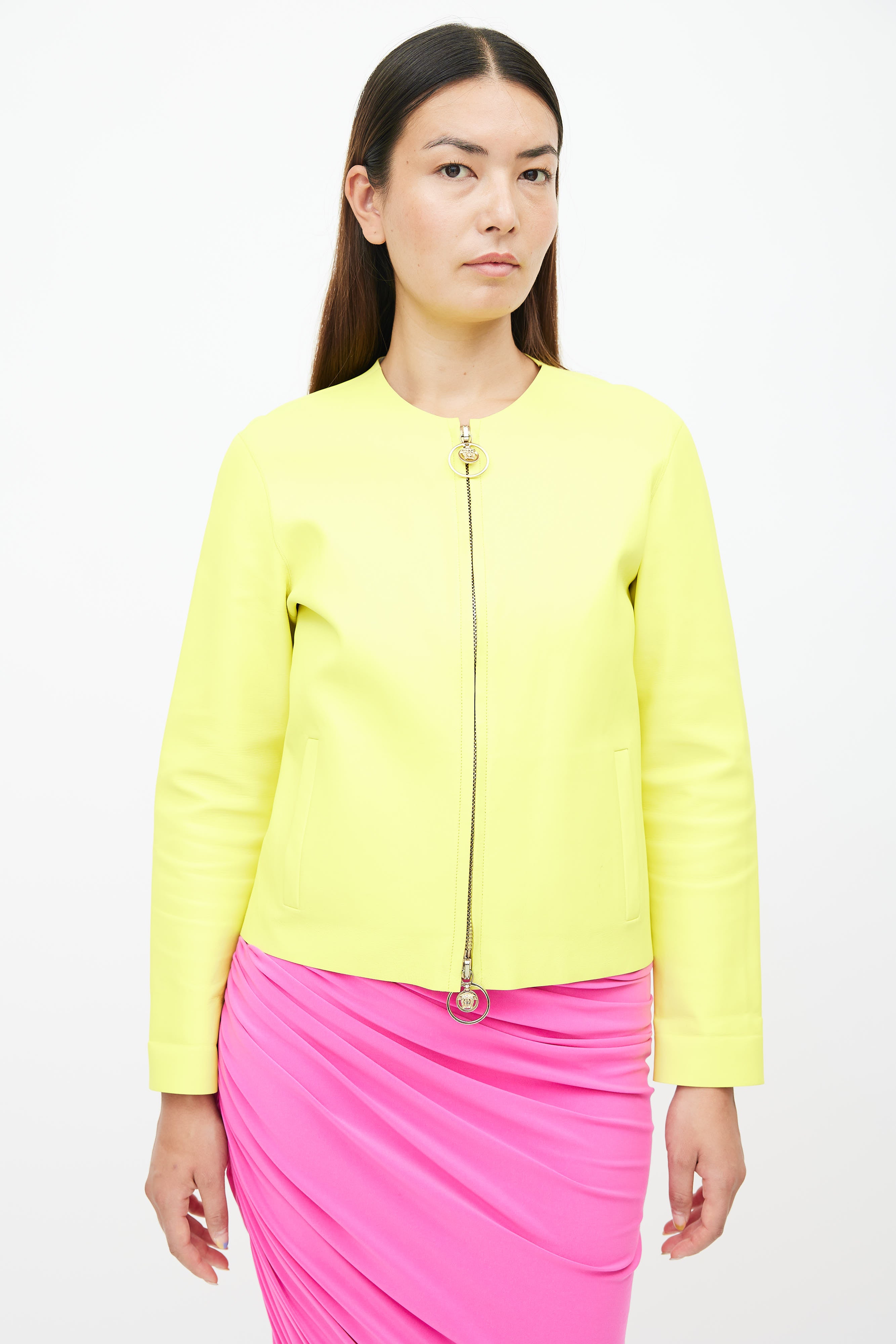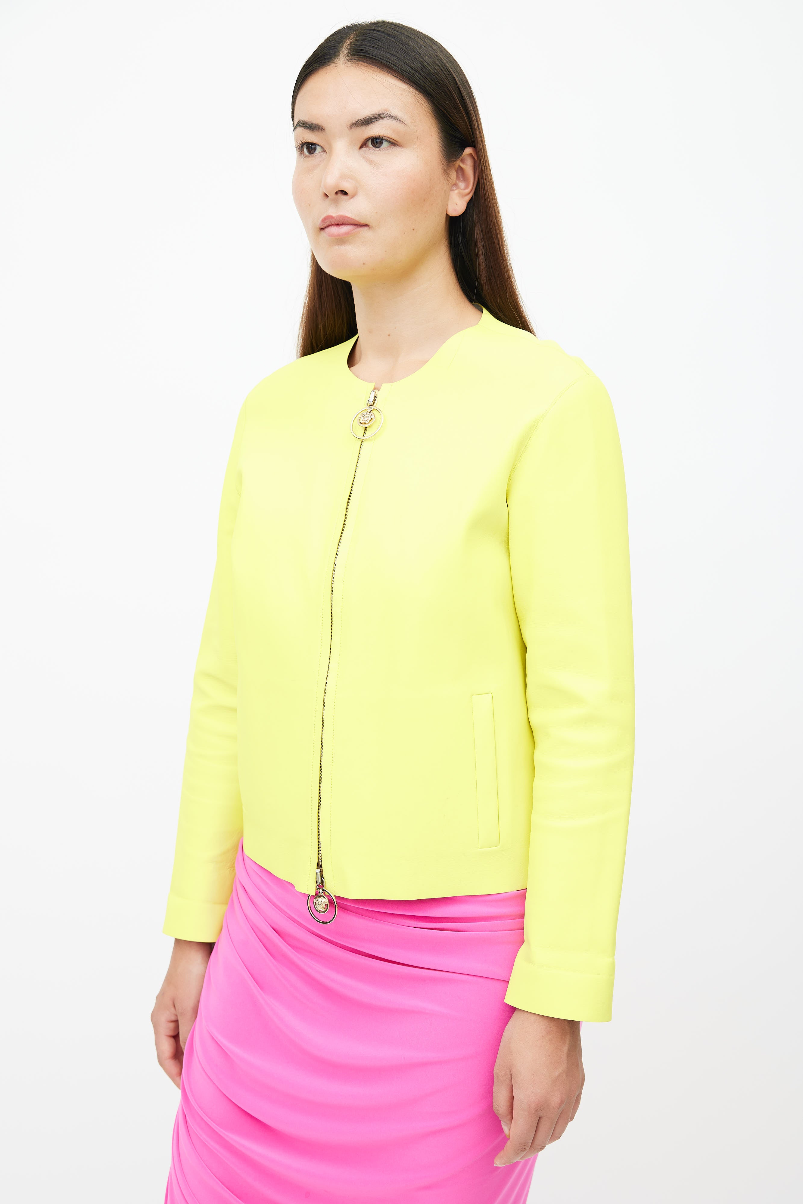 Pre-owned Versace neon yellow leather jacket featuring round neckline, contrast stitching, two welt pockets at side, and full zip closure with gold tone Medusa charms.