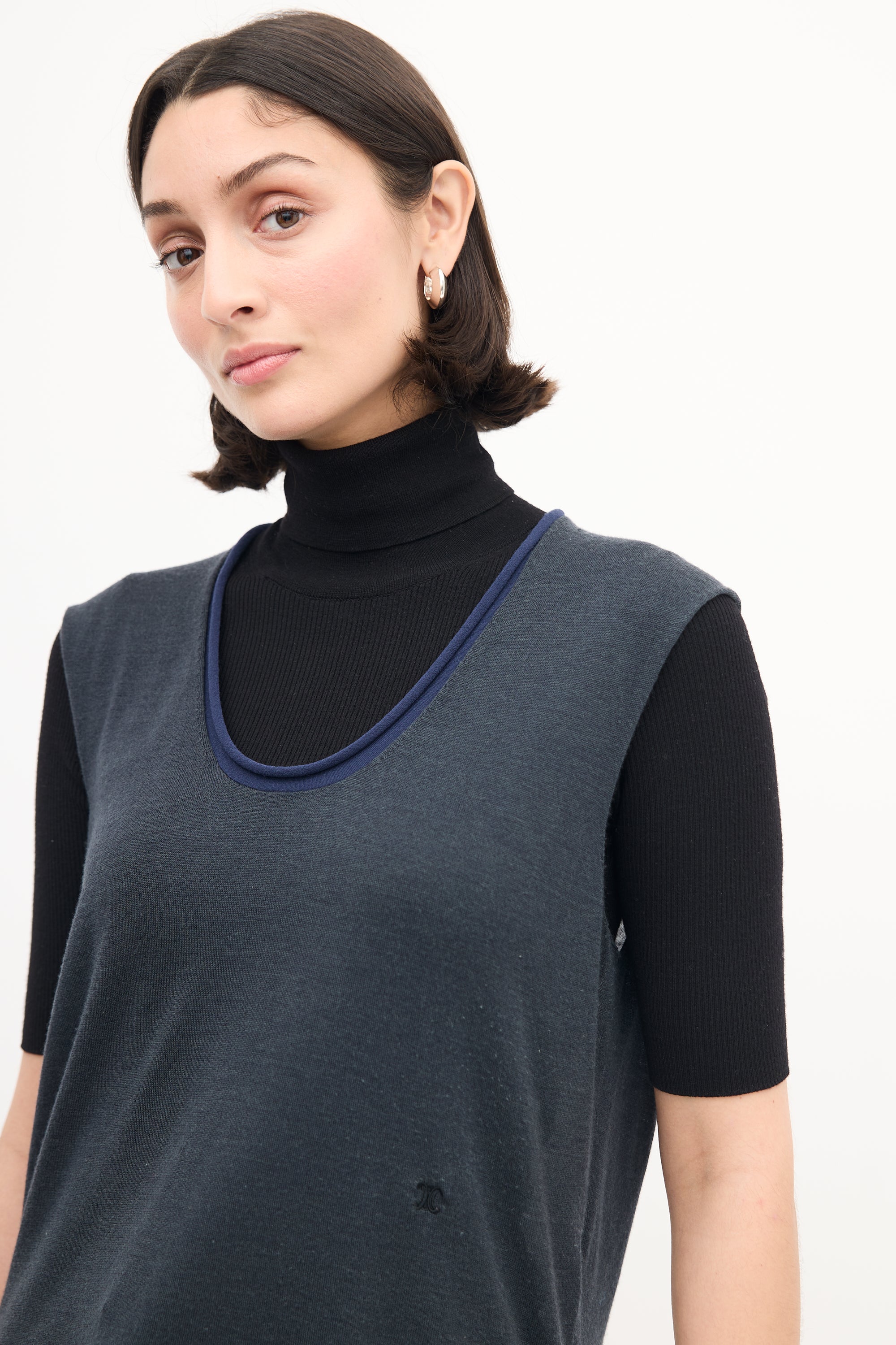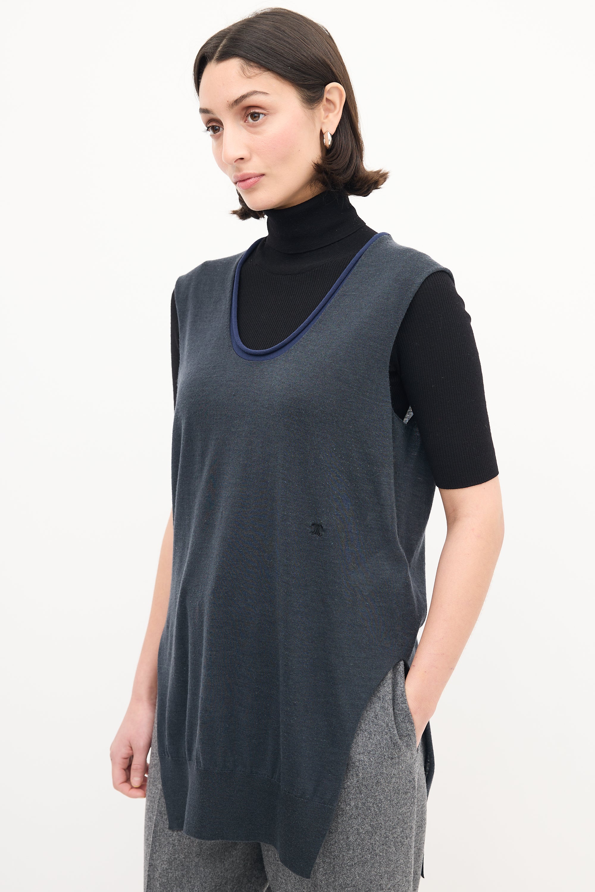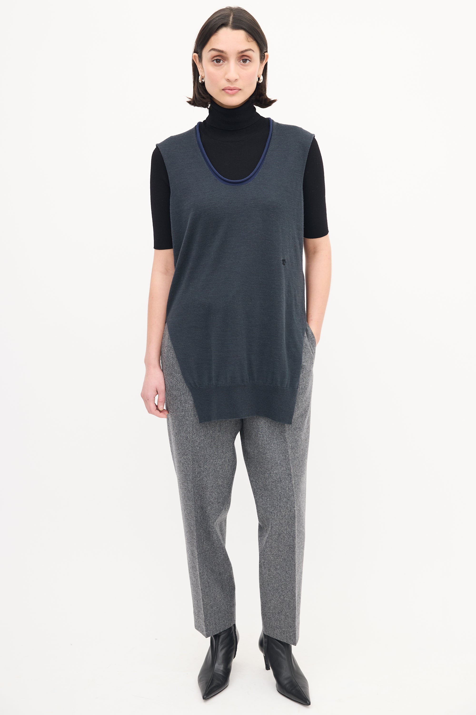 Pre-owned Celine grey wool and silk blend vest featuring scoop neckline featuring navy rolled trim, black embroidered Triomphe logo, side slit, and raw trim.