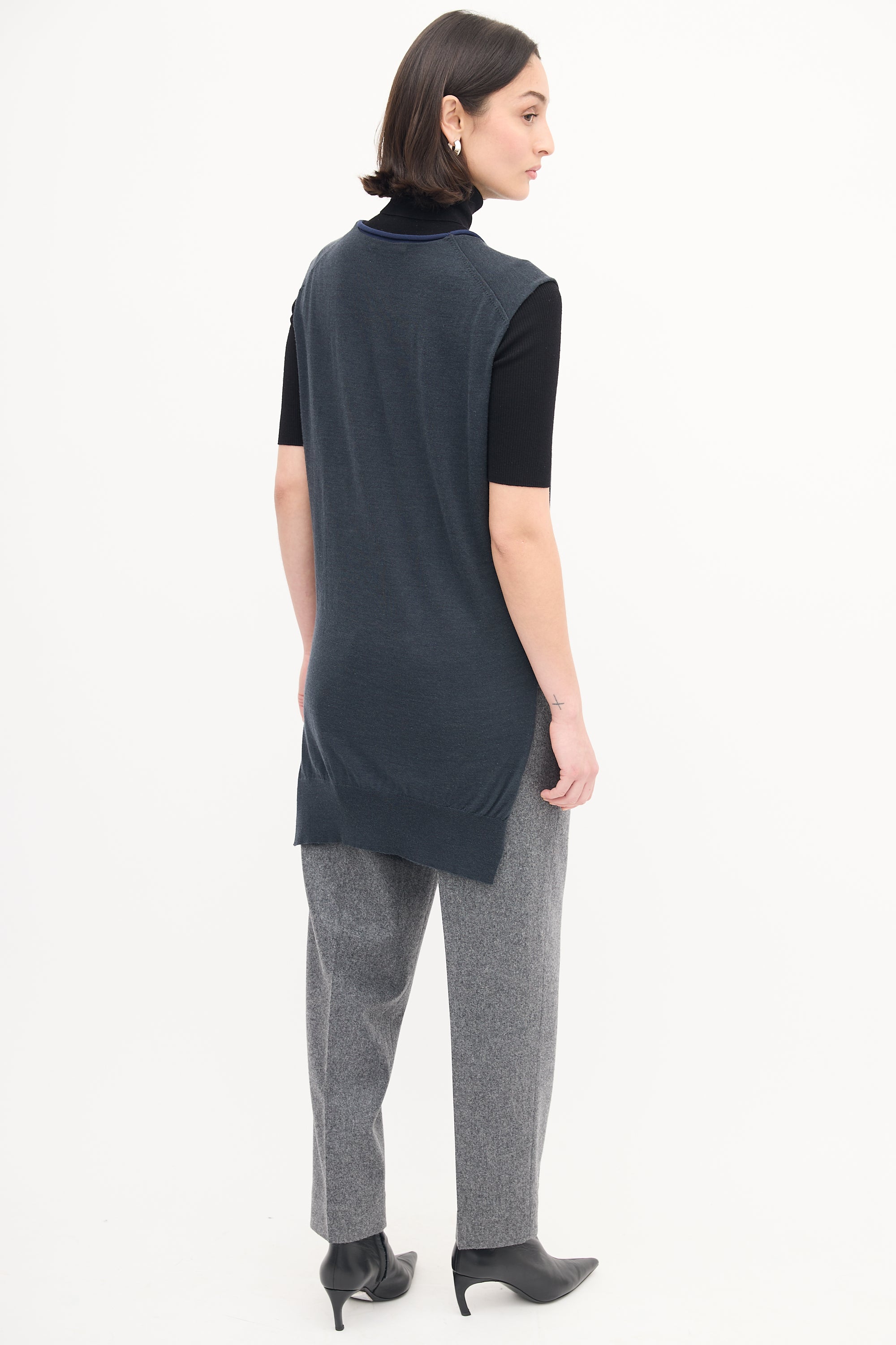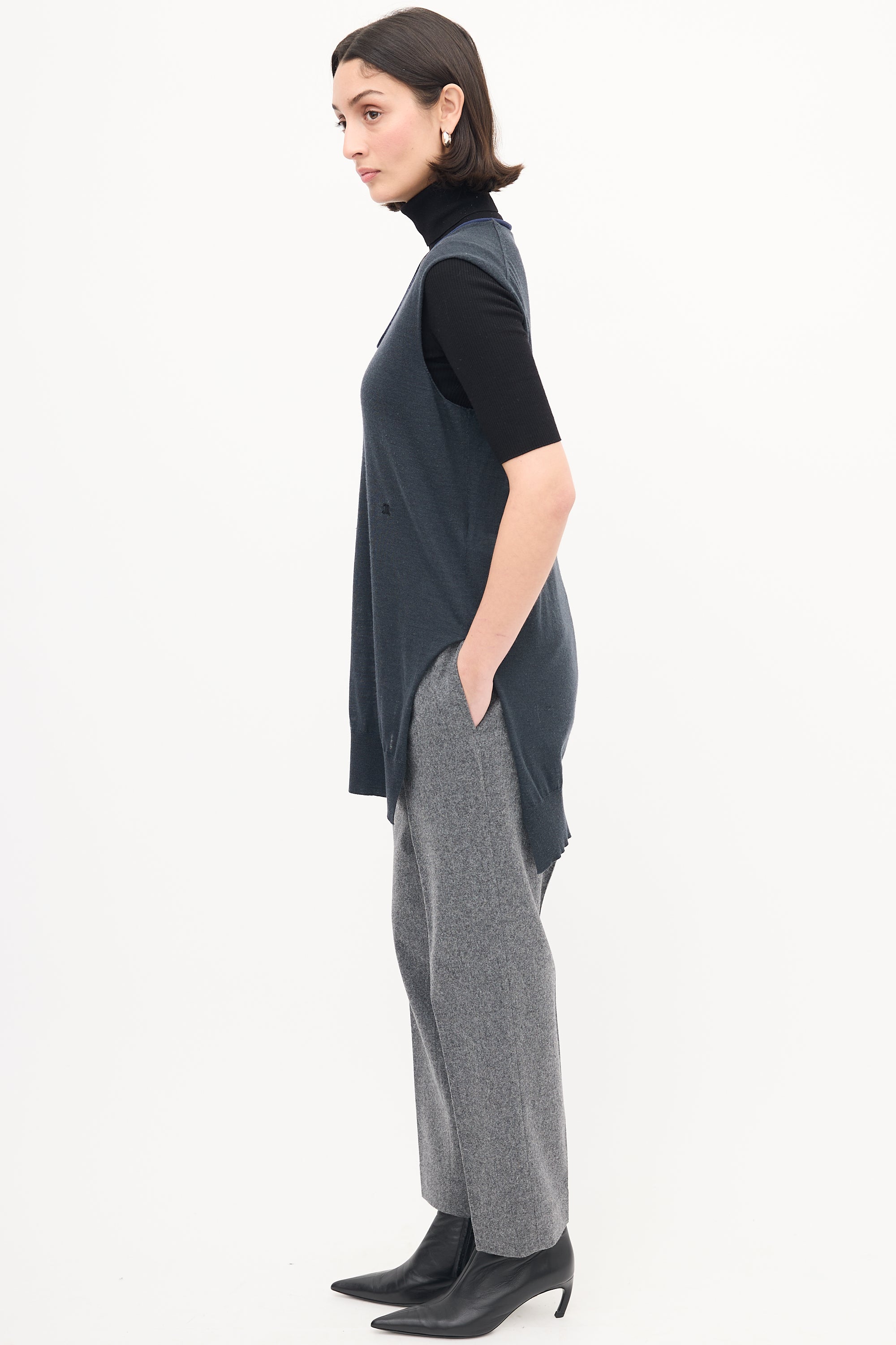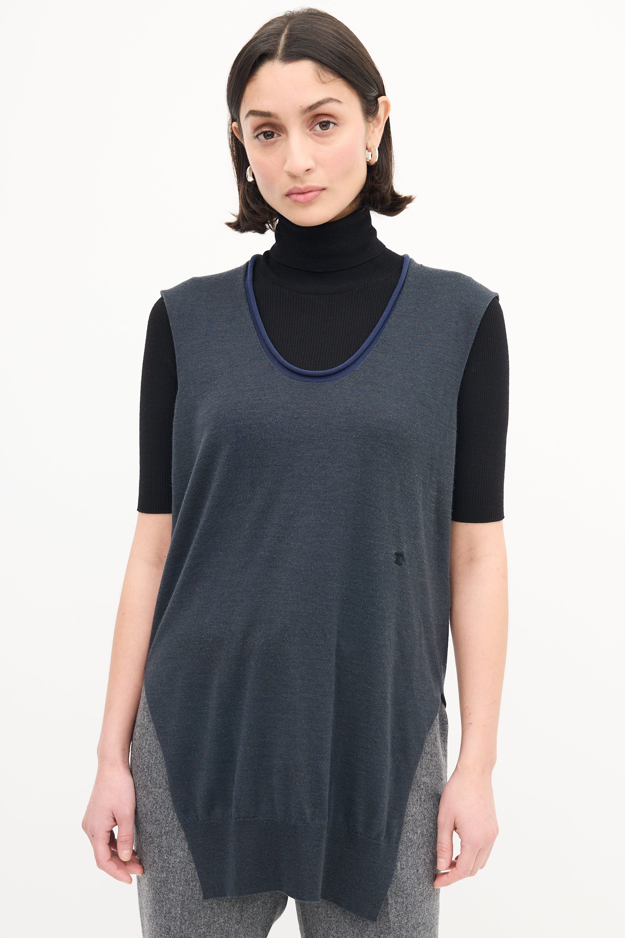 Pre-owned Celine grey wool and silk blend vest featuring scoop neckline featuring navy rolled trim, black embroidered Triomphe logo, side slit, and raw trim.