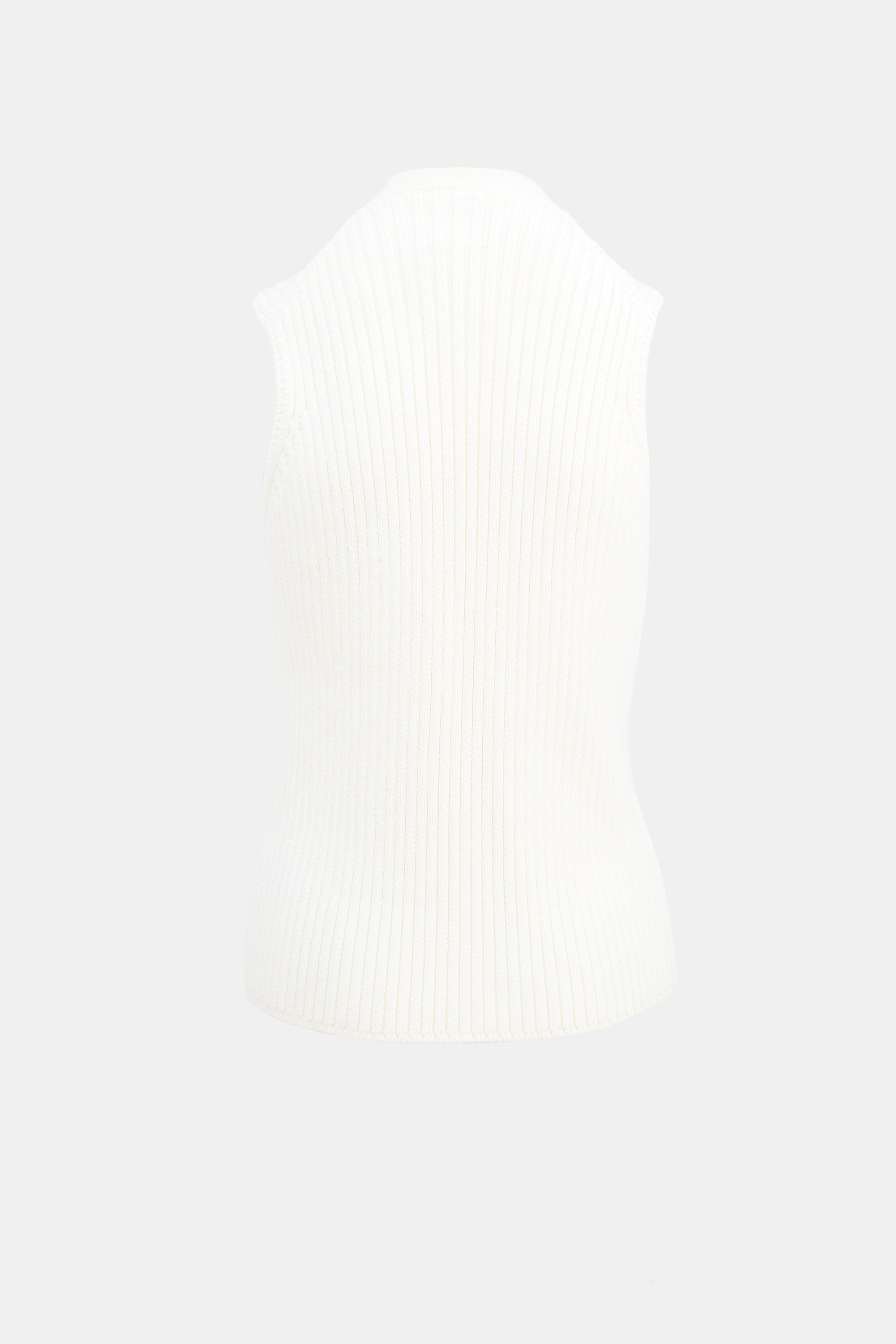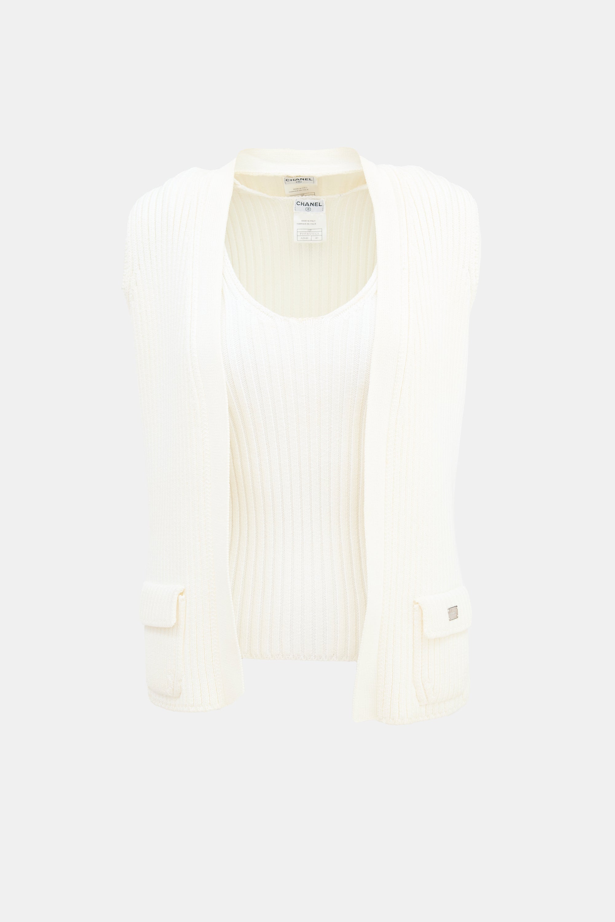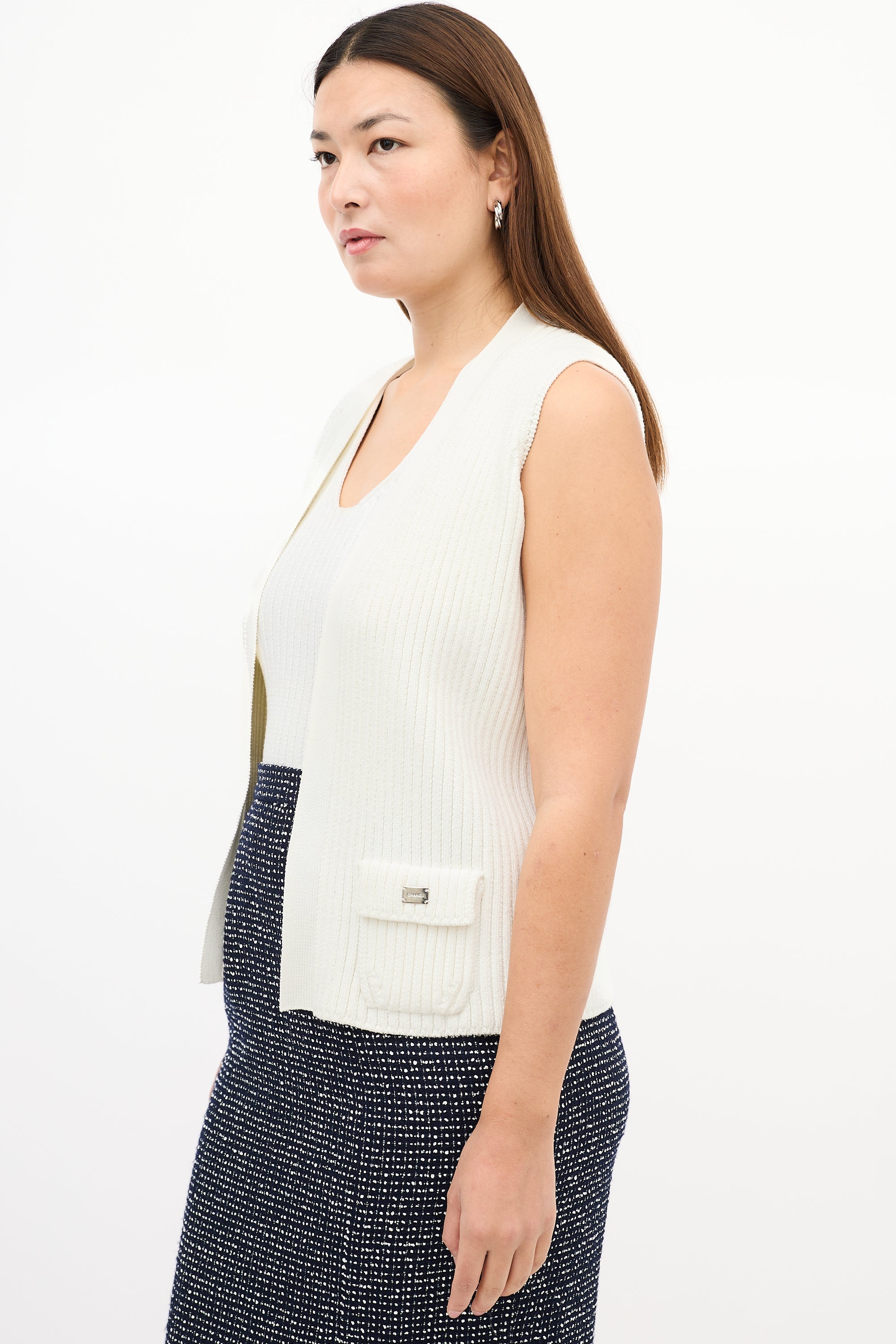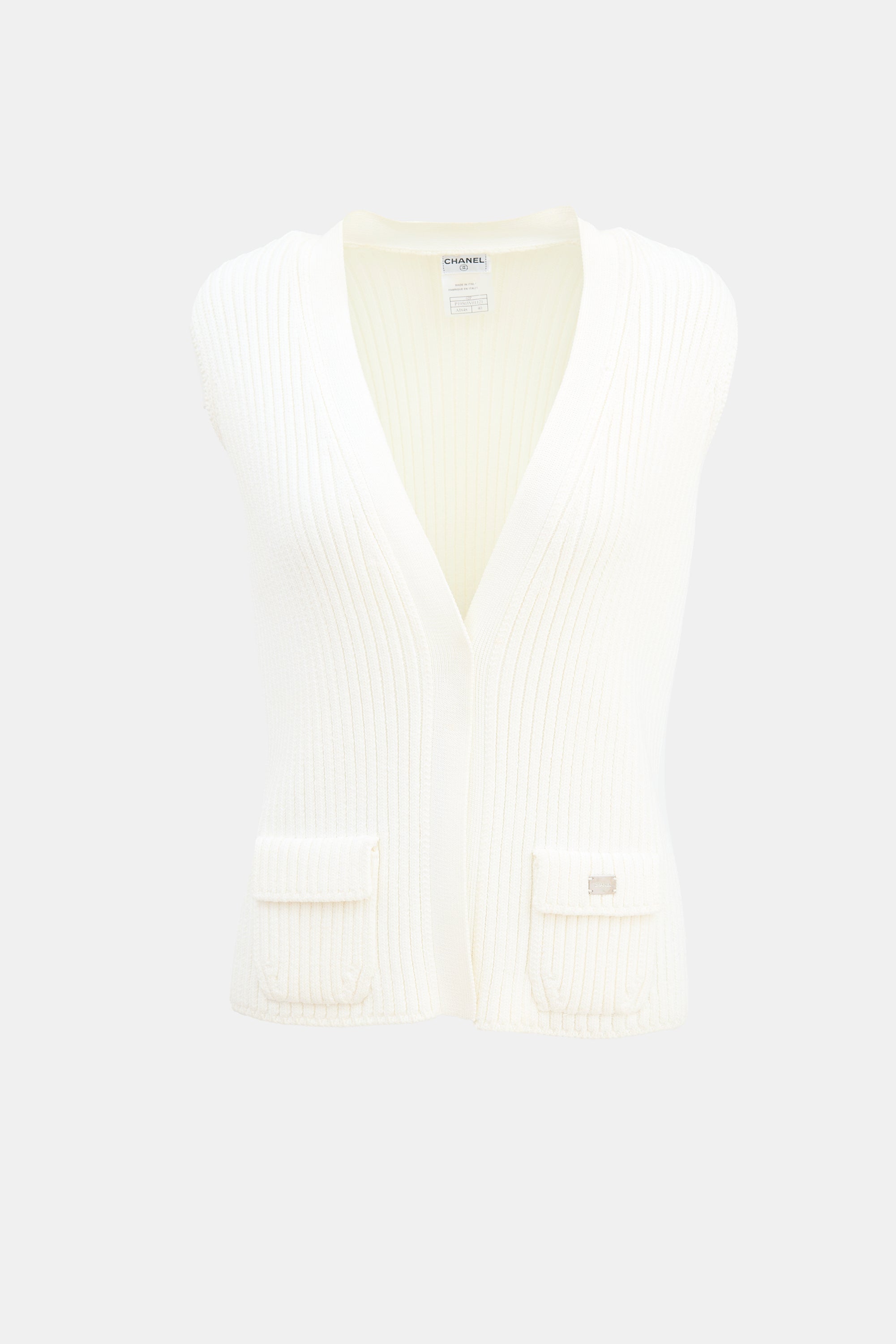 Pre-owned Chanel Spring/Summer 2002 white cotton blend knit vest featuring an open front, two flap pockets at front hip, silver tone etched logo hardware embellishment at left pocket flap, and ribbed placket.