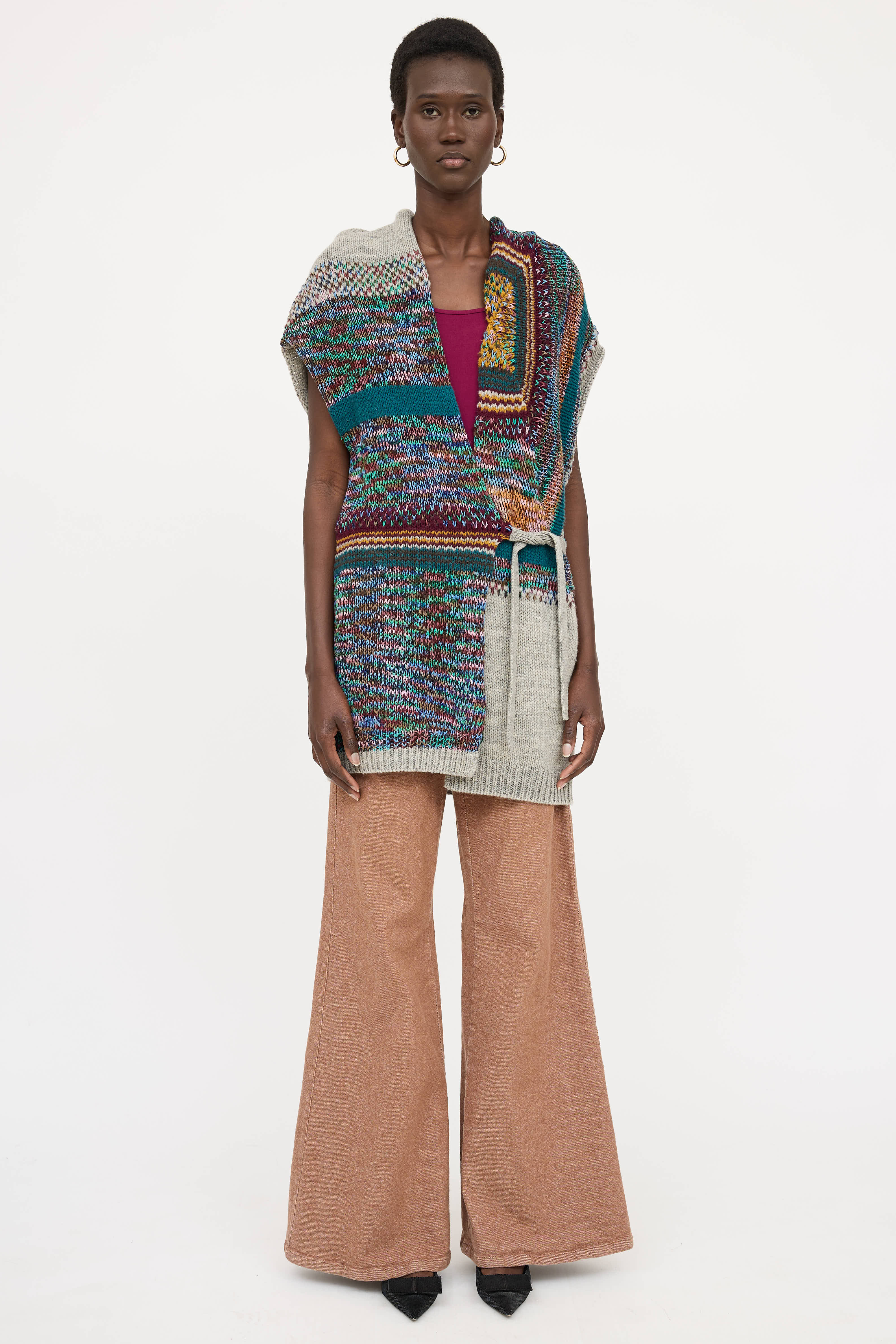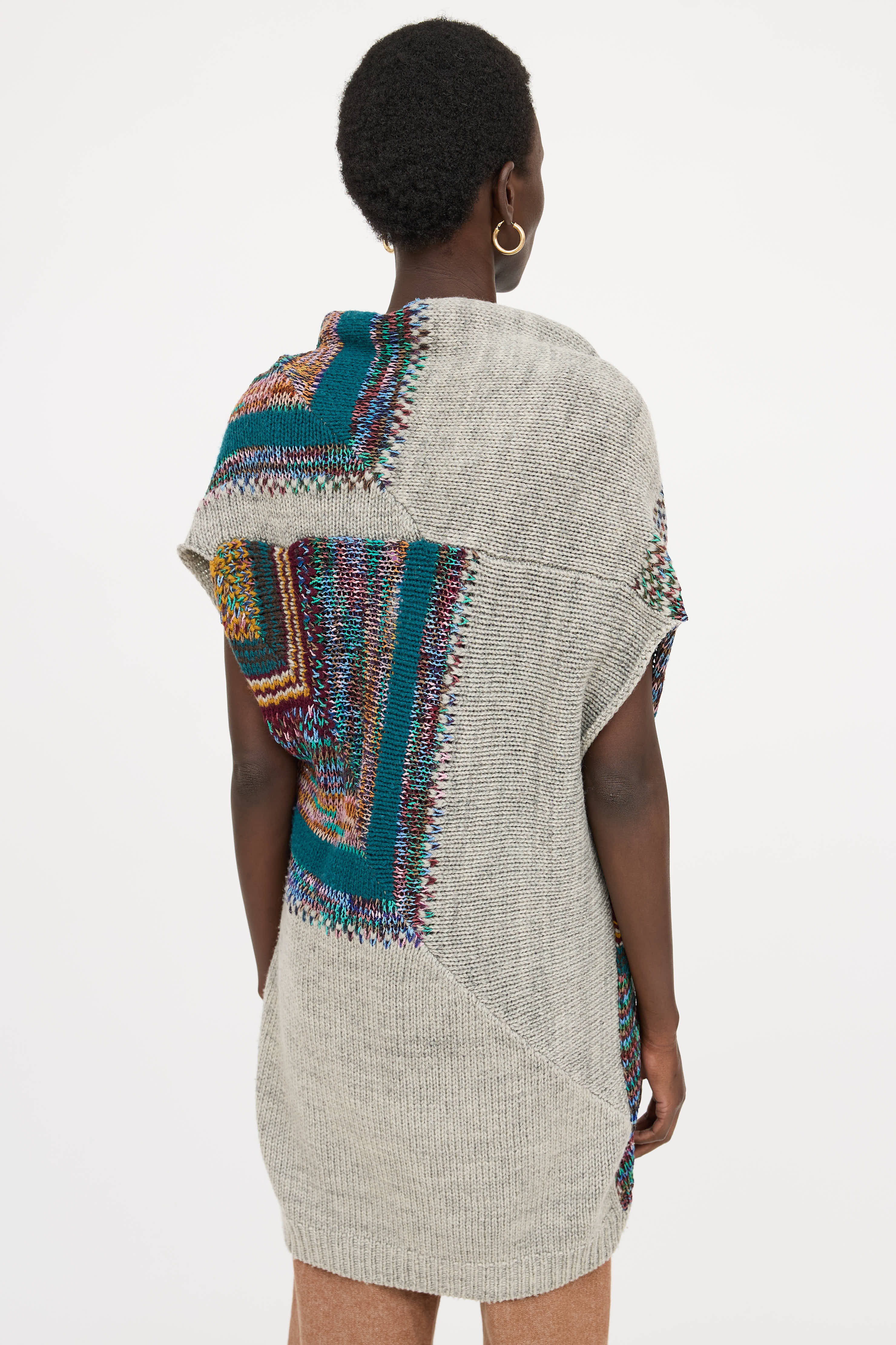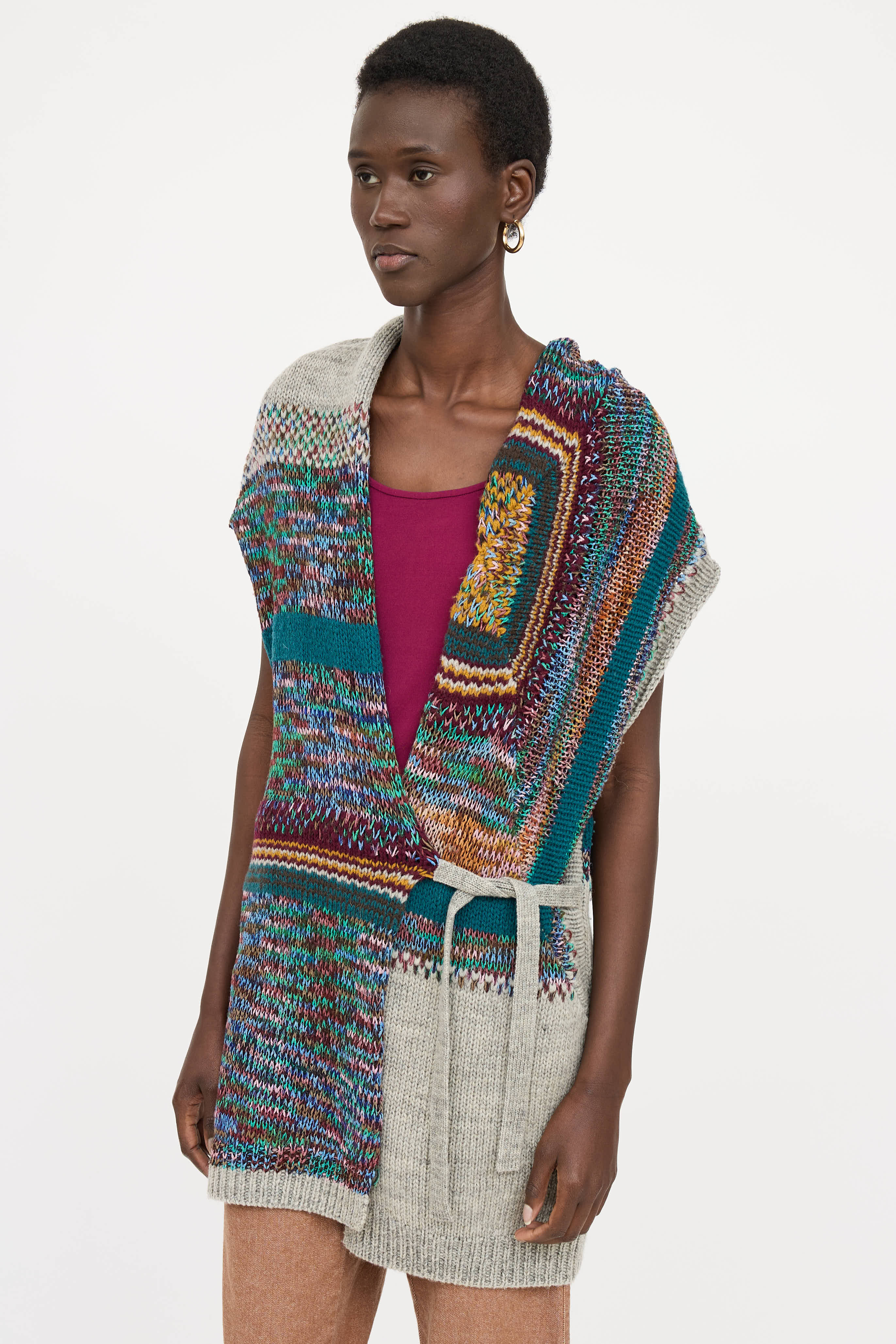 Pre-owned Dries Van Noten grey and multicolour knit vest featuring shawl collar, sleeveless shoulders, and crossover tie closure.