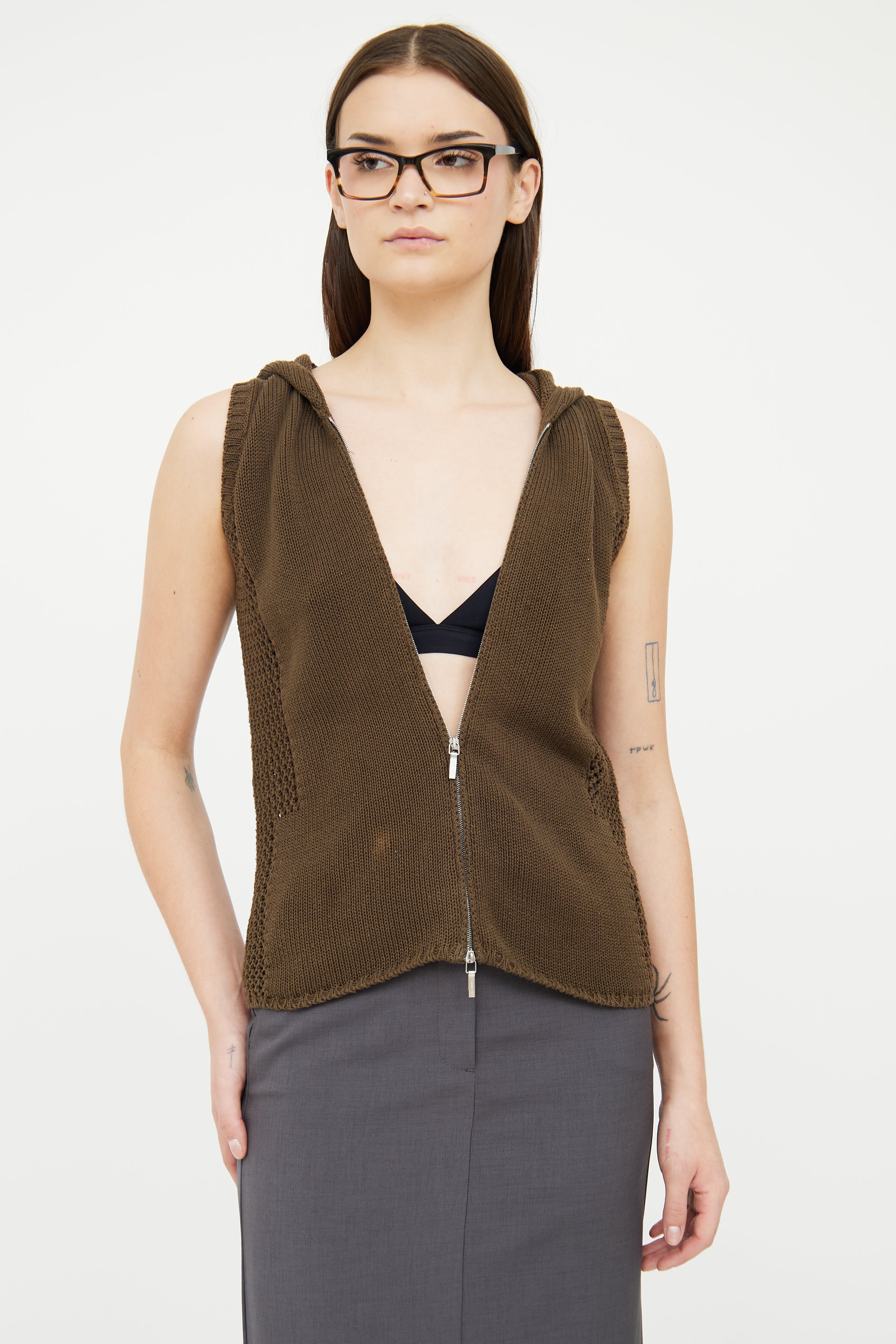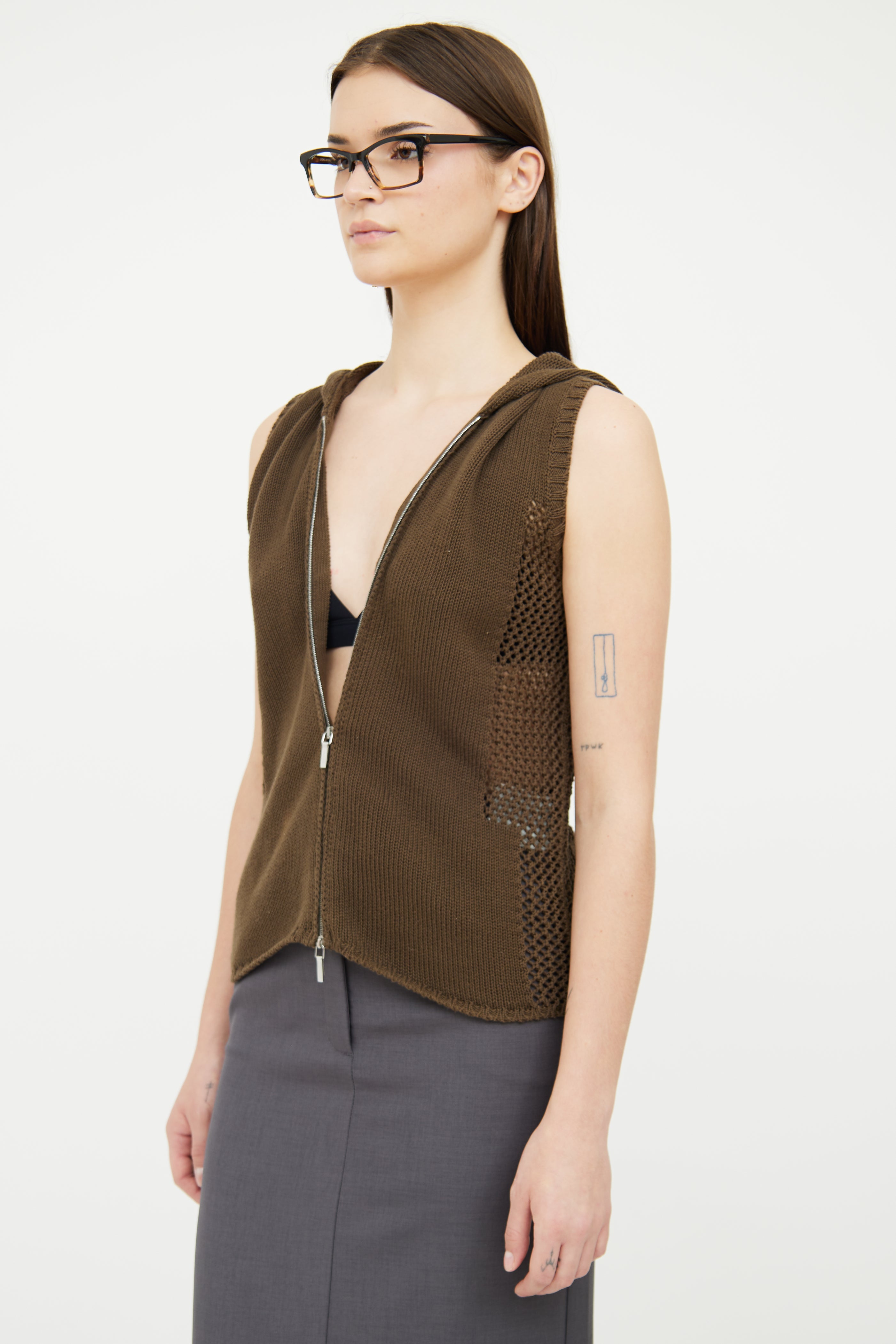 Pre-owned Jil Sander green knit vest featuring hood, woven sheer side detail and zip up front with silver tone hardware.