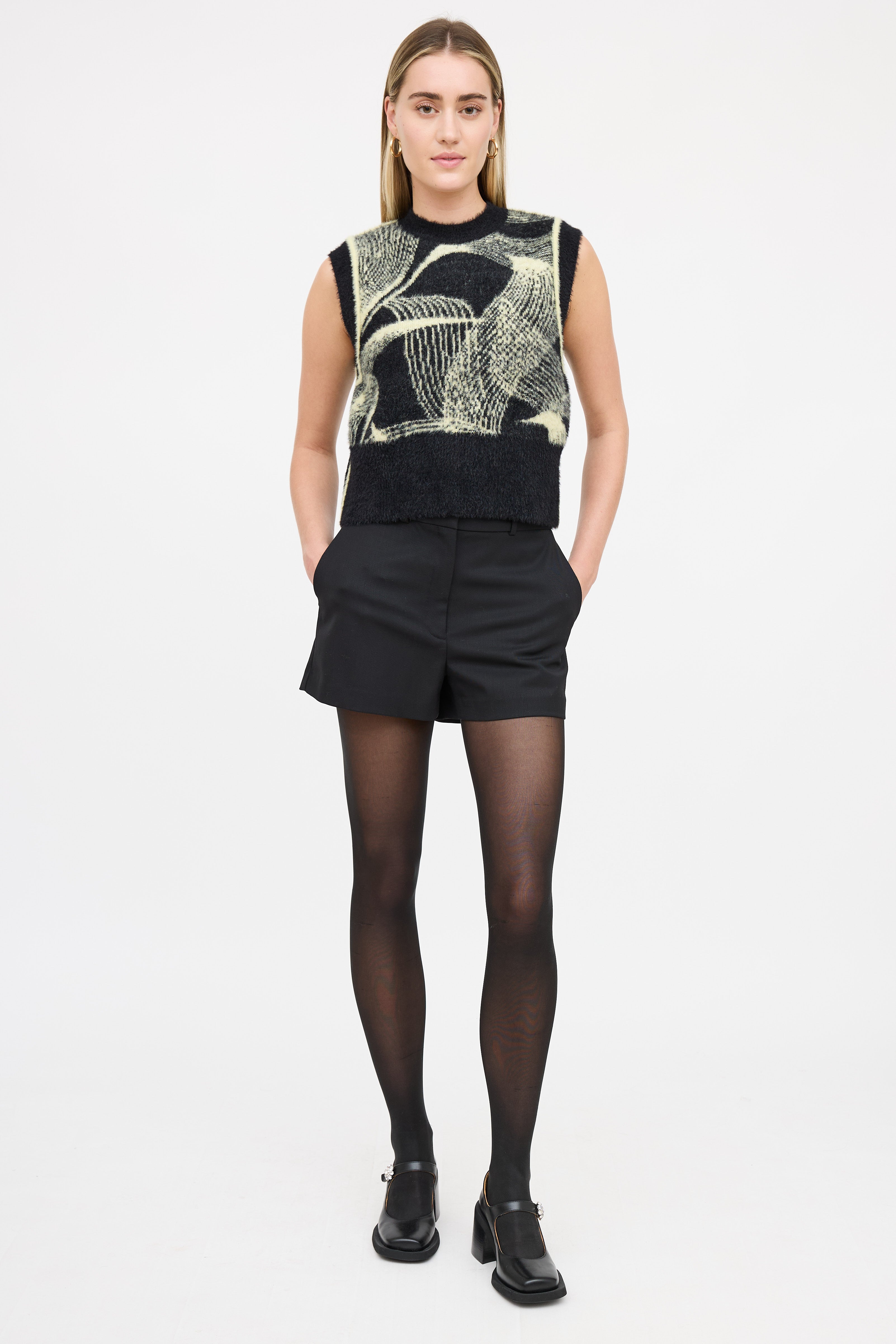 Pre-owned PushBUTTON black and yellow sweater vest featuring round neckline, sleeveless styling, and ribbed hem.