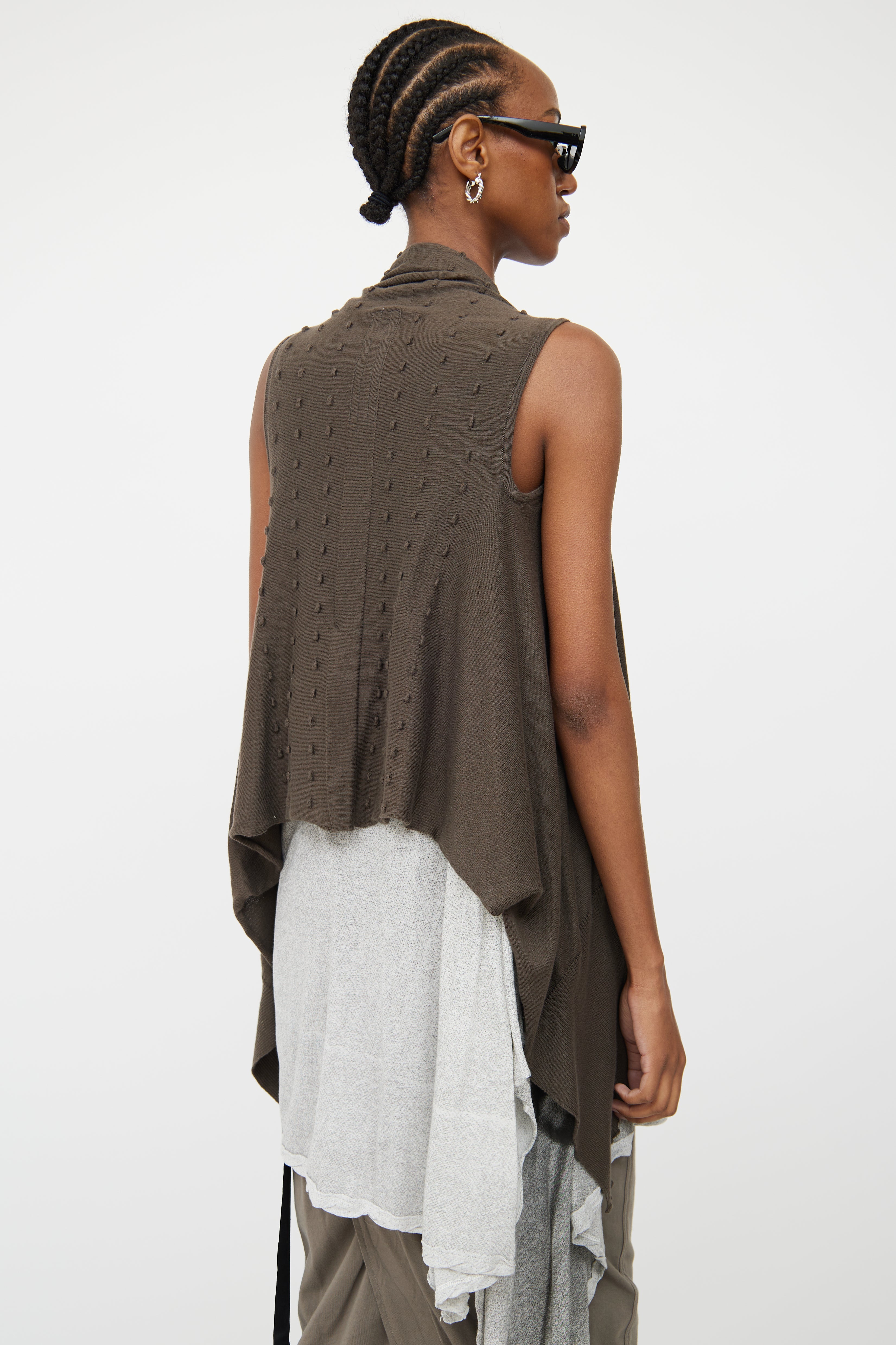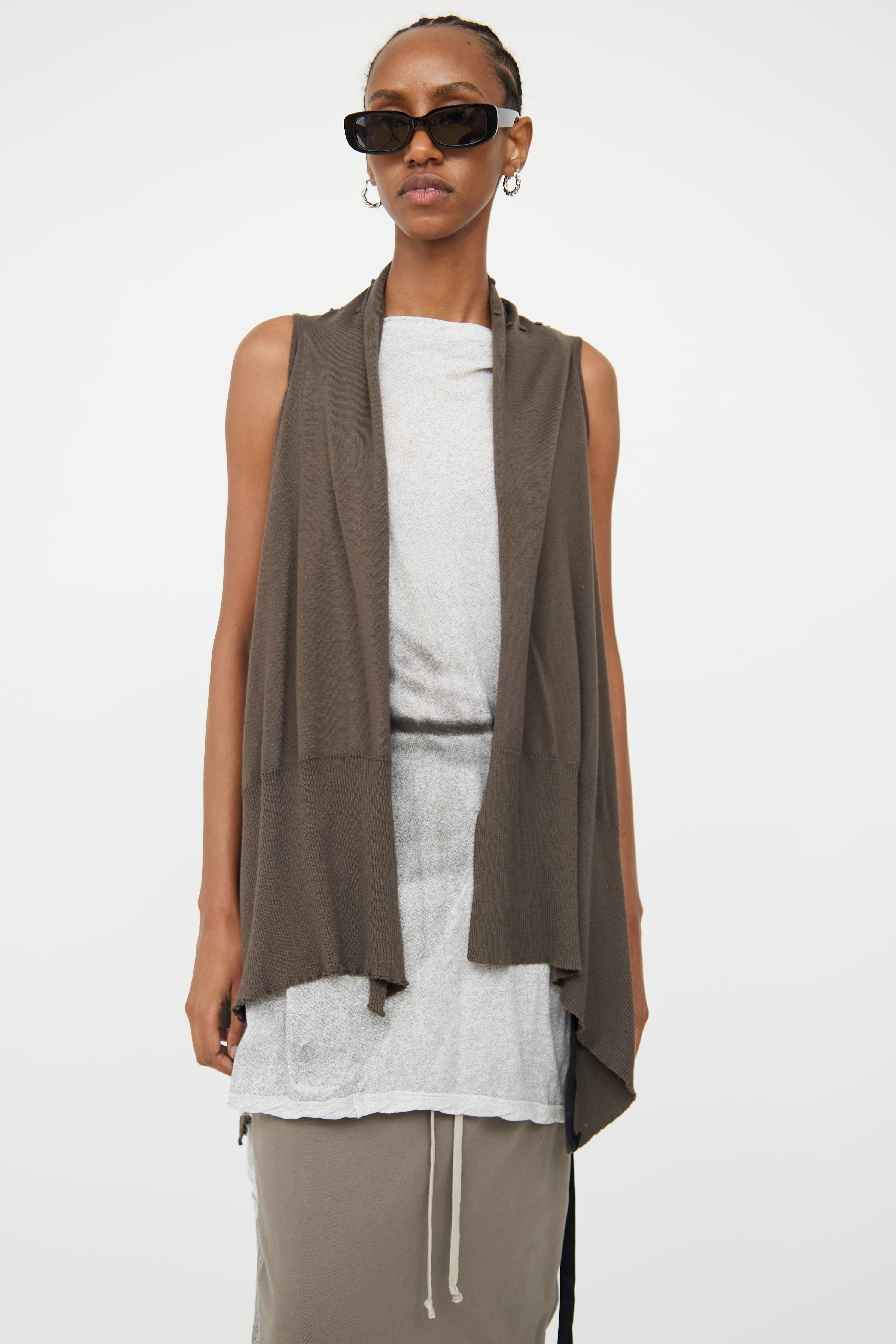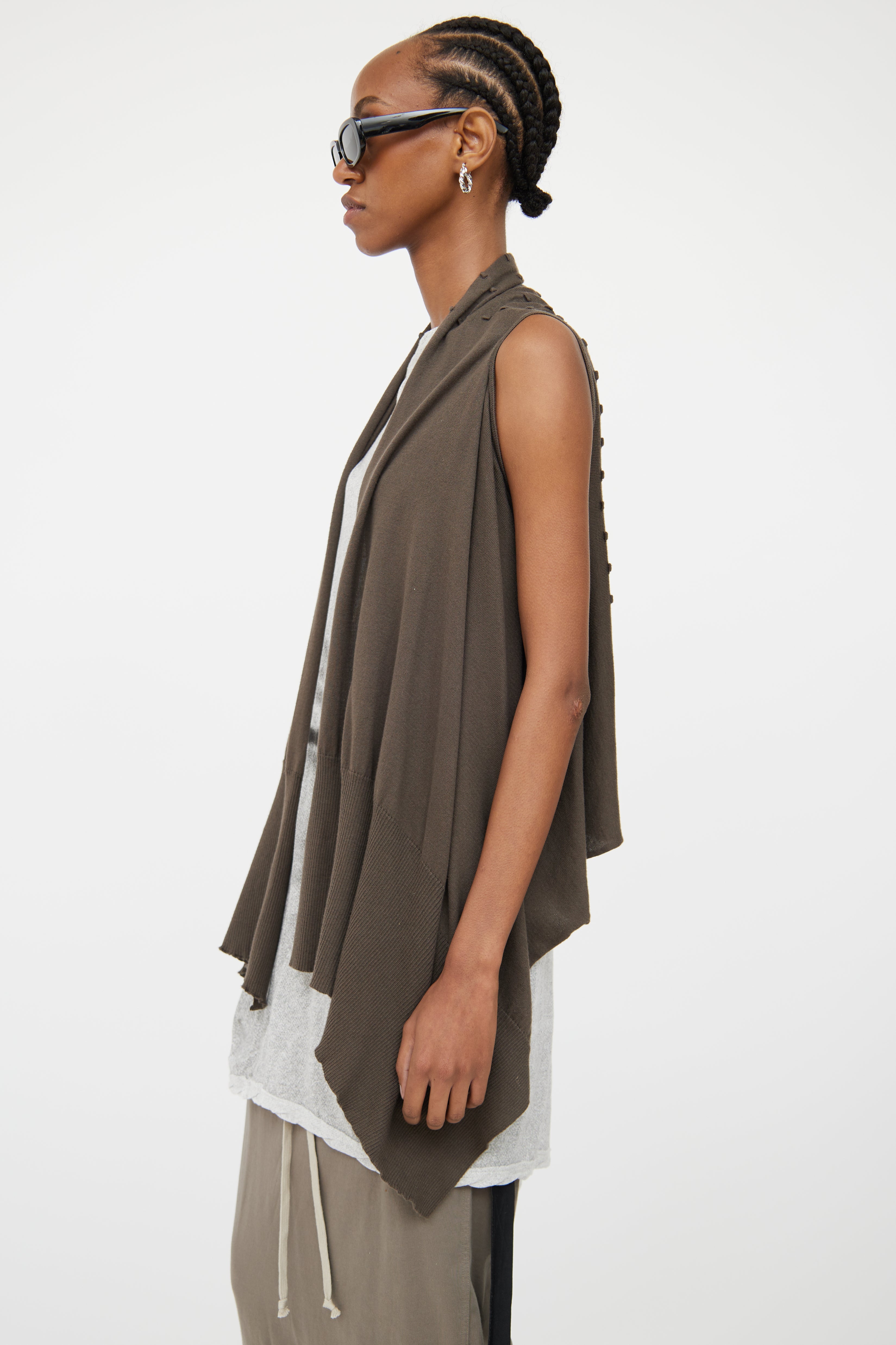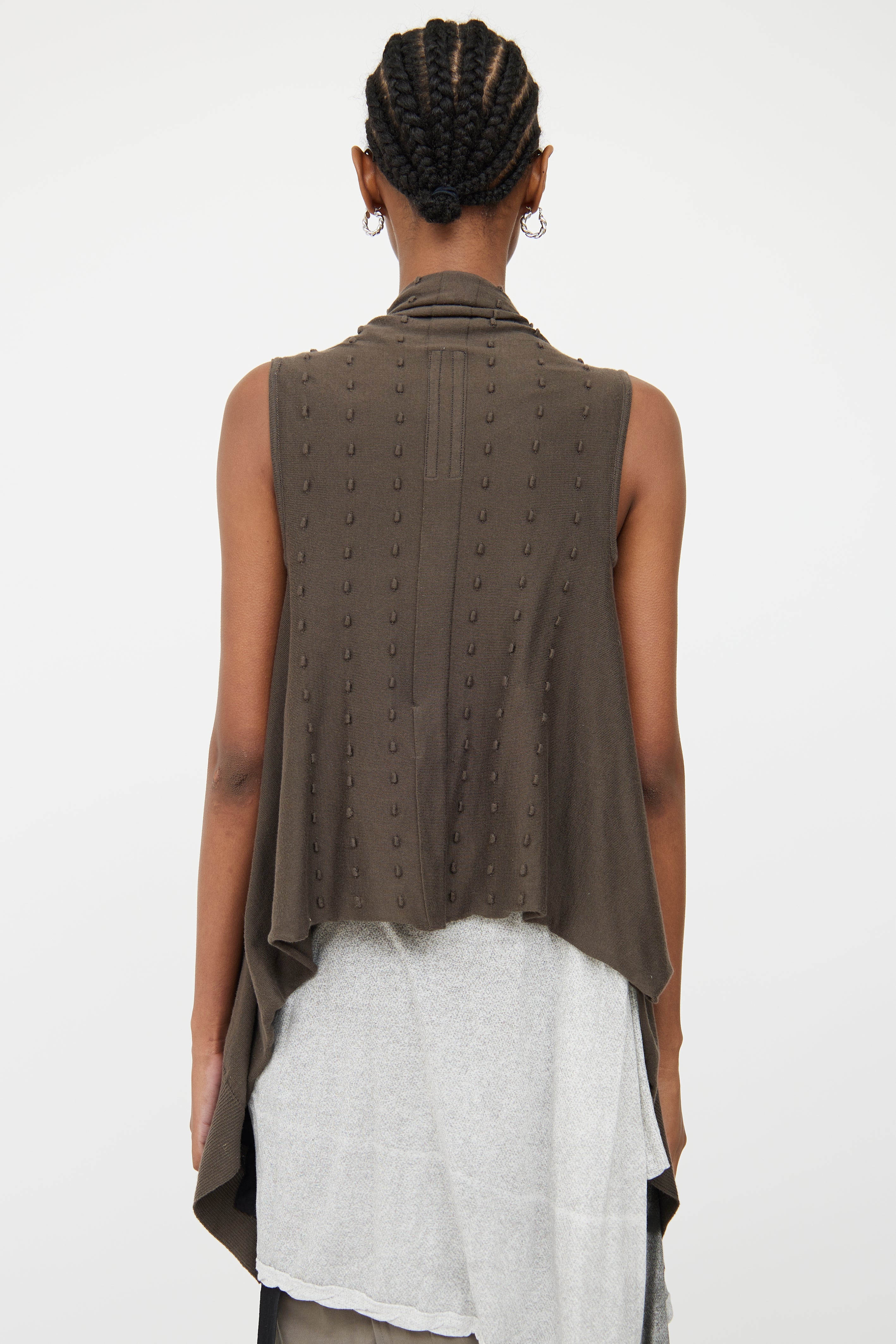 Pre-owned Rick Owens brown cotton knit open front vest featuring sleeveless styling, raised stitch detailing throughout back, cowl neckline, high low hemline and rib knit plackets.