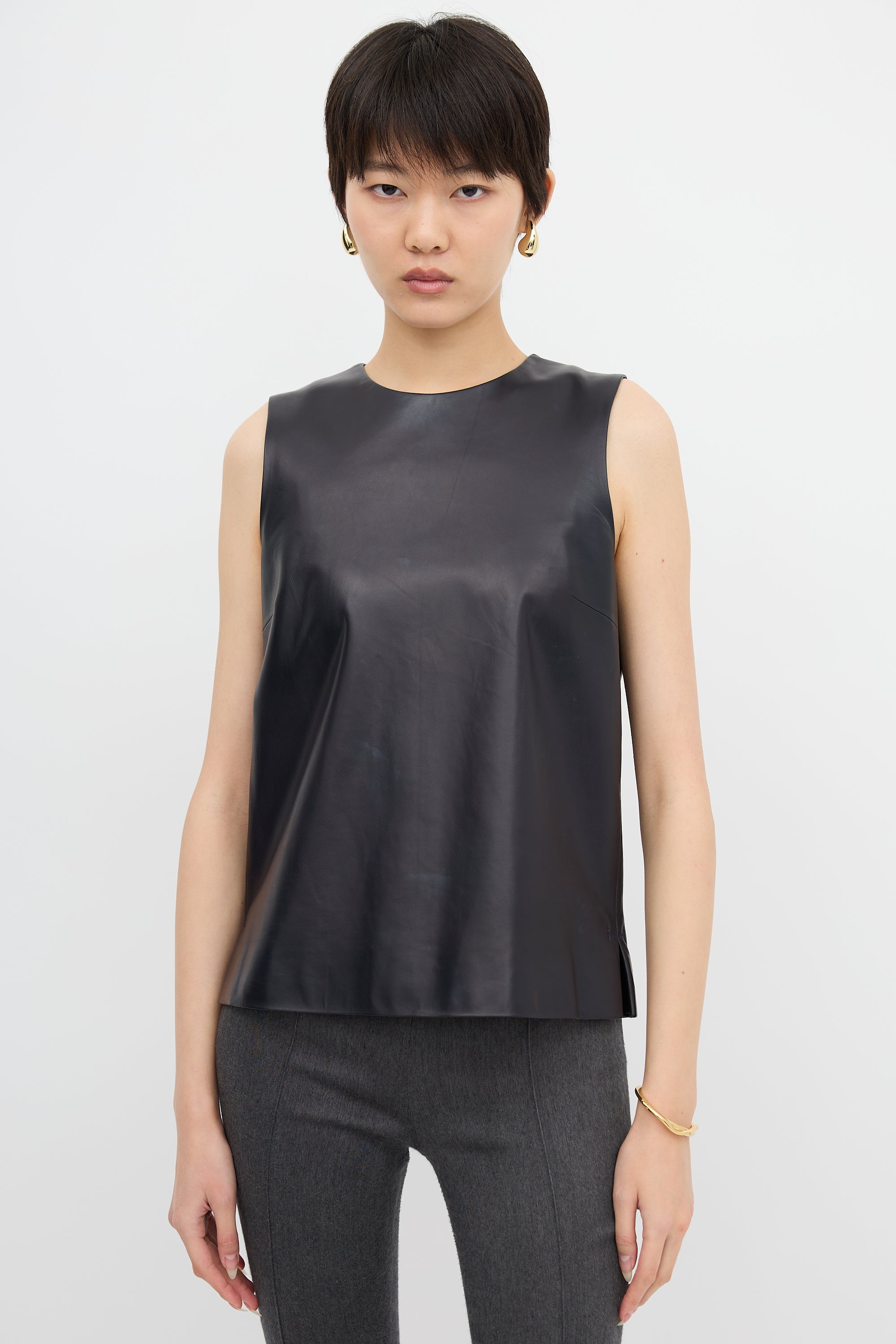 Pre-owned The Row navy leather vest featuring round neckline, side vents, and upper back zip closure. Lined.
