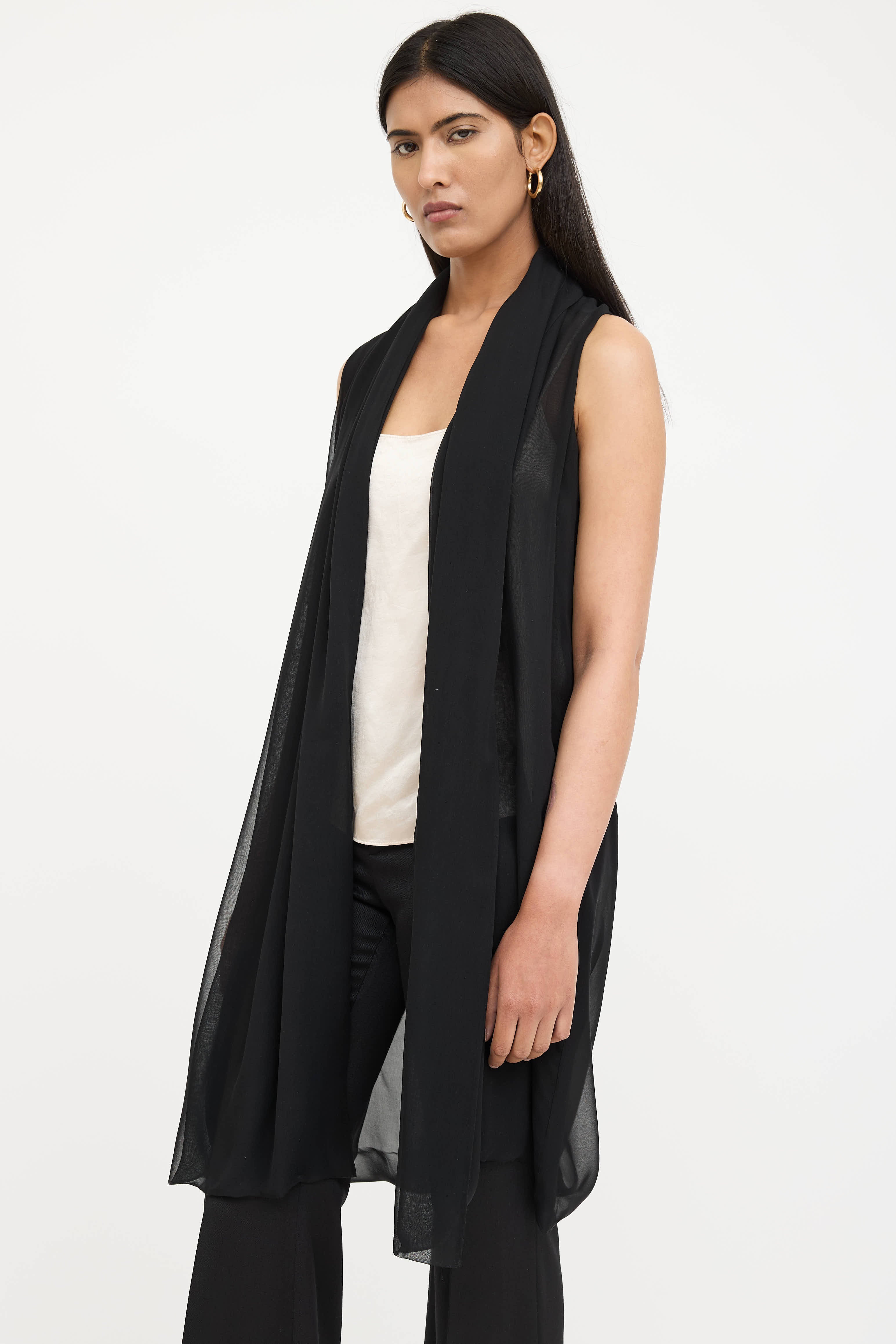 Pre-owned The Row black silk vest featuring a draped layer at chest, sleveeless styling, and open front.