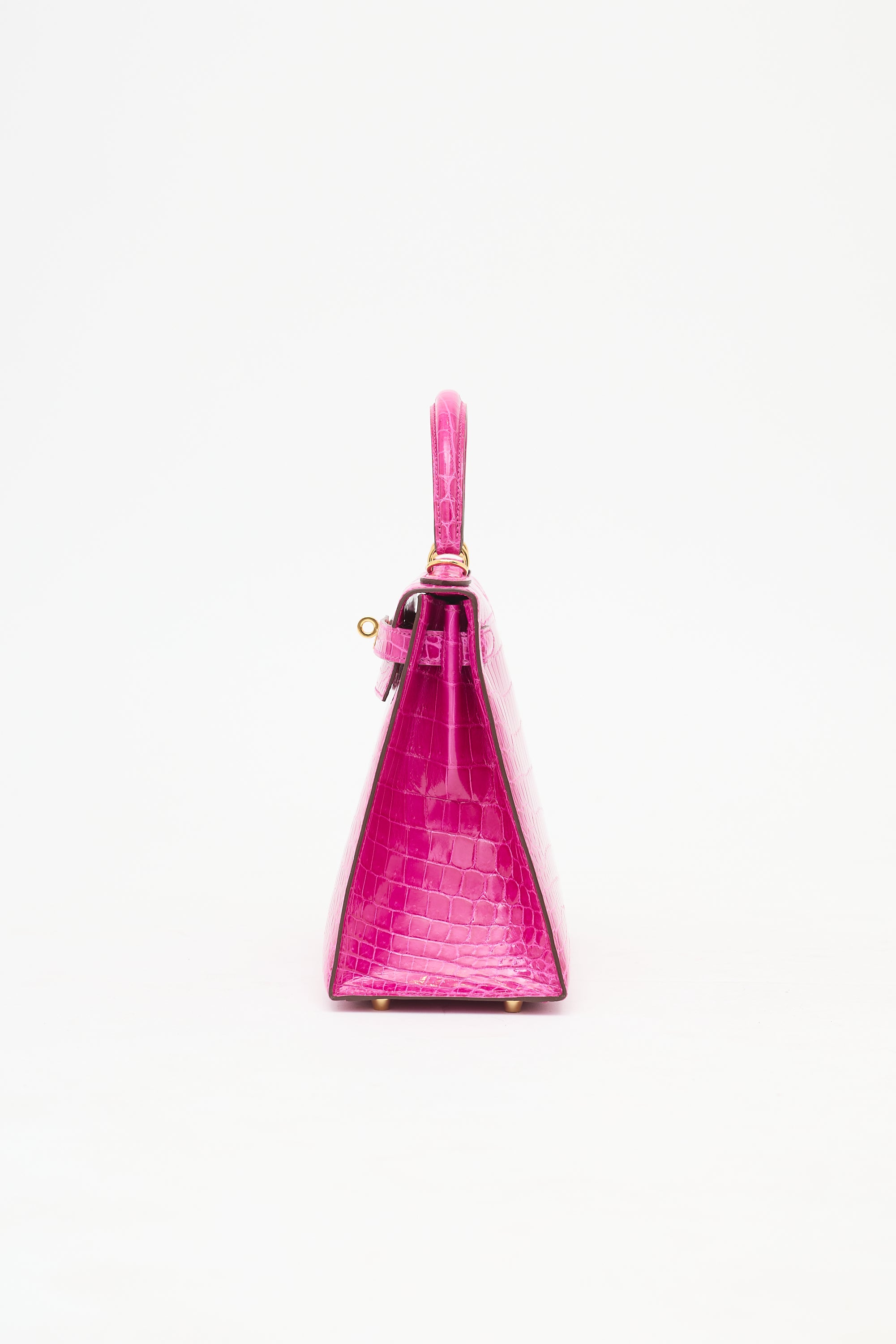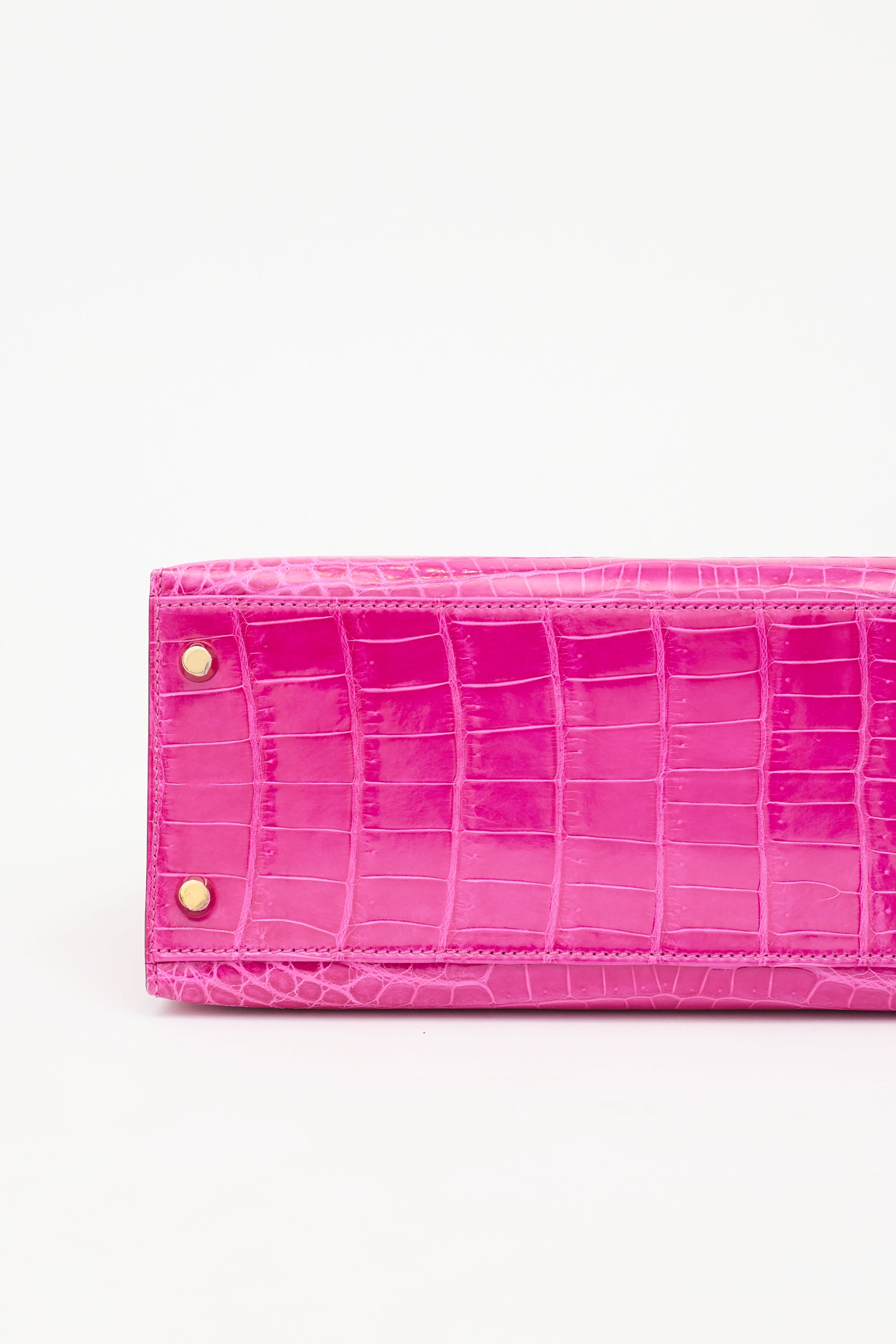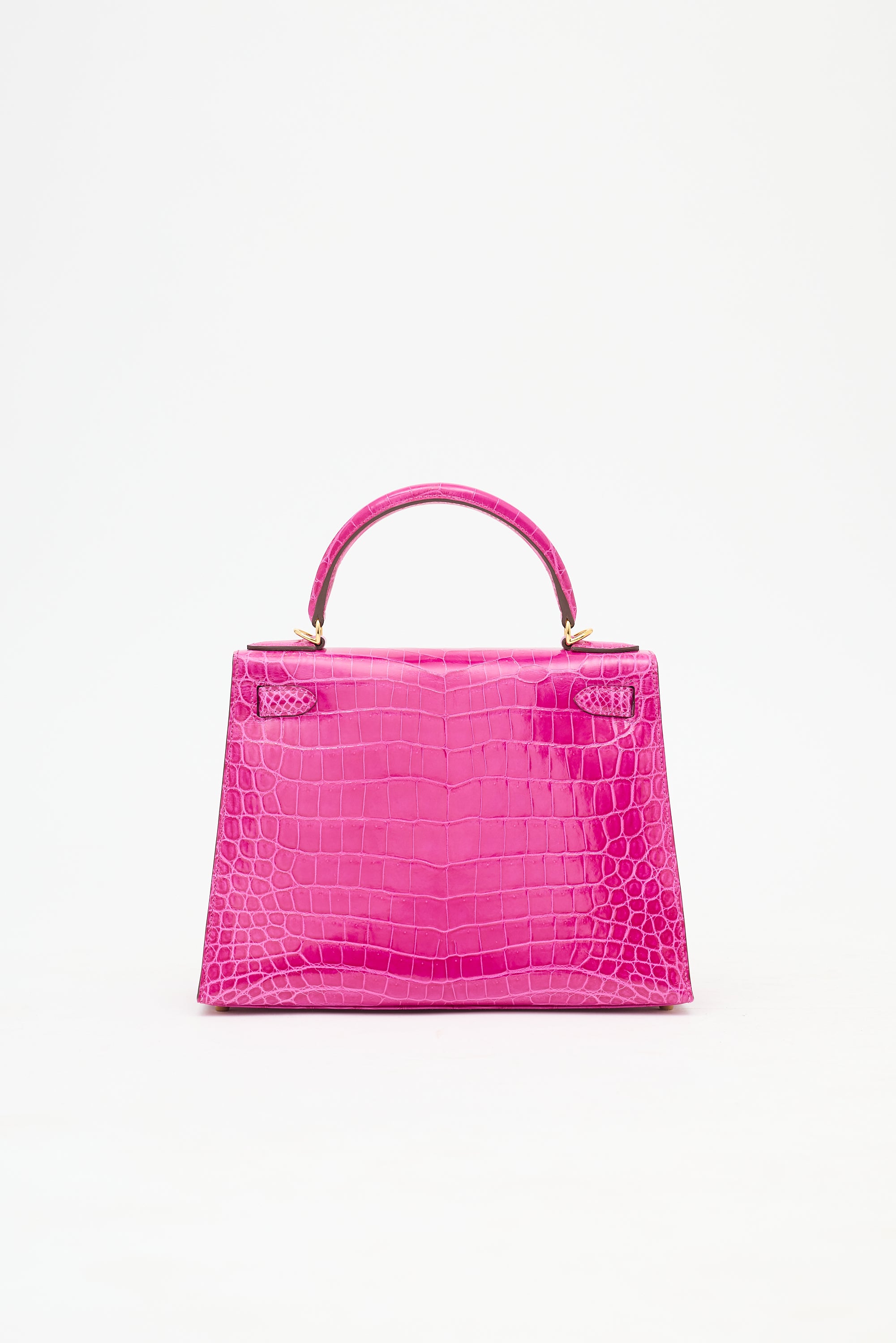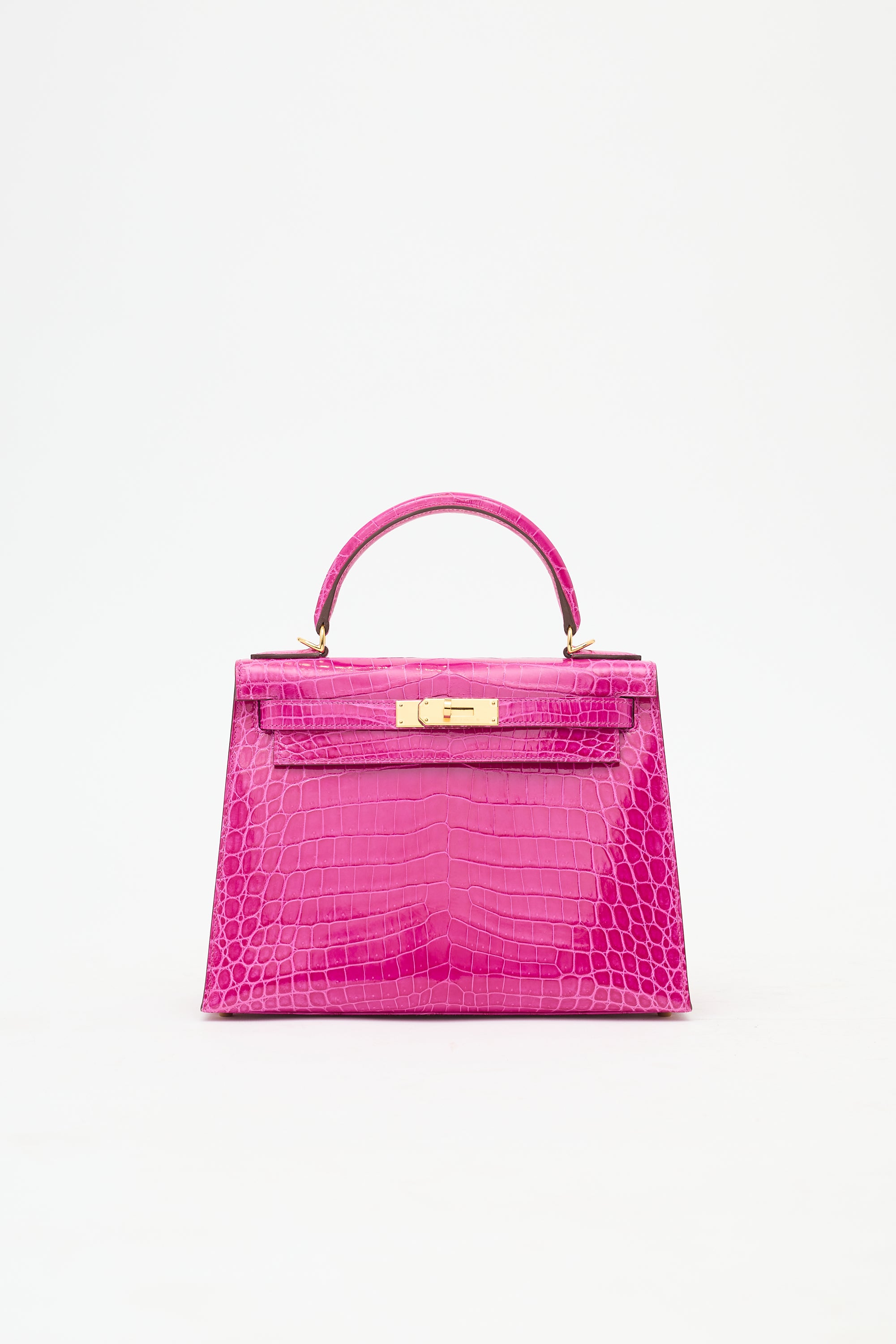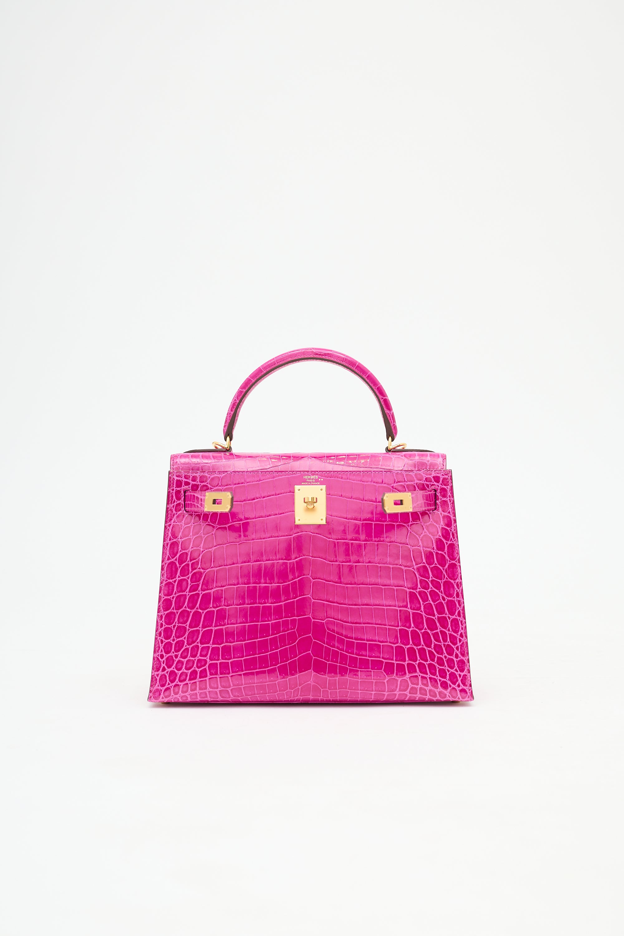 Pre-owned Hermès Kelly Sellier 28 bag in Rose Scheherazade featuring Crocodile Niloticus leather, gold plated Palladium hardware, four clou, single rolled top handle, sangles, logo engraved plaque, signature touret closure, brand stamp and two dots under flap, removable padlock and clochette, detachable shoulder strap, and one main compartment with one zip pocket and two slip pockets. Comes with original box, dust bags, rain cover, care guide, Sales Memo, and CNWM card. Authentication certificate included.