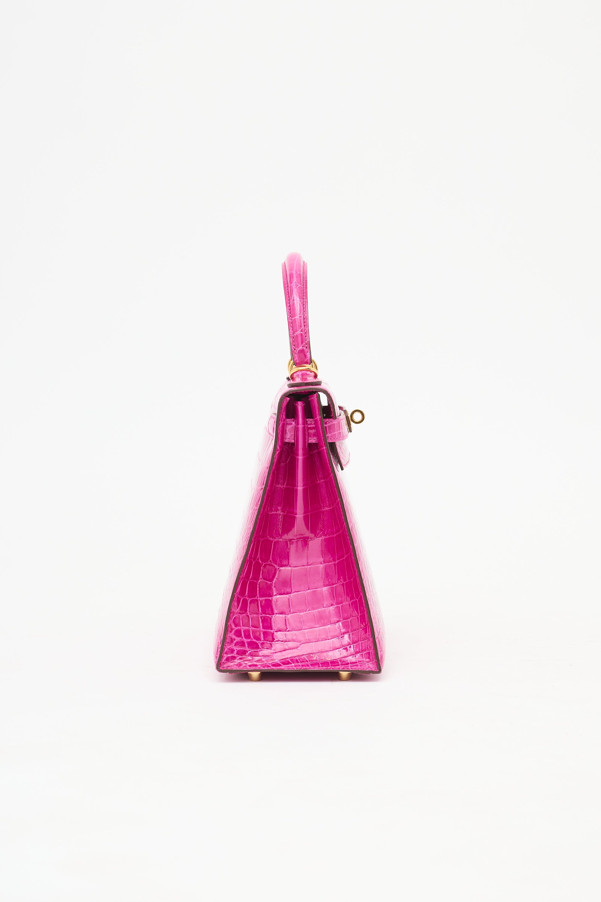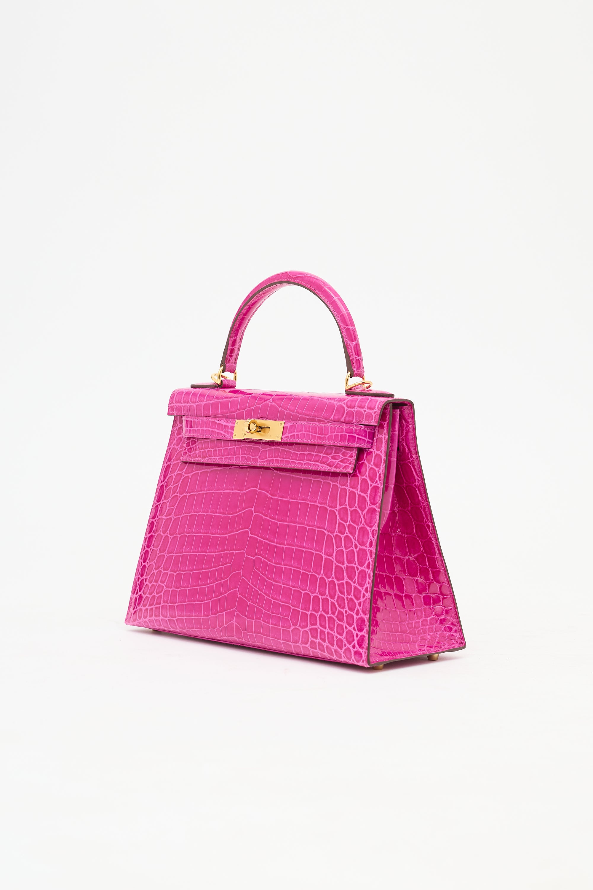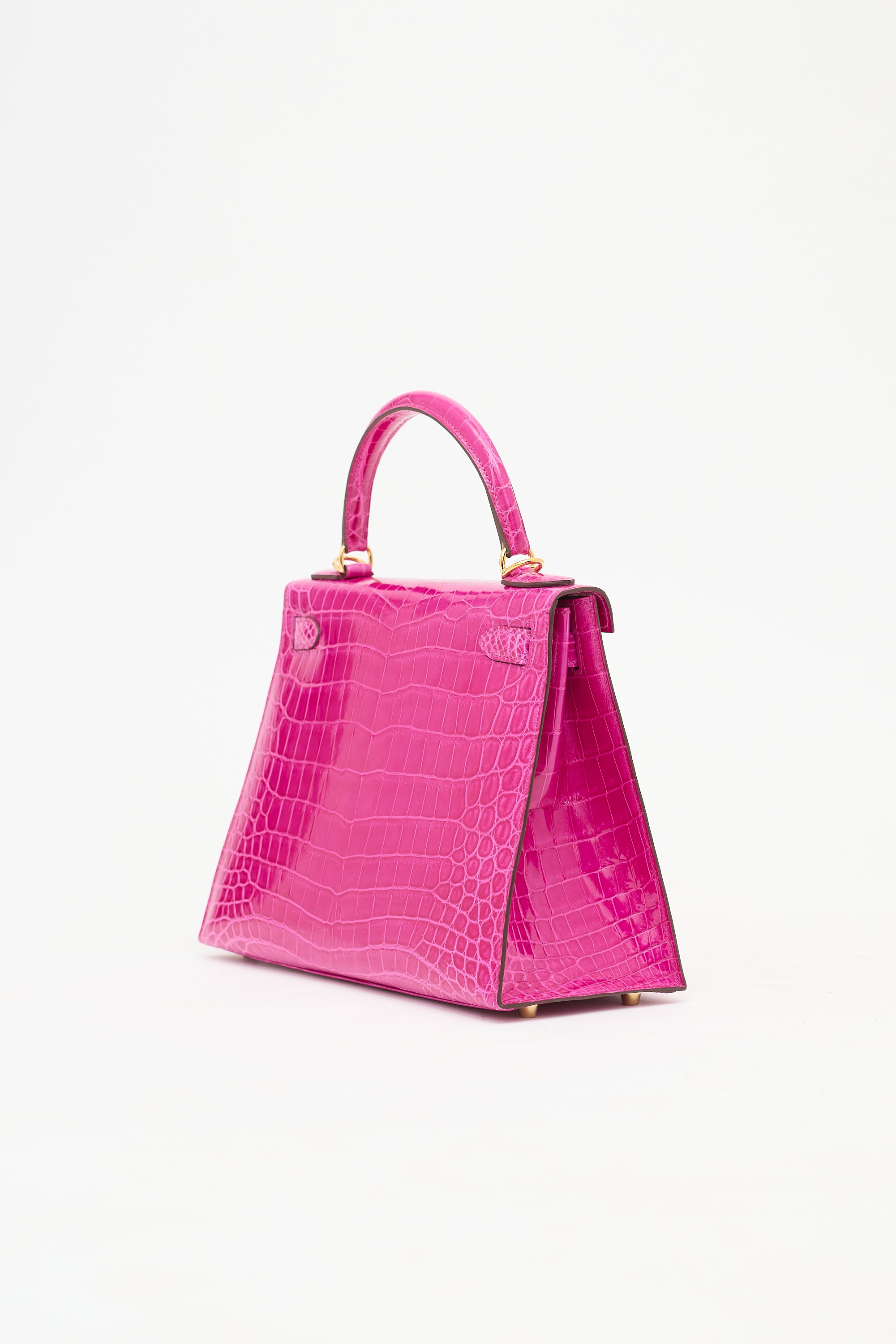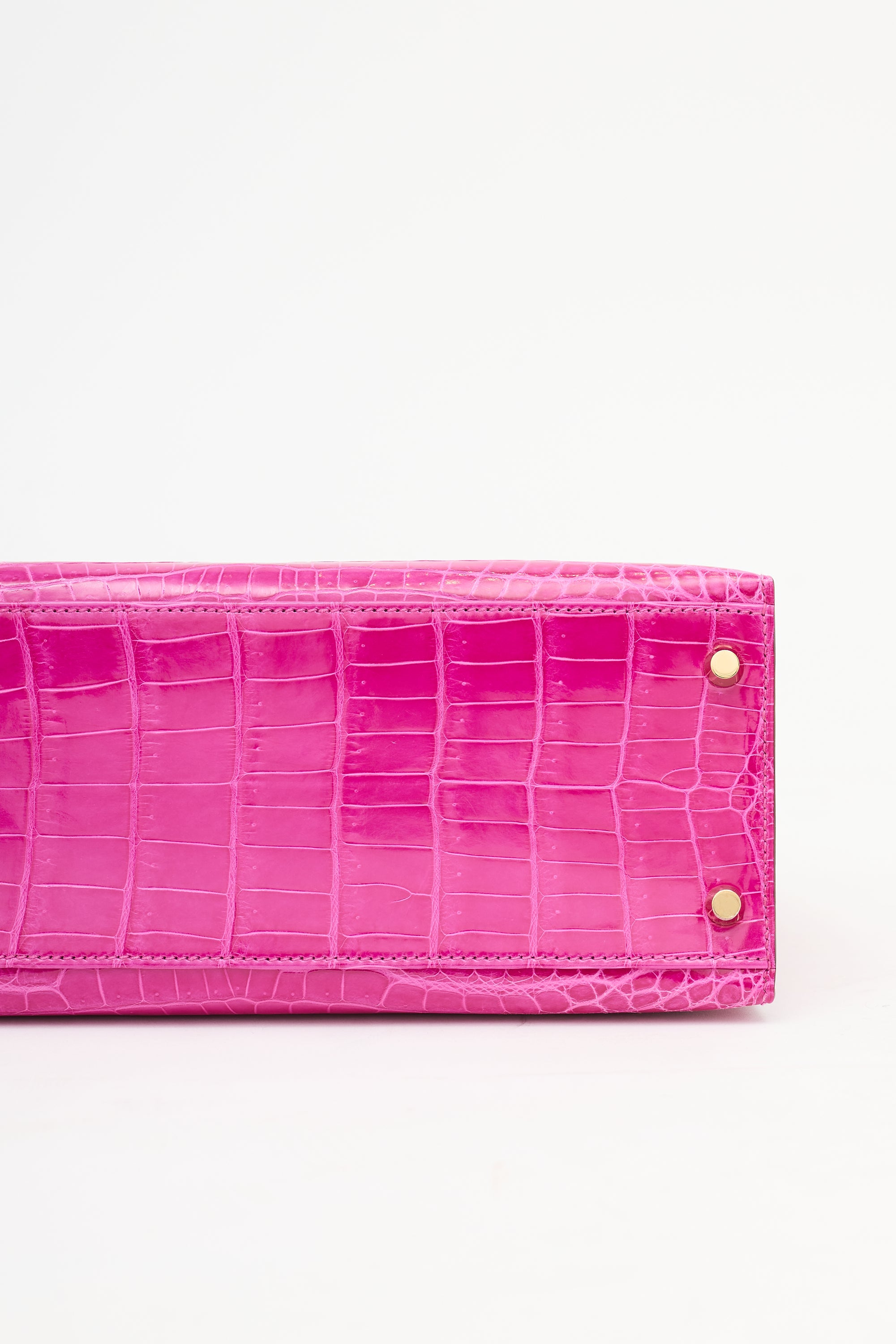 Pre-owned Hermès Kelly Sellier 28 bag in Rose Scheherazade featuring Crocodile Niloticus leather, gold plated Palladium hardware, four clou, single rolled top handle, sangles, logo engraved plaque, signature touret closure, brand stamp and two dots under flap, removable padlock and clochette, detachable shoulder strap, and one main compartment with one zip pocket and two slip pockets. Comes with original box, dust bags, rain cover, care guide, Sales Memo, and CNWM card. Authentication certificate included.