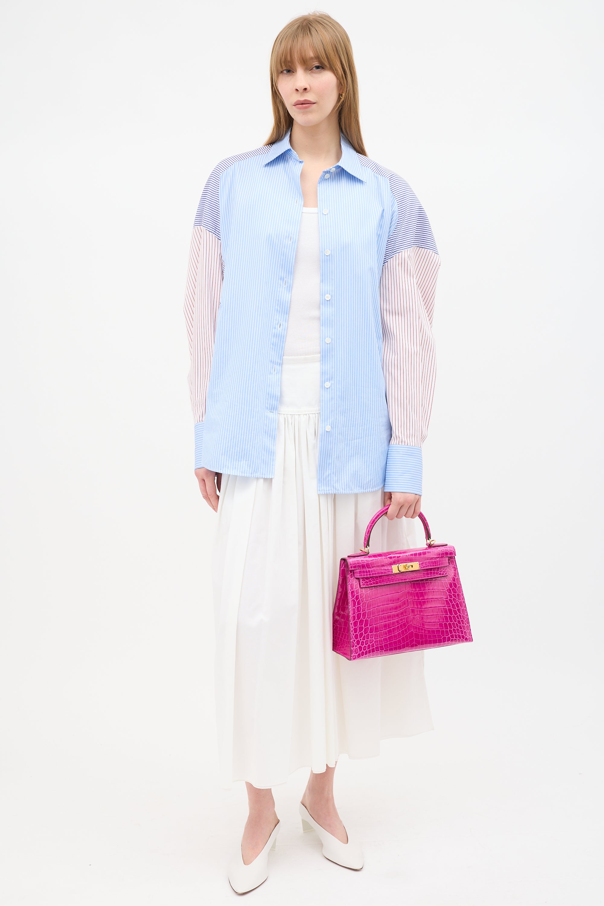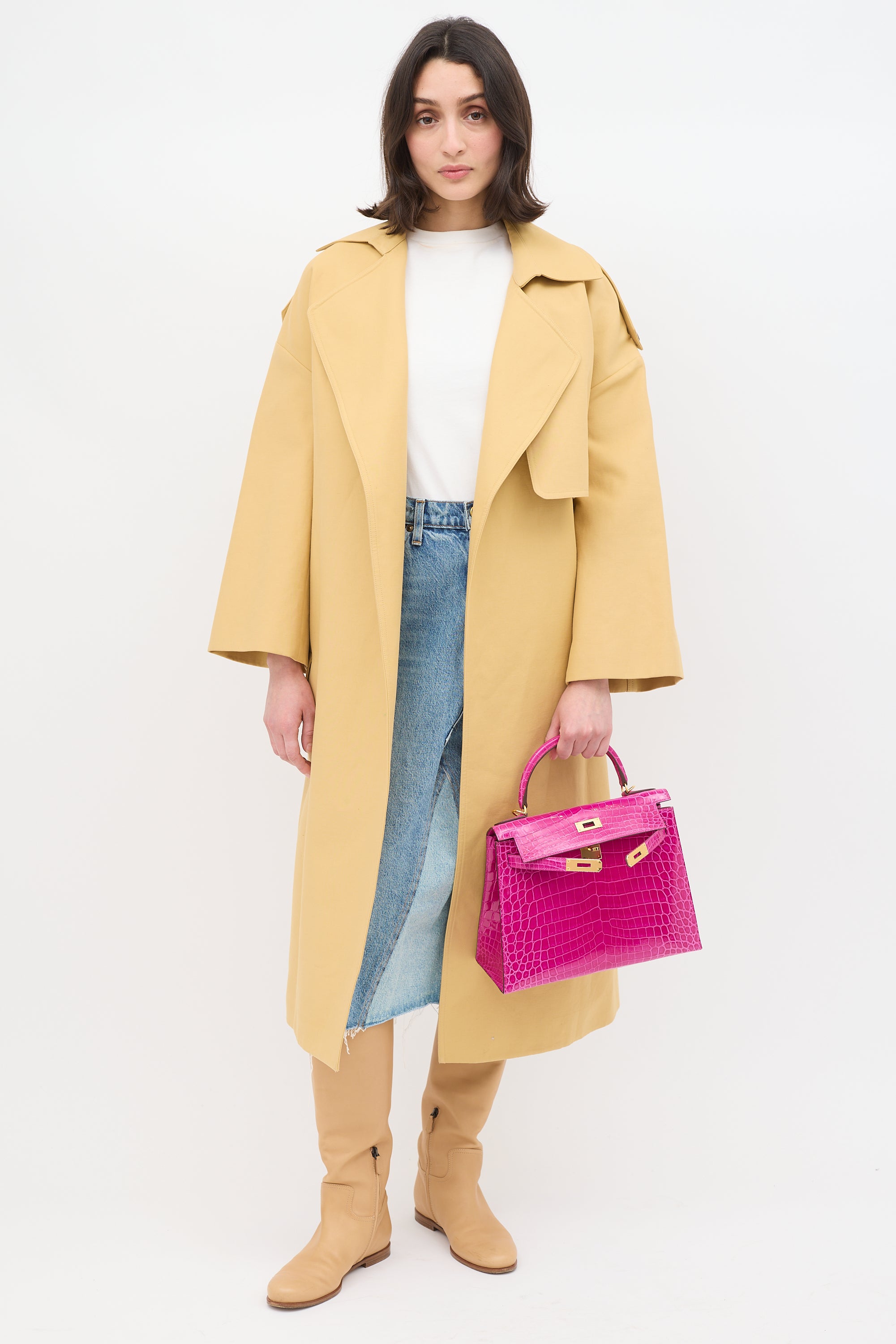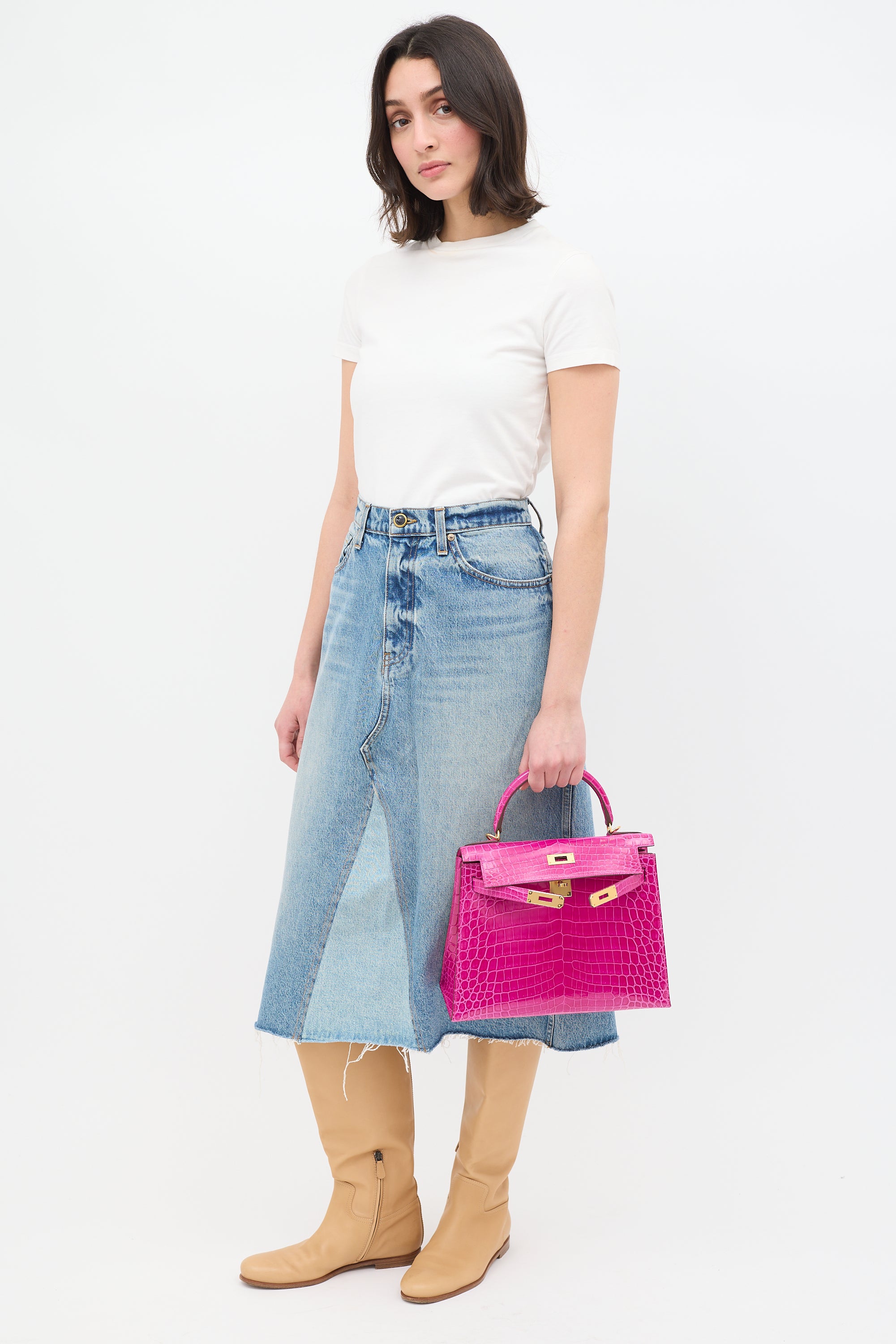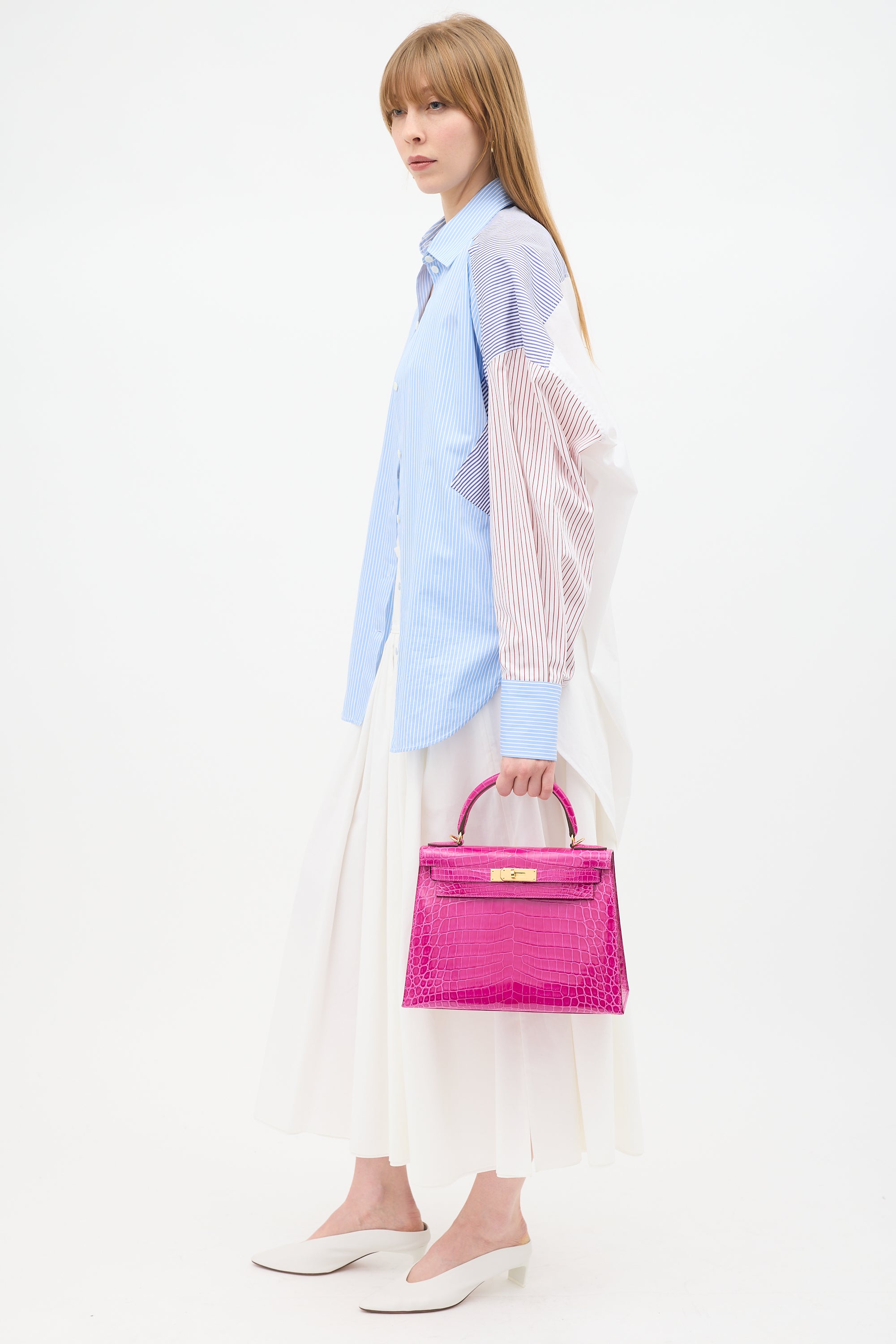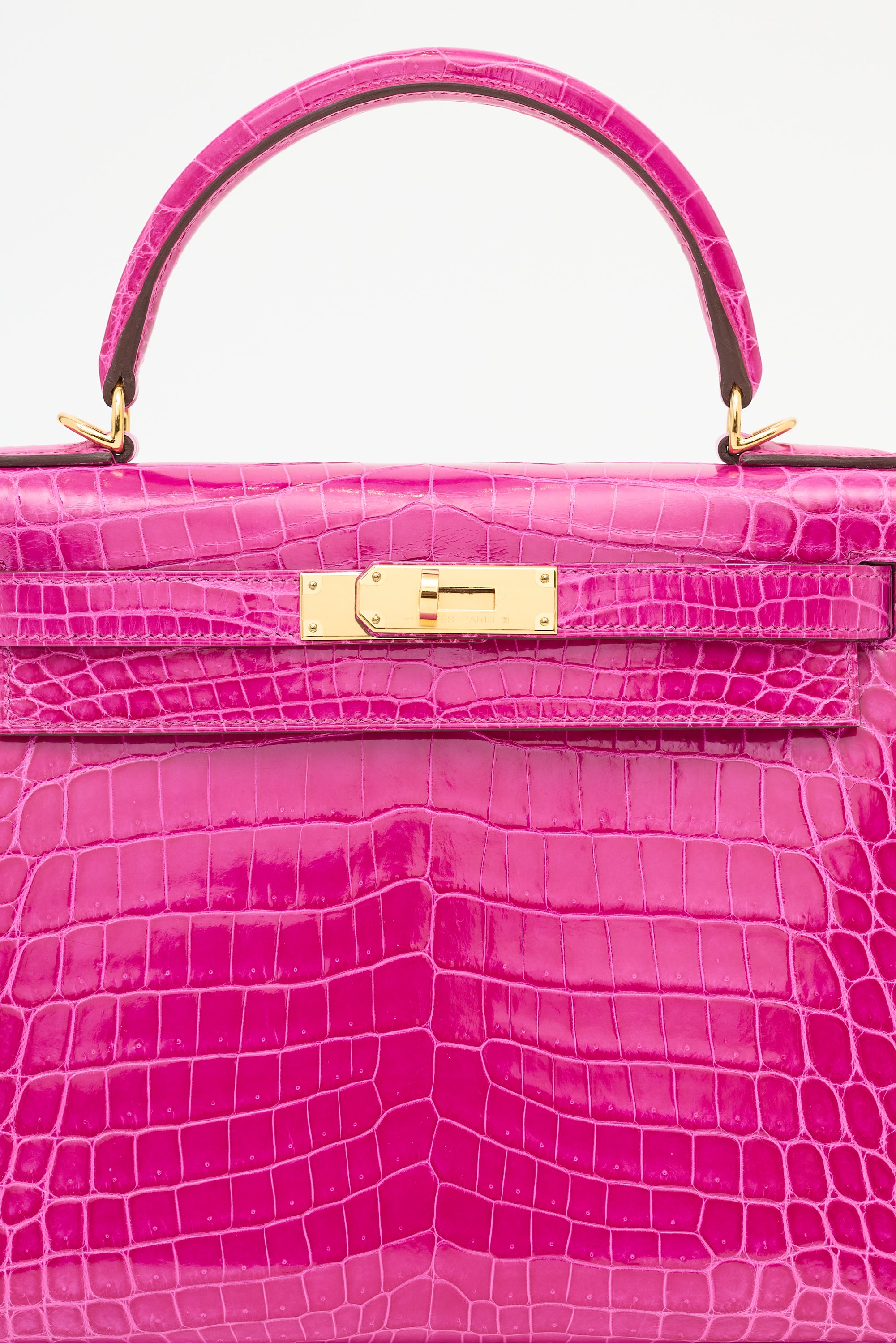 Pre-owned Hermès Kelly Sellier 28 bag in Rose Scheherazade featuring Crocodile Niloticus leather, gold plated Palladium hardware, four clou, single rolled top handle, sangles, logo engraved plaque, signature touret closure, brand stamp and two dots under flap, removable padlock and clochette, detachable shoulder strap, and one main compartment with one zip pocket and two slip pockets. Comes with original box, dust bags, rain cover, care guide, Sales Memo, and CNWM card. Authentication certificate included.
