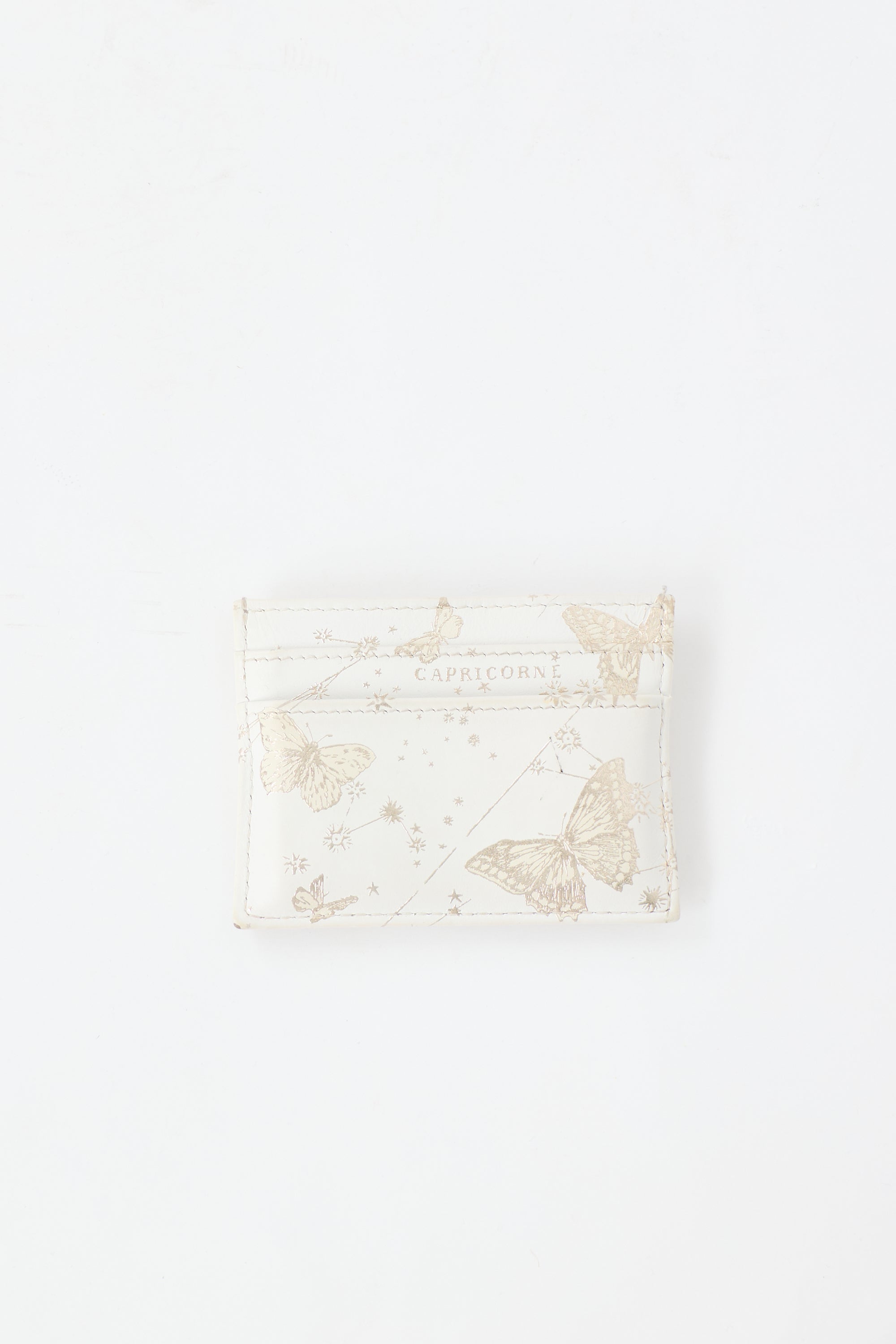 Pre-owned Dior white leather Capricorn card holder featuring gold tone gilding, butterfly motifs, front logo embellishment, and five card slots.