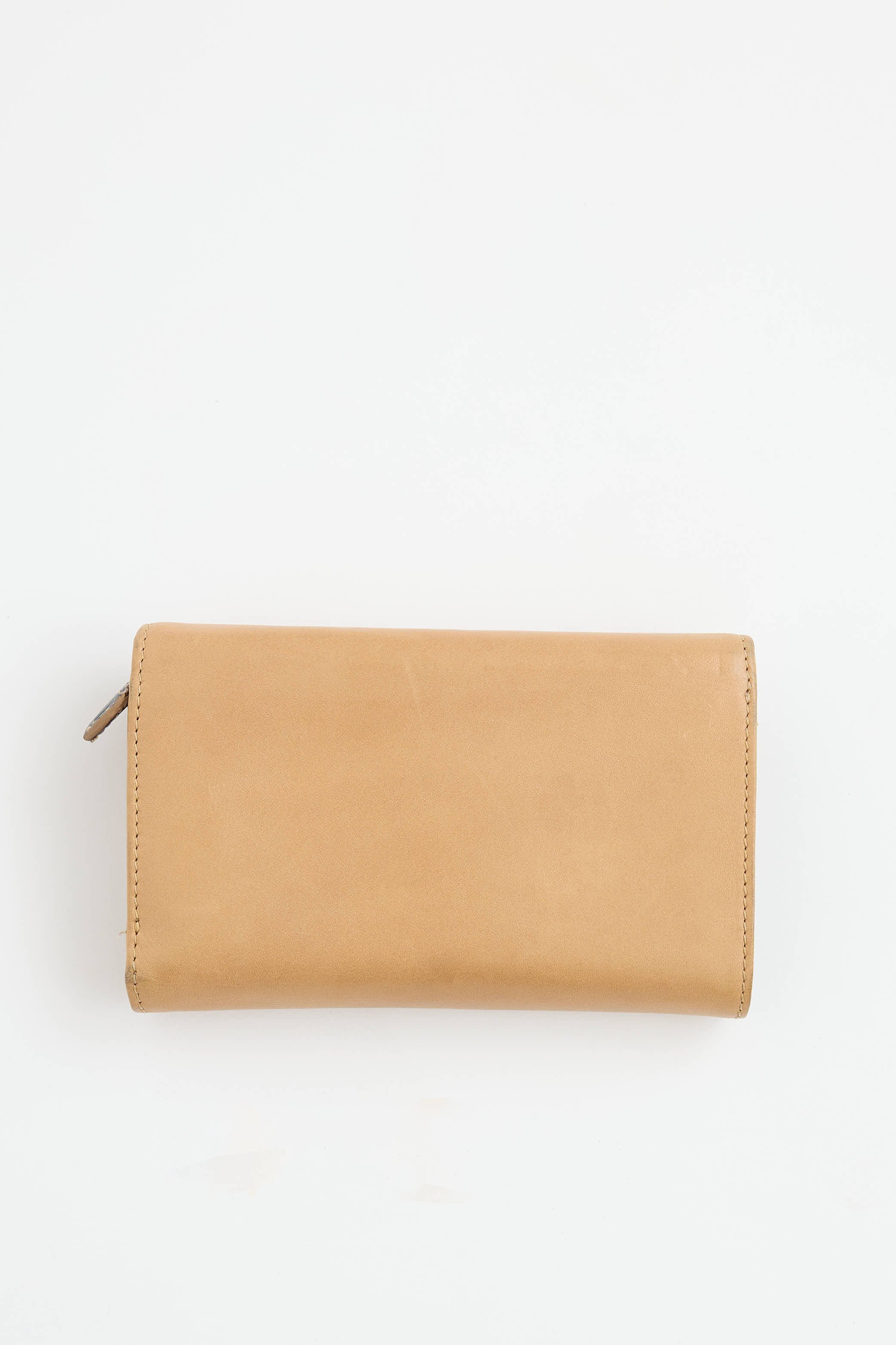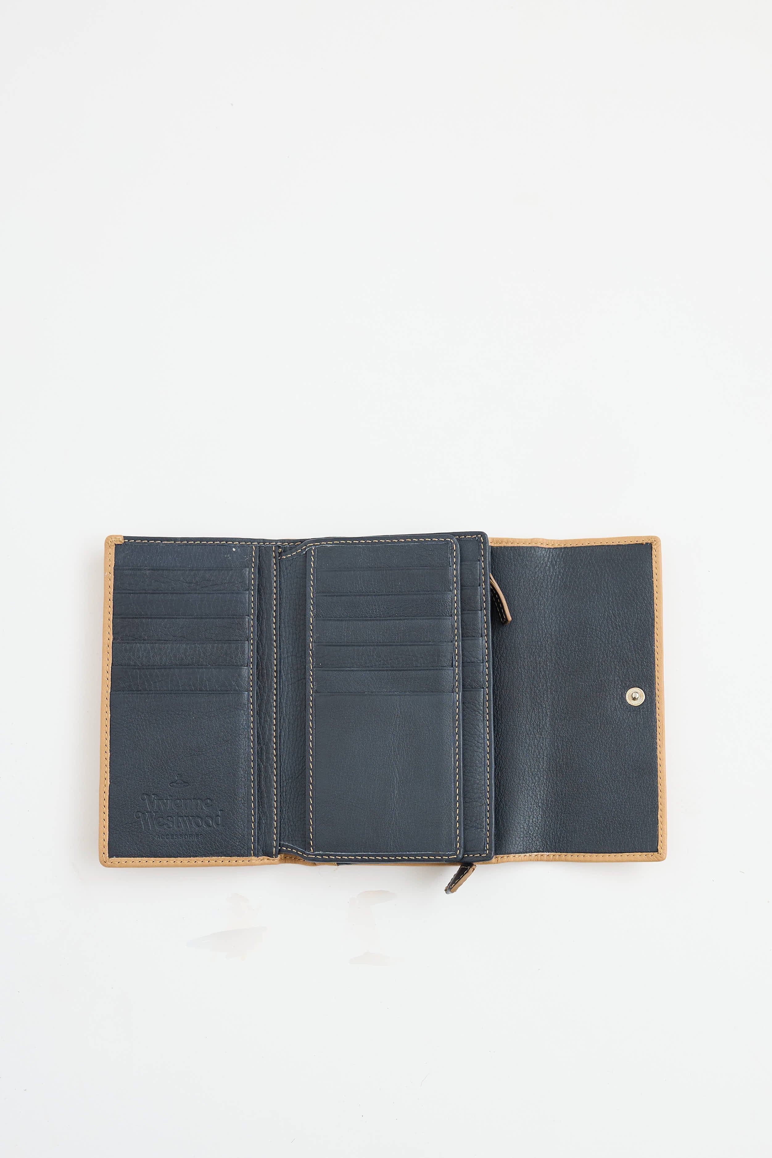 Pre-owned Vivienne Westwood beige tri-fold wallet featuring embossed orb logo at front, top flap with snap closure, 18 card slots, five card slots, and one interior zip pocket.