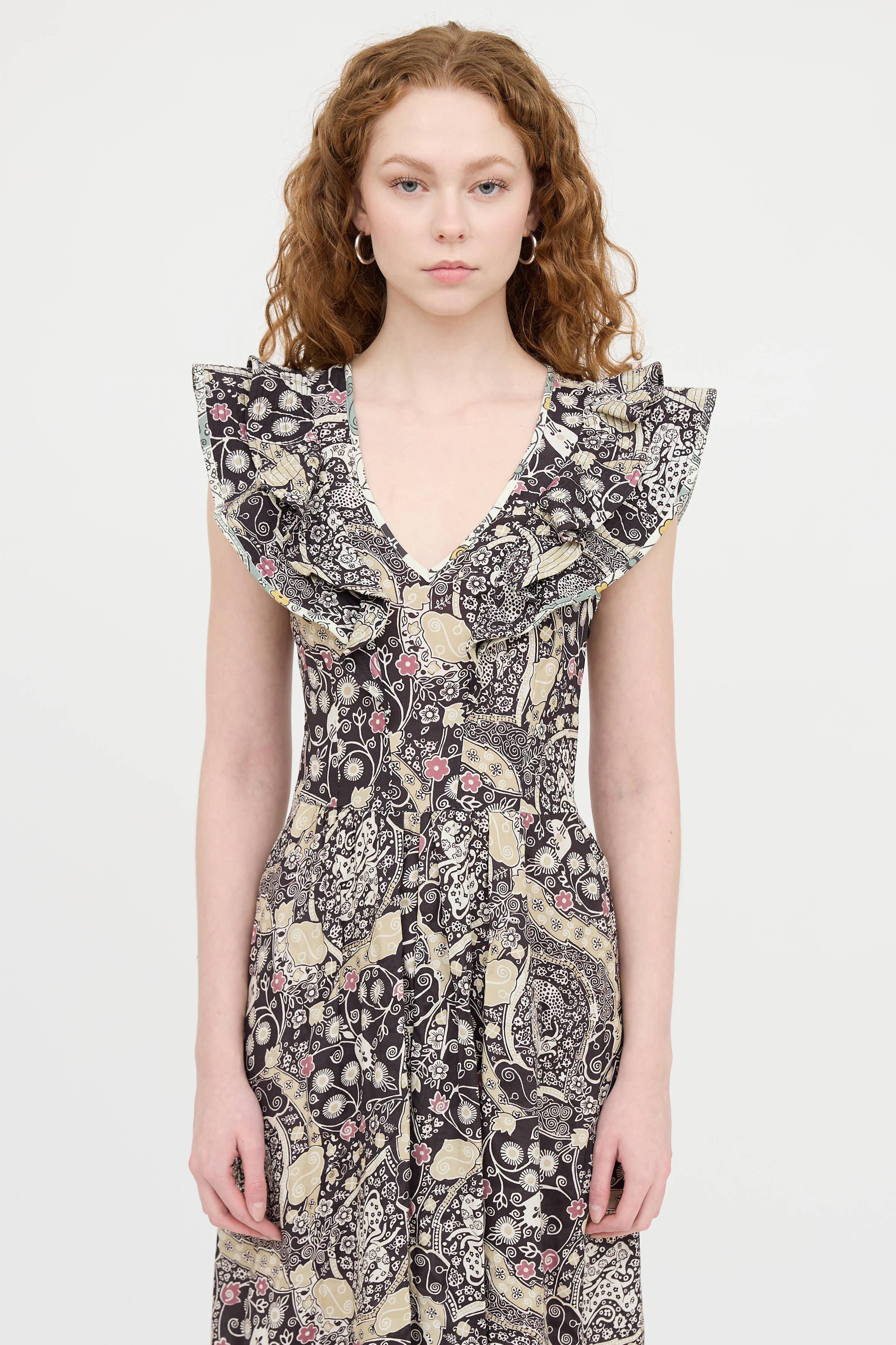 Pre-owned Isabel Marant Étoile black and multicolour floral dress featuring V-neckline, ruffled shoulders with black stitch details, pleated skirt and concealed zip at side.