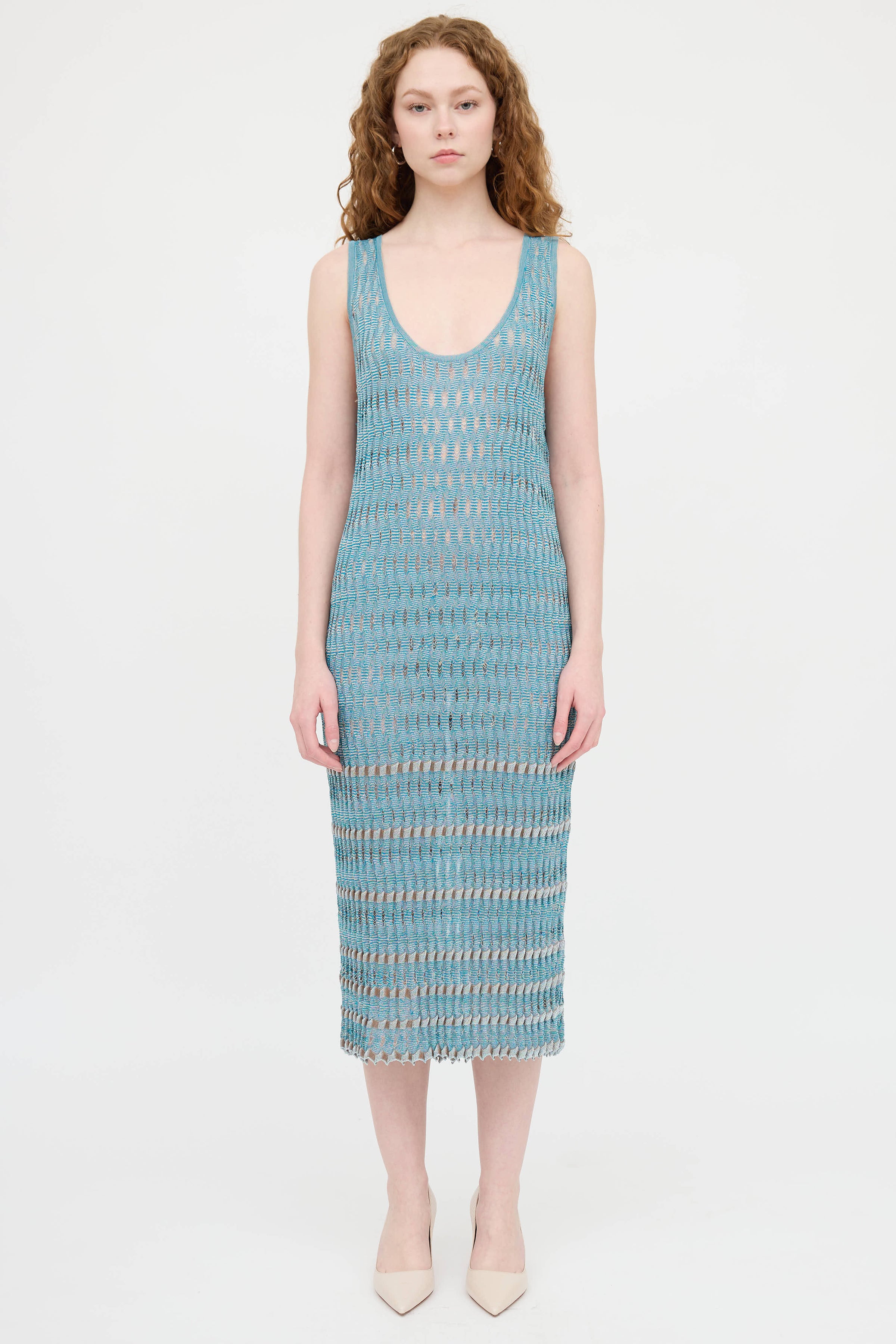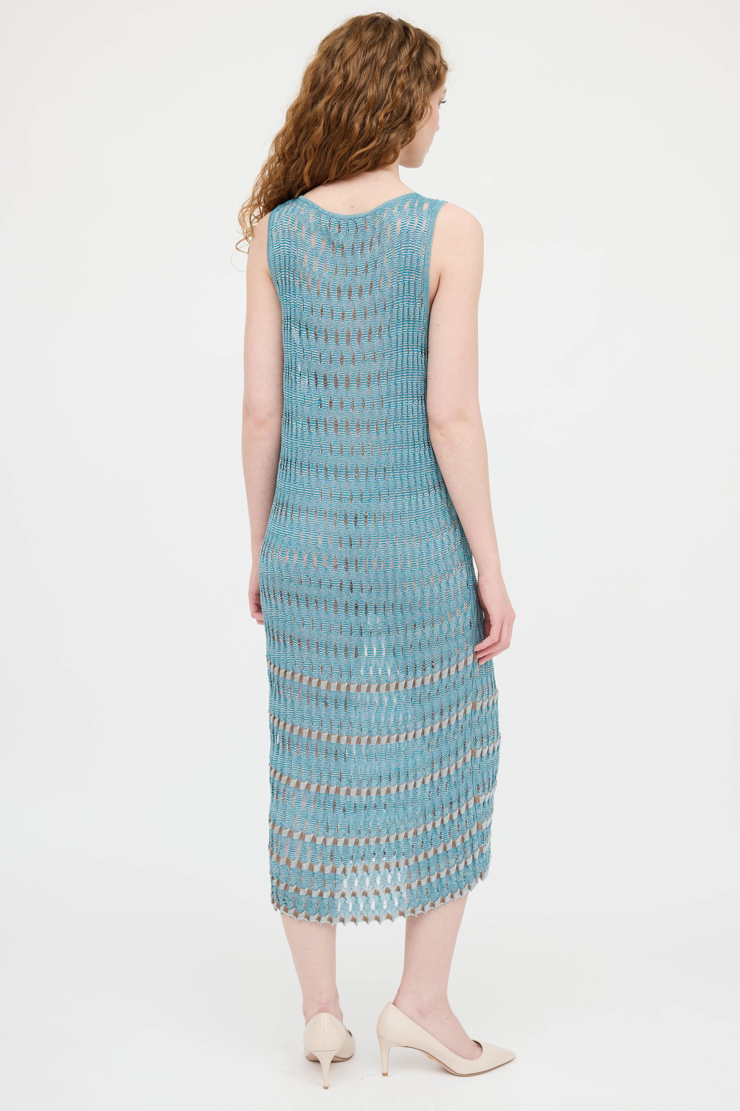 Pre-owned Missoni blue and multicolour dress featuring scoop neckline, pleated sheer knit material, ribbed knit trims and striped pattern throughout.