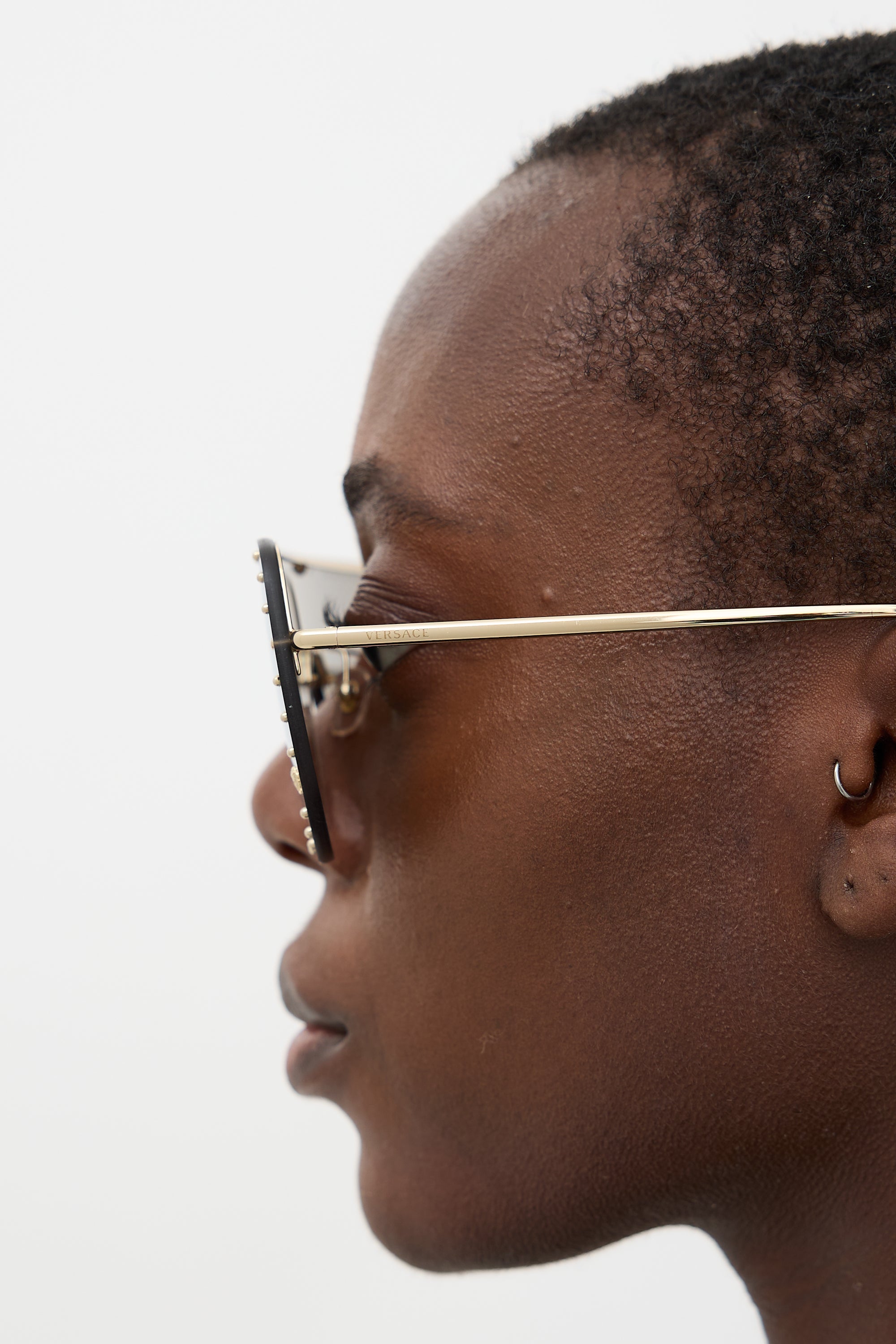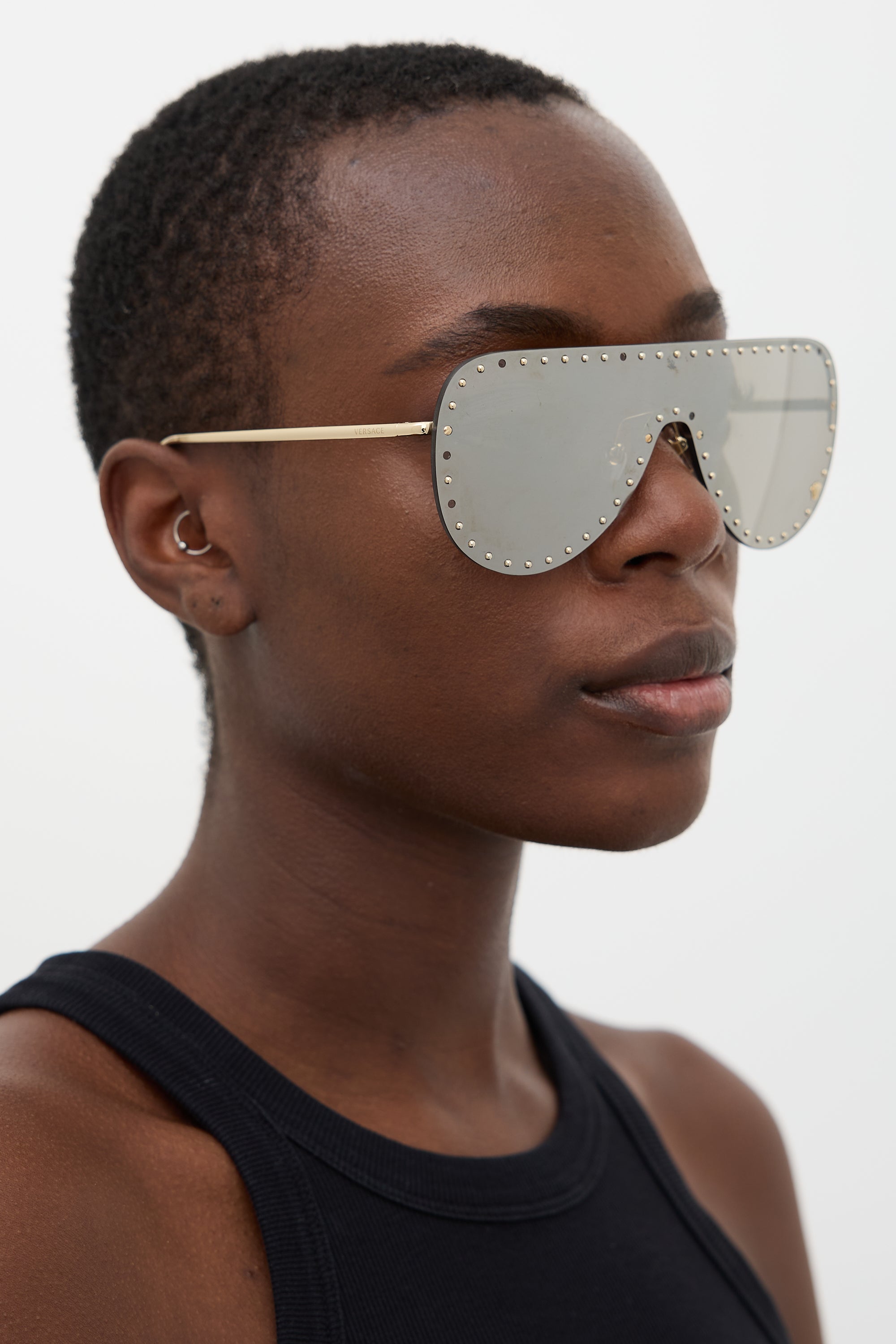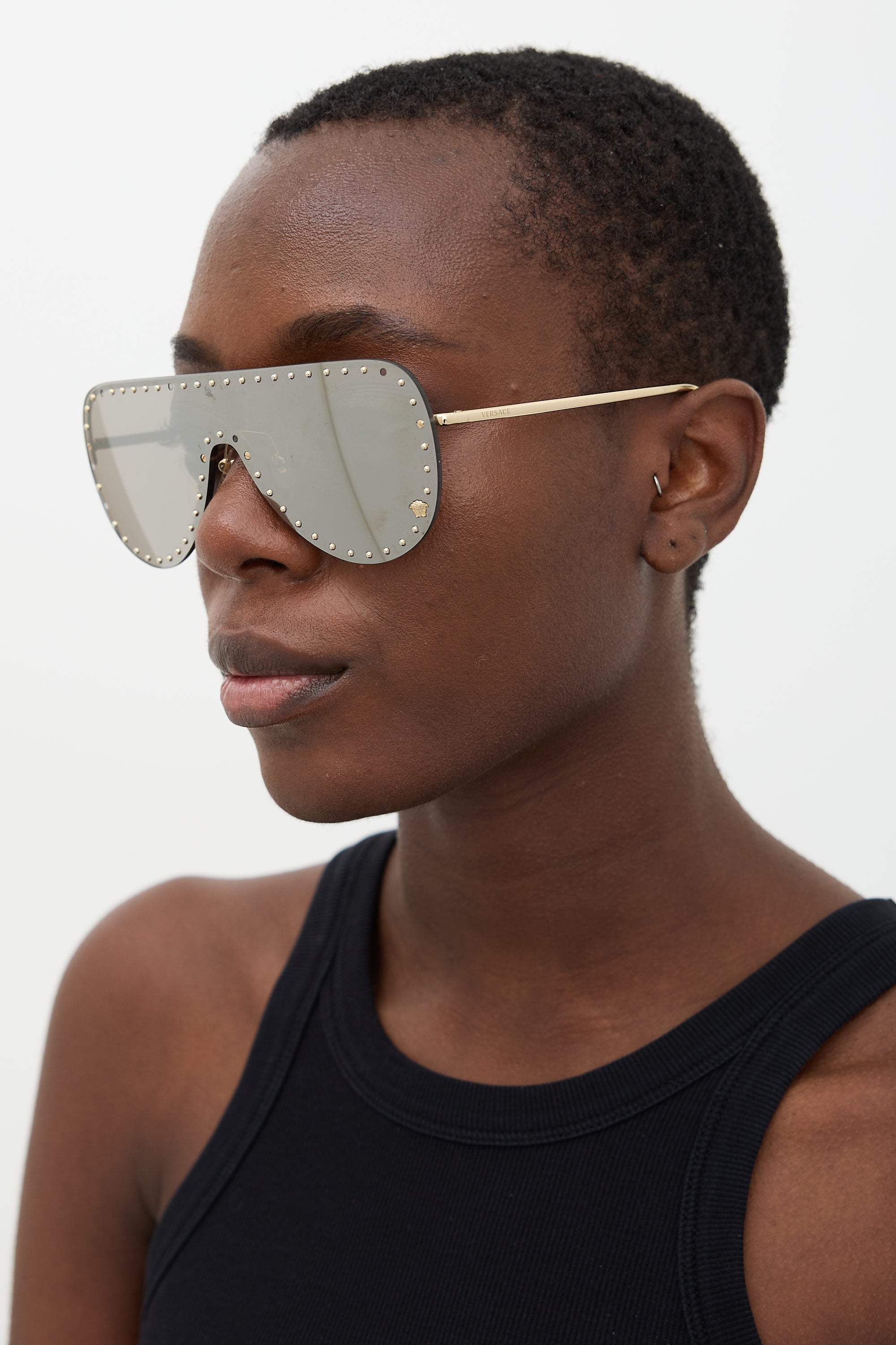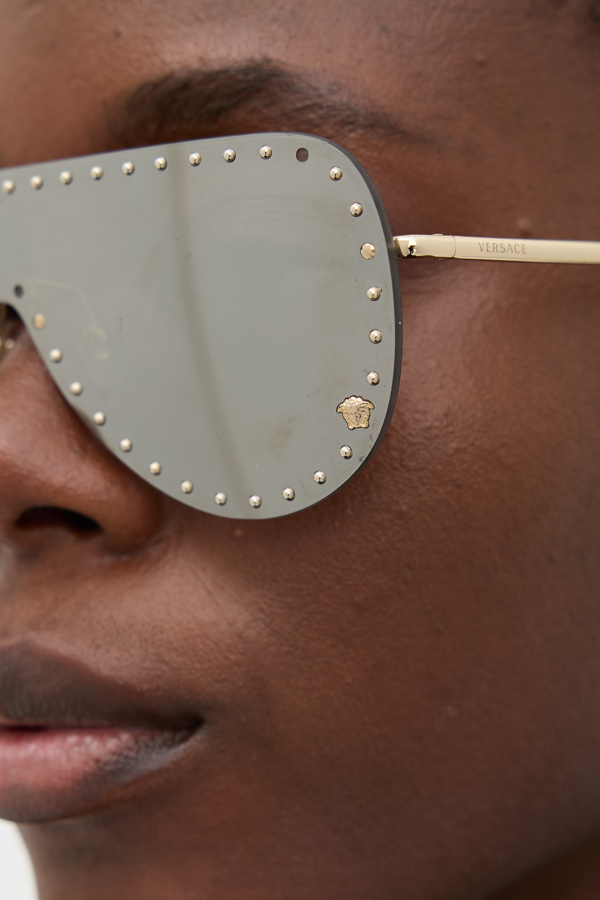 Pre-owned Versace MOD2230 sunglasses featuring a shield frame with mirrored lenses, gold tone studs and Medusa head at lens, nose pads, and gold tone metal arms with logo and Medusa head at arm end.