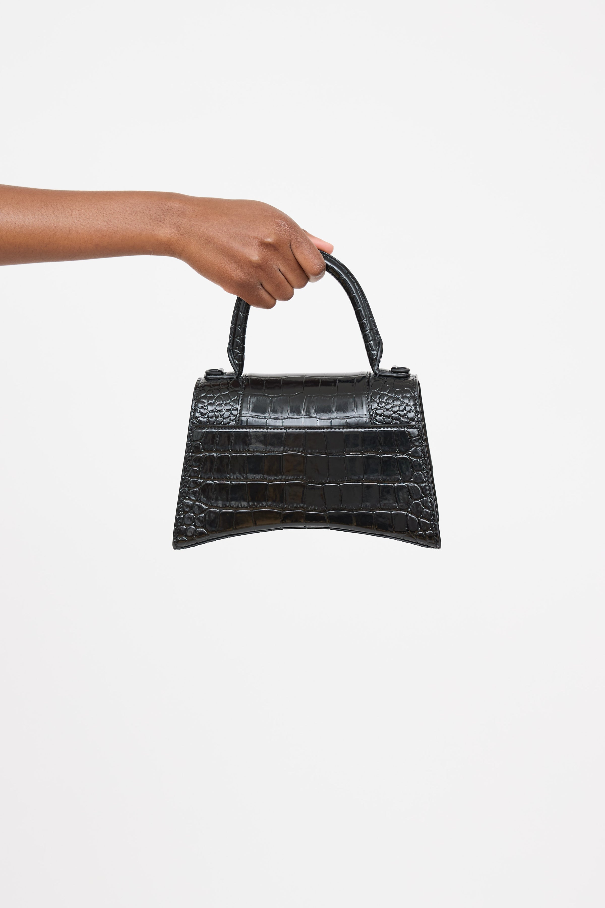 Pre-owned Balenciaga black Hourglass bag featuring an embossed croc effect throughout, top handle, removable shoulder strap, top flap with tonal B logo hardware, one main compartment with one zip pocket, one slip pocket at back, and front snap closure. Comes with original dust bag.