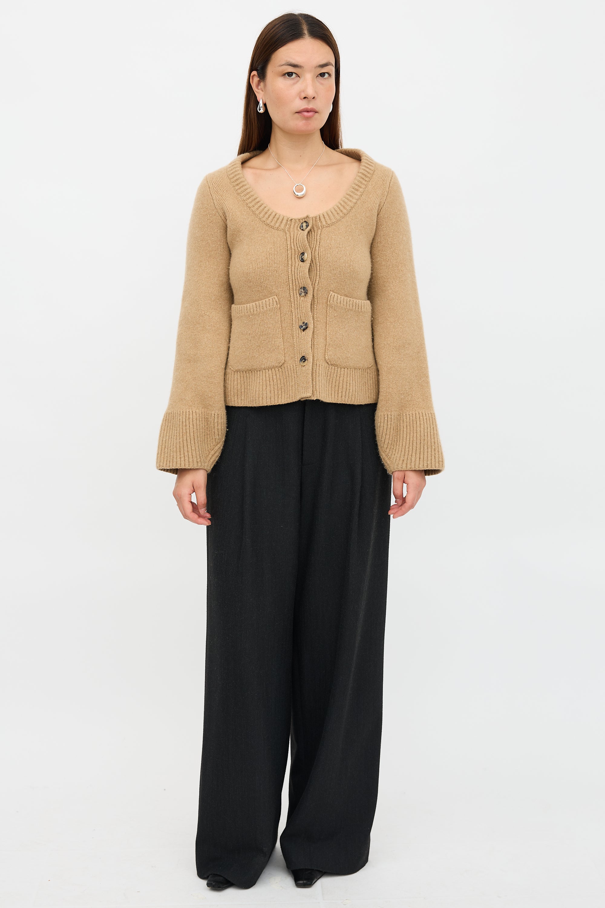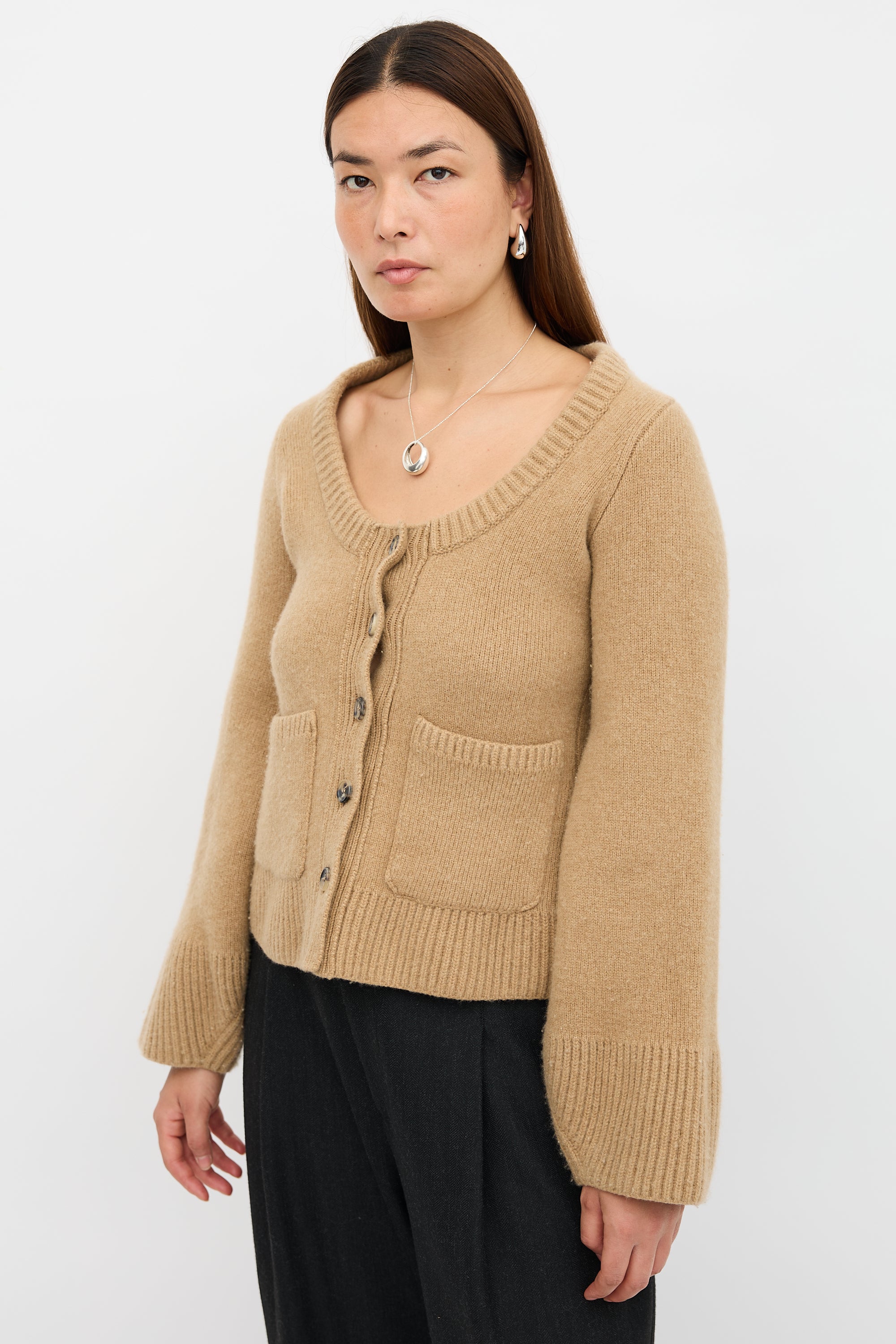 Pre-owned Khaite brown cashmere blend Caro cardigan featuring a scoop neckline, button front, patch pockets, and lantern sleeves.