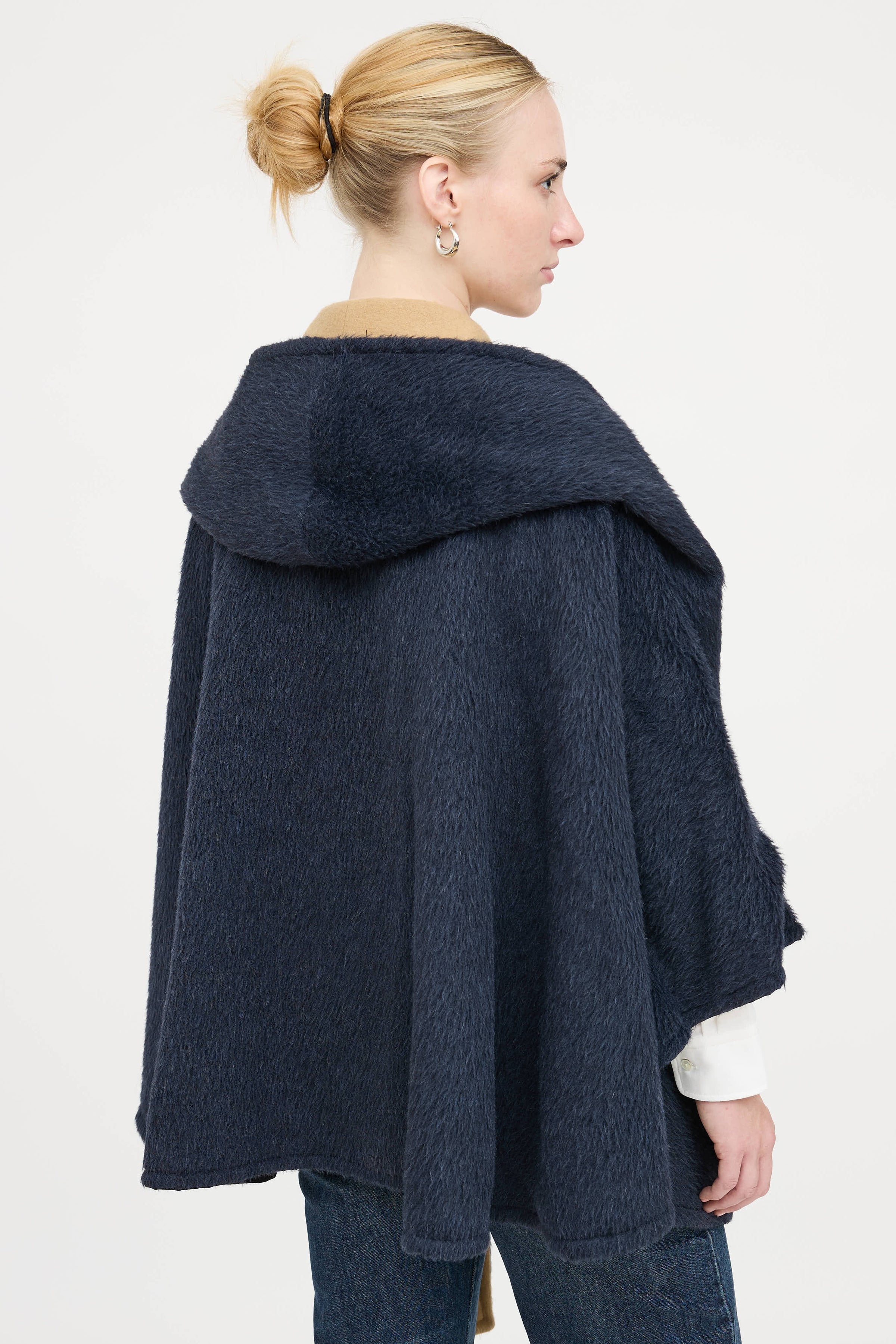 Pre-owned Lindsey Thornburg navy and brown long sleeve wool coat featuring attached hood with tie, singular toggle closure, patch pockets at front, and batwing sleeves. Lined.