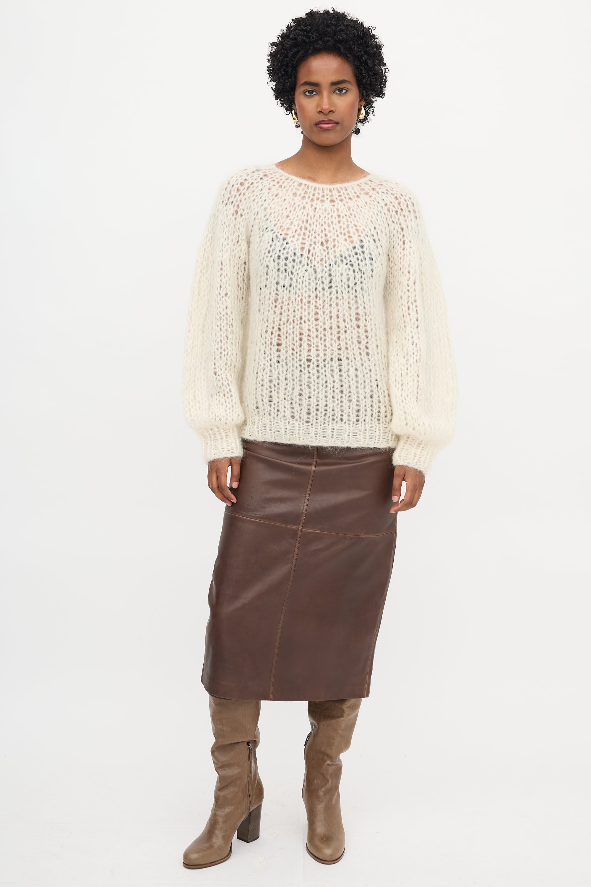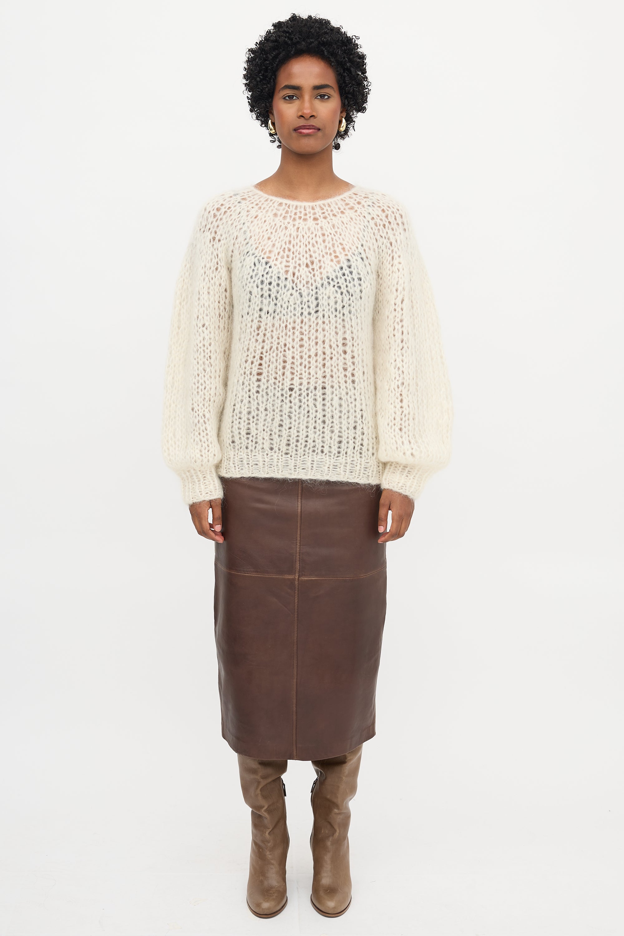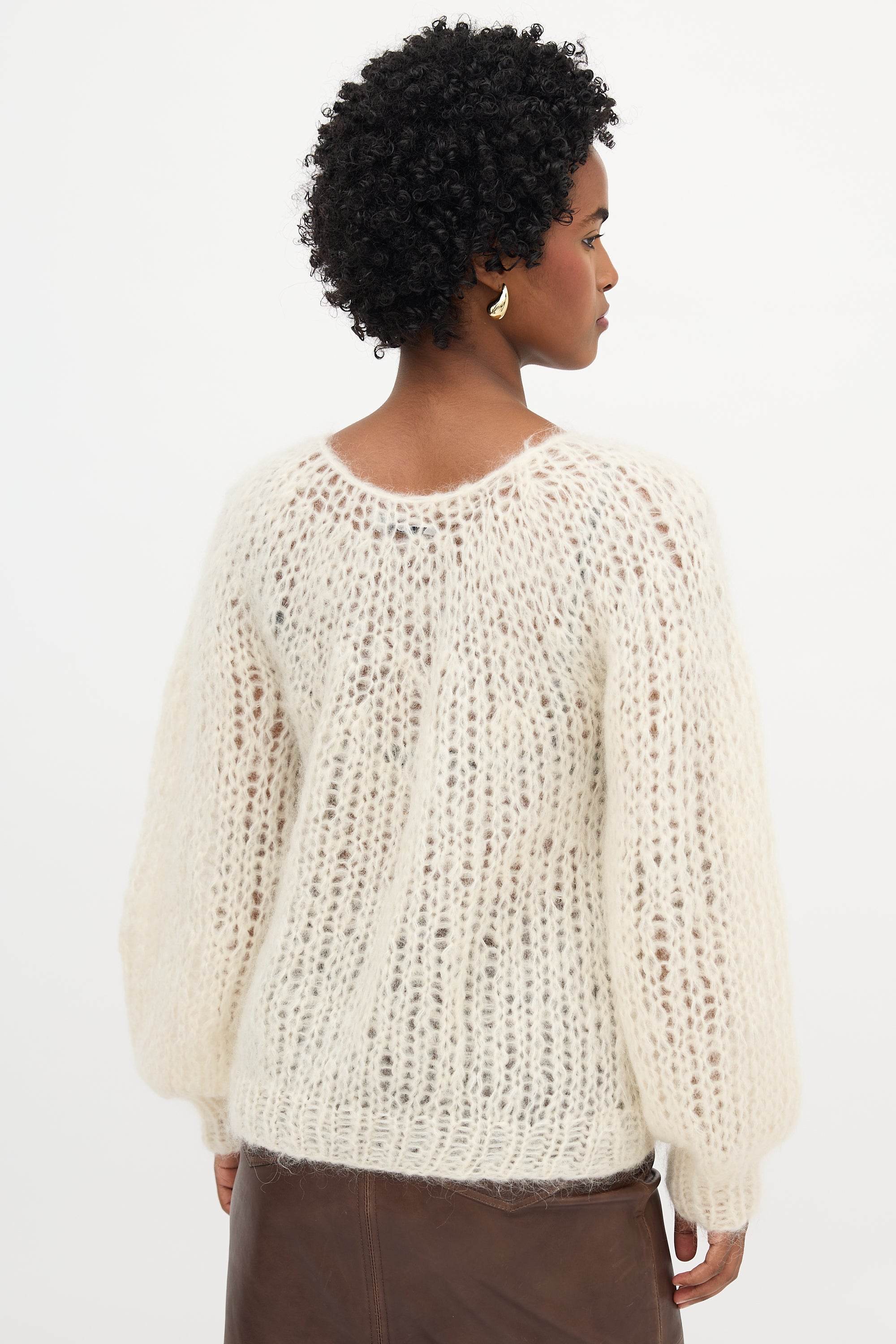 Pre-owned Maiami cream open knit mohair sweater featuring a round neckline, bishop sleeves, and ribbed hem and cuffs.