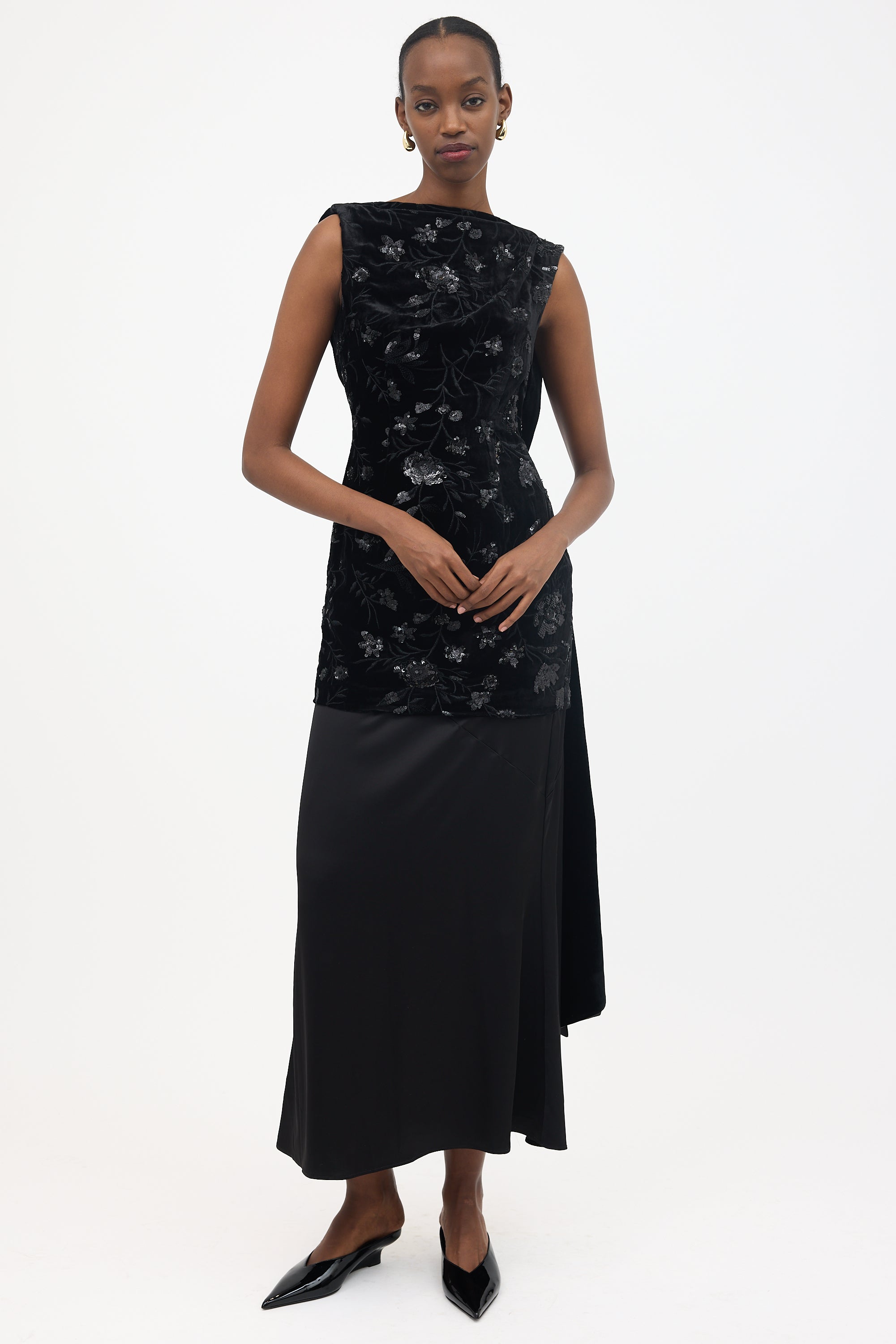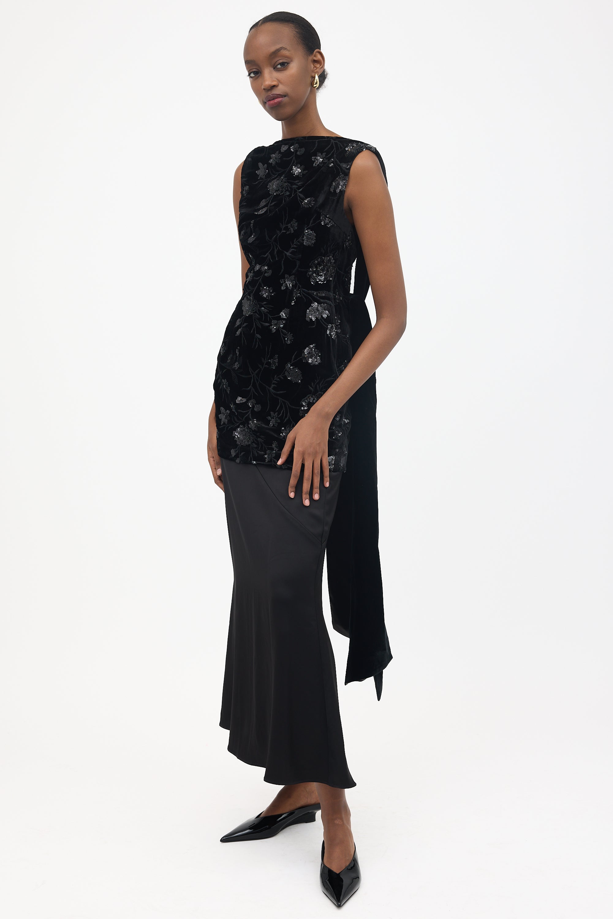 Sau Lee black velvet Winter mini dress featuring a bateau neckline, floral embroidery with sequin embellishments, side zip closure, and a open back with a satin and velvet sash. Lined.